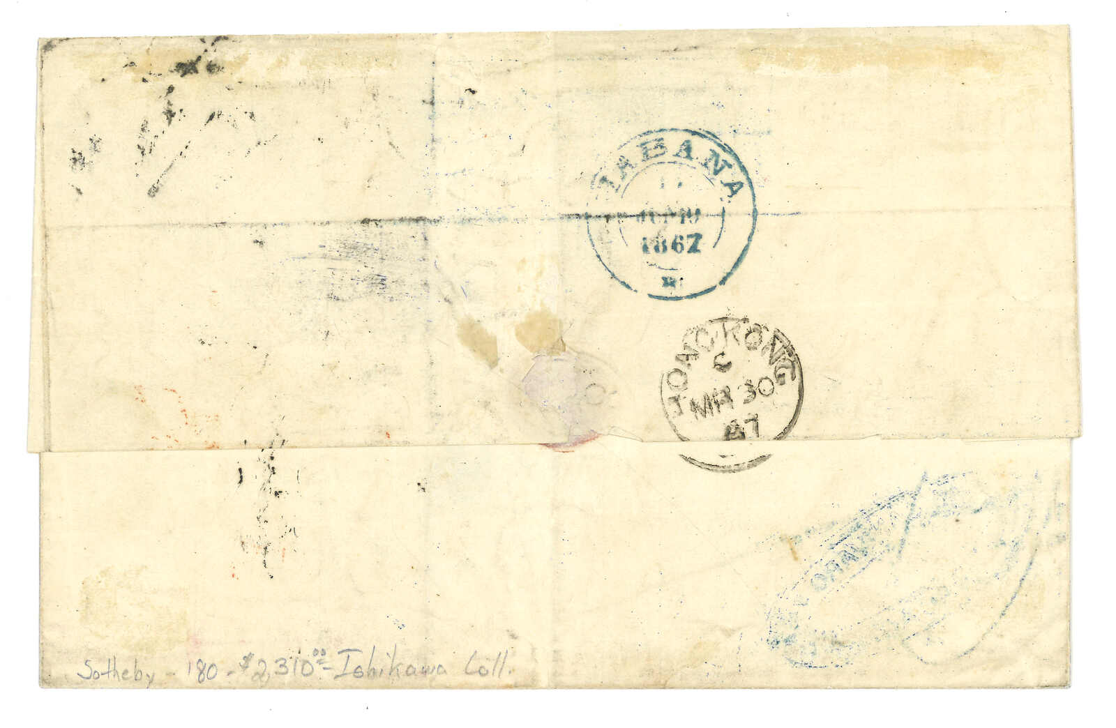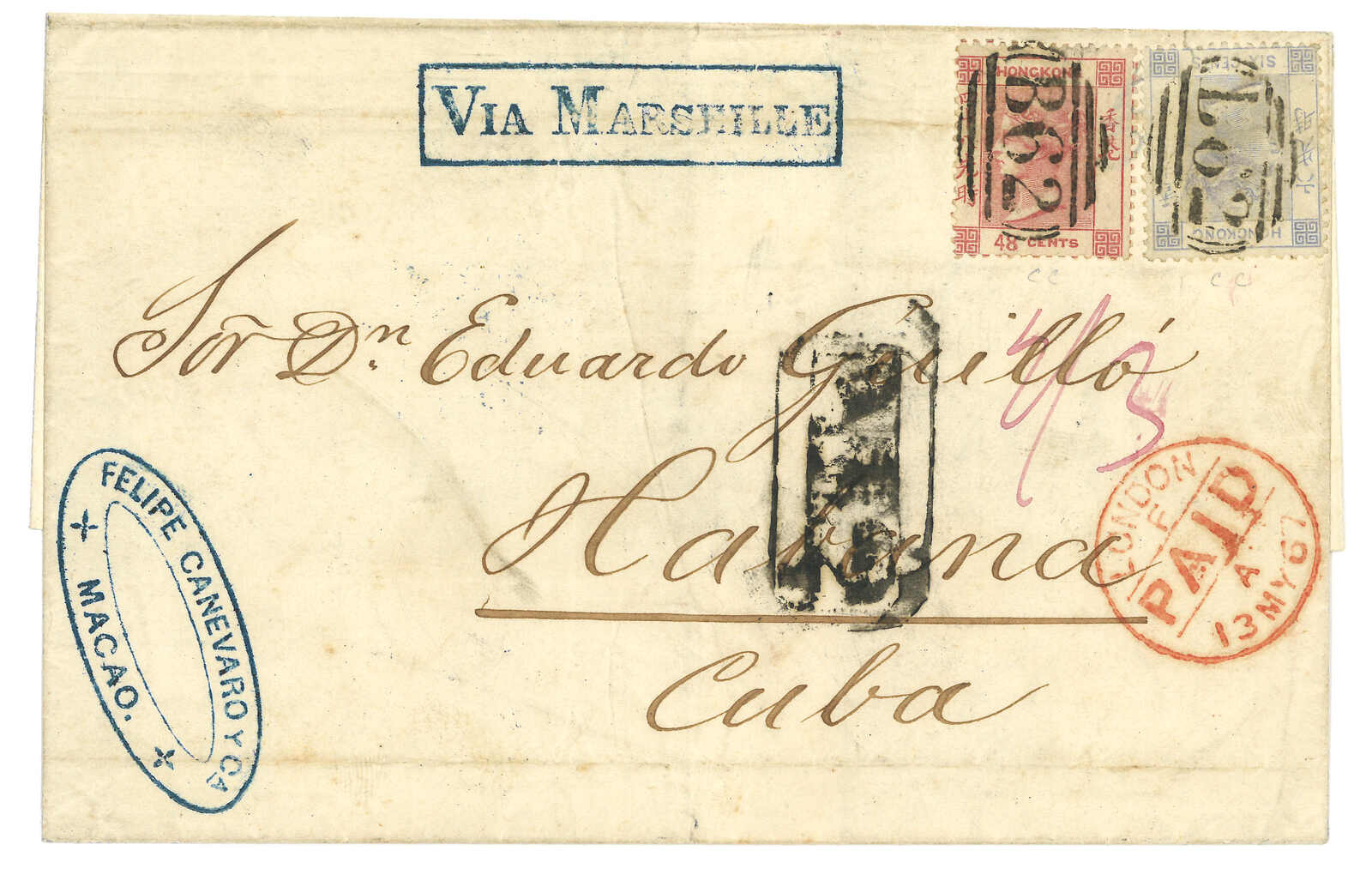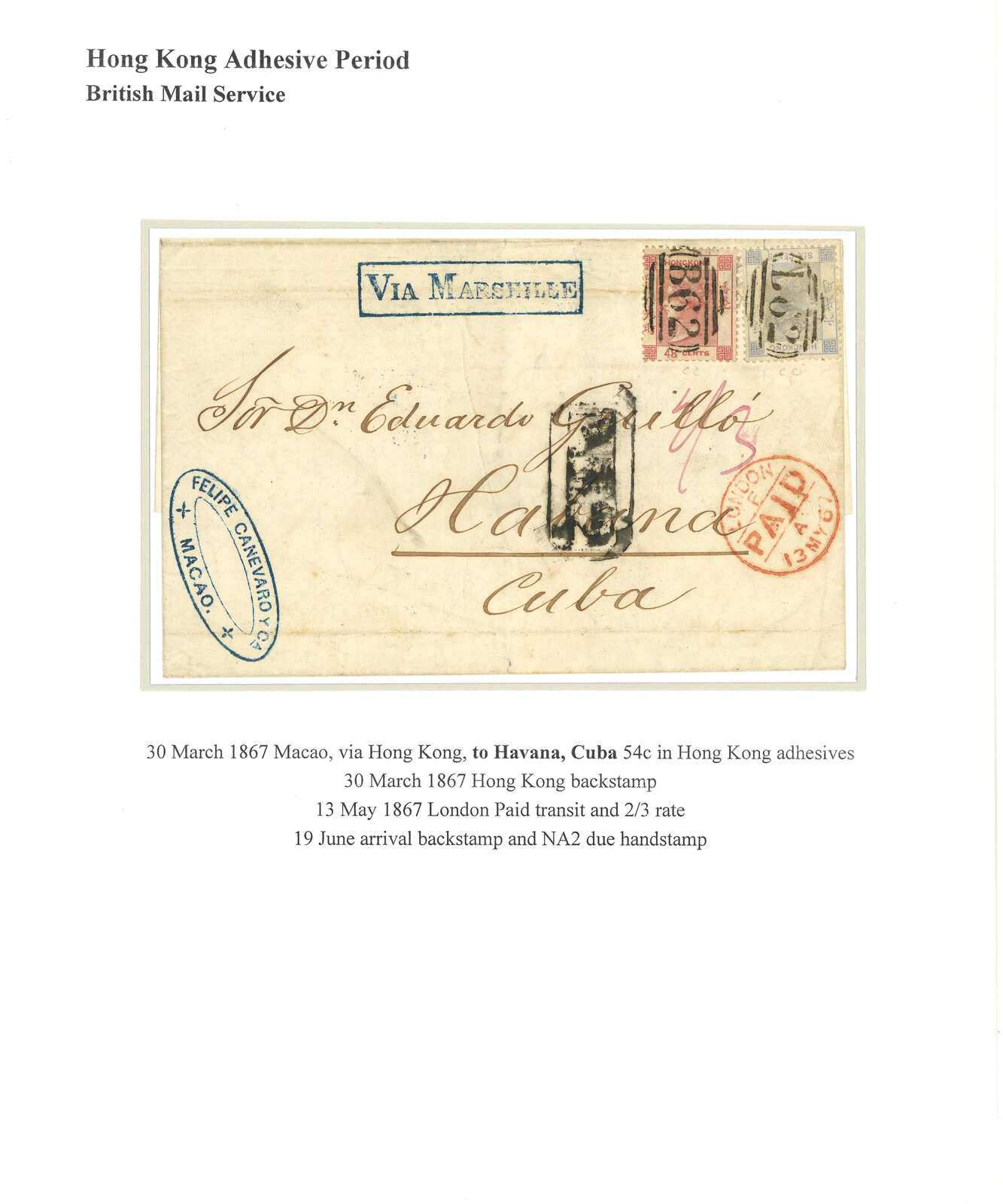 1867.3.30 澳門寄古巴。郵簡封套,鈐“Felipe Canevaro y Co / Macao”橢圓戳記。貼香港維多利亞女皇像48仙 + 6仙,銷B62殺手戳,另鈐香港日戳。5.13經倫敦。6.18抵夏灣拿。此為澳門寄古巴之孤例。F. Mayer舊藏。蔡昌道《1616至1891年郵票發行前郵政史調查與記錄》中第869號封。附原展頁。(Image 1) (Image 2) (Image 3)