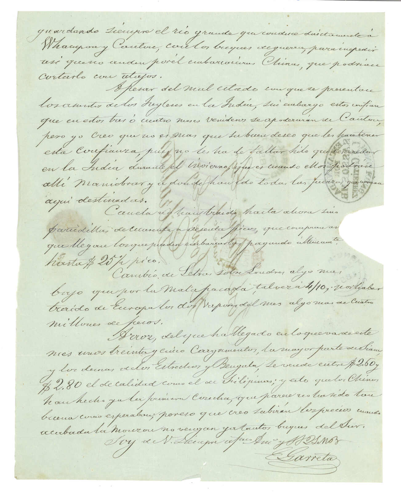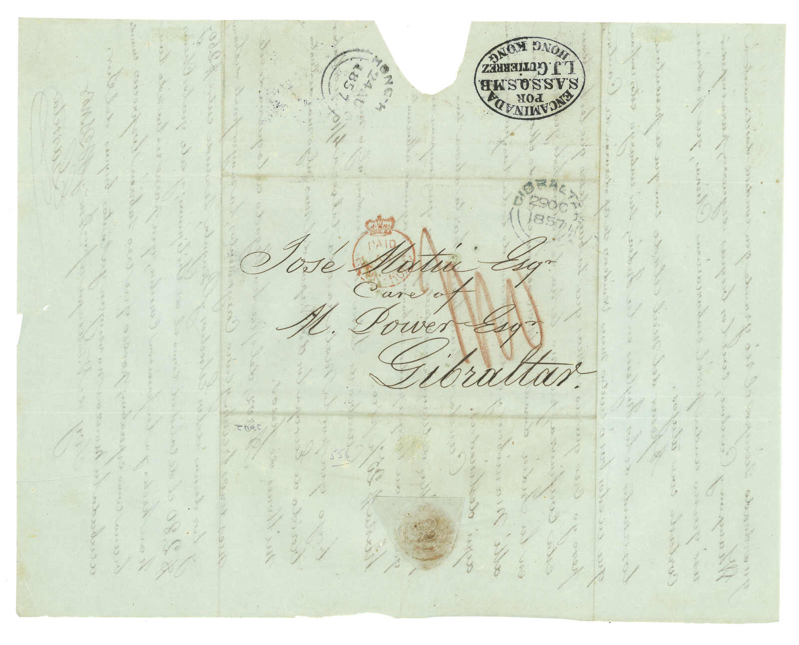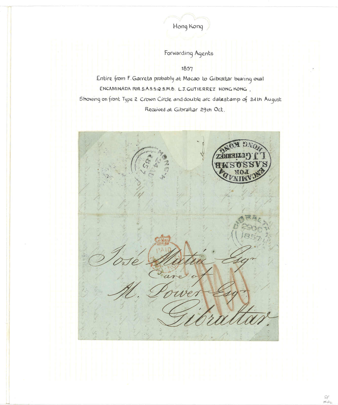 1857年澳門F. Garreta寄直布羅陀郵政代理Michael Power交Jose Matia。郵簡,鈐“Encaminada / por / S.A.S.S.Q.S.M./L/H/ Gutierrerez/Hong Kong”轉運代理戳記、“PAID AT HONG KONG”小皇冠圓戳及香港8.24雙弧日戳。“S.A.S.S.Q.S.M.”為西班牙語“閣下忠僕,僅吻貴手”之縮寫。這款轉運代理戳記珍罕少見。《1616年至1891年澳門郵票發前郵政史調查與紀錄》中第764件封。(Image 1) (Image 2) (Image 3) (Image 4)