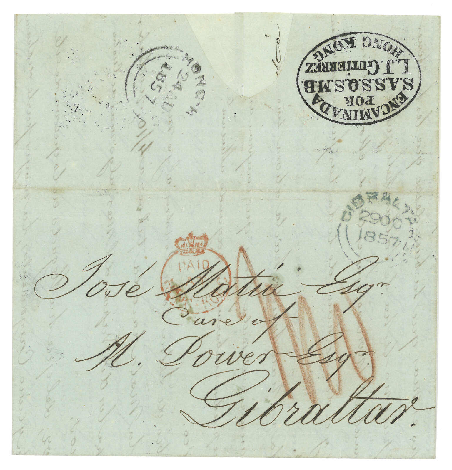 1770 cover image1857 F. Garreta, Macao to Jose Matia in Cadiz via forwading agent Michael Power in Gibraltar. Entire letter, applied with oval “Encaminada por SASSQSMB / LJ Gutierrex / Hong Kong”, crowned "PAID AT HONG KONG" circular mark and Hong Kong (24 Aug) double arc transit cds. Arrived Gibraltar (24 Aug). “S.A.S.S.Q.S.M.B” is the abbreviation for “Su Atento Seguro Servidor Que Su Mano Besa” (“Your faithfultrustworthy servant who kisses your hand” in English). Extraordingary forwarding agent seal. No. 764 cover in "A Survey and Recorded Postal History of Macau 1616-1891" by Choi Cheong Too.