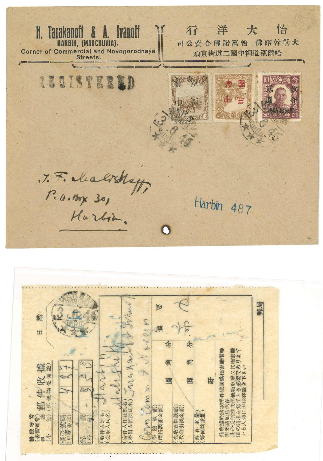 3277 cover image1946 (3 Jun) N. Tarakanoff & A Ivanoff Co cover, used in Harbin local, f.w. Manchukuo 20f and 30f Harbin ovpt. "Republica of China" (20f with inverted ovpt variety) + Sin Min Print SYS surch $2 Limited For Use in Northeast, tied by Harbin English cds. Plus a receipt. Harbin was liberated on 28 Apr but this cover still using ovpt. ROC stamps.