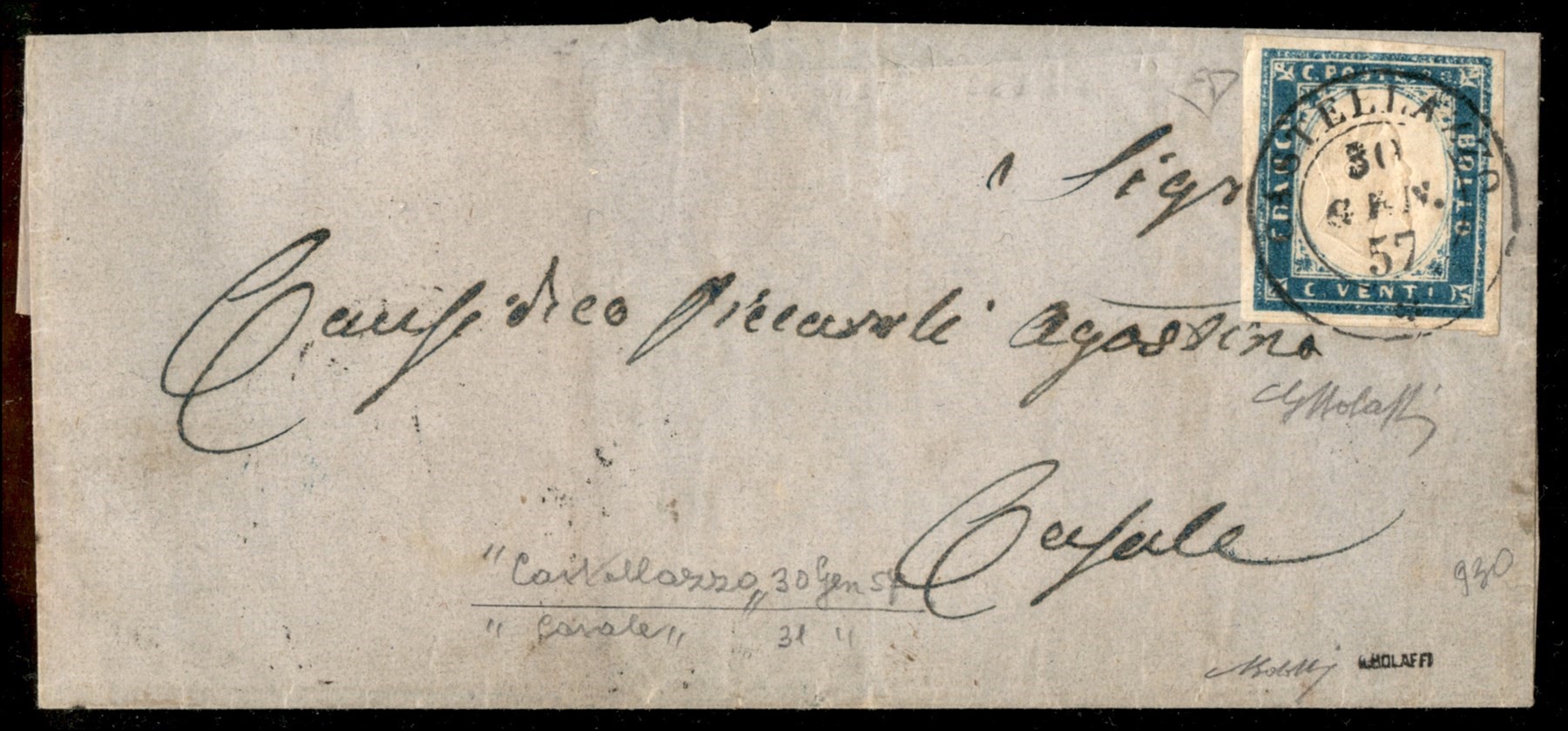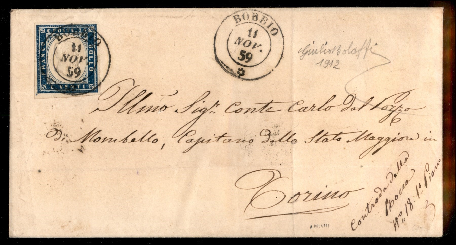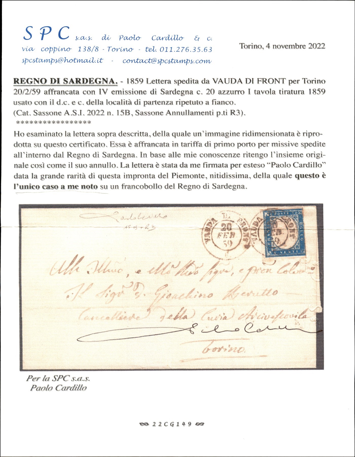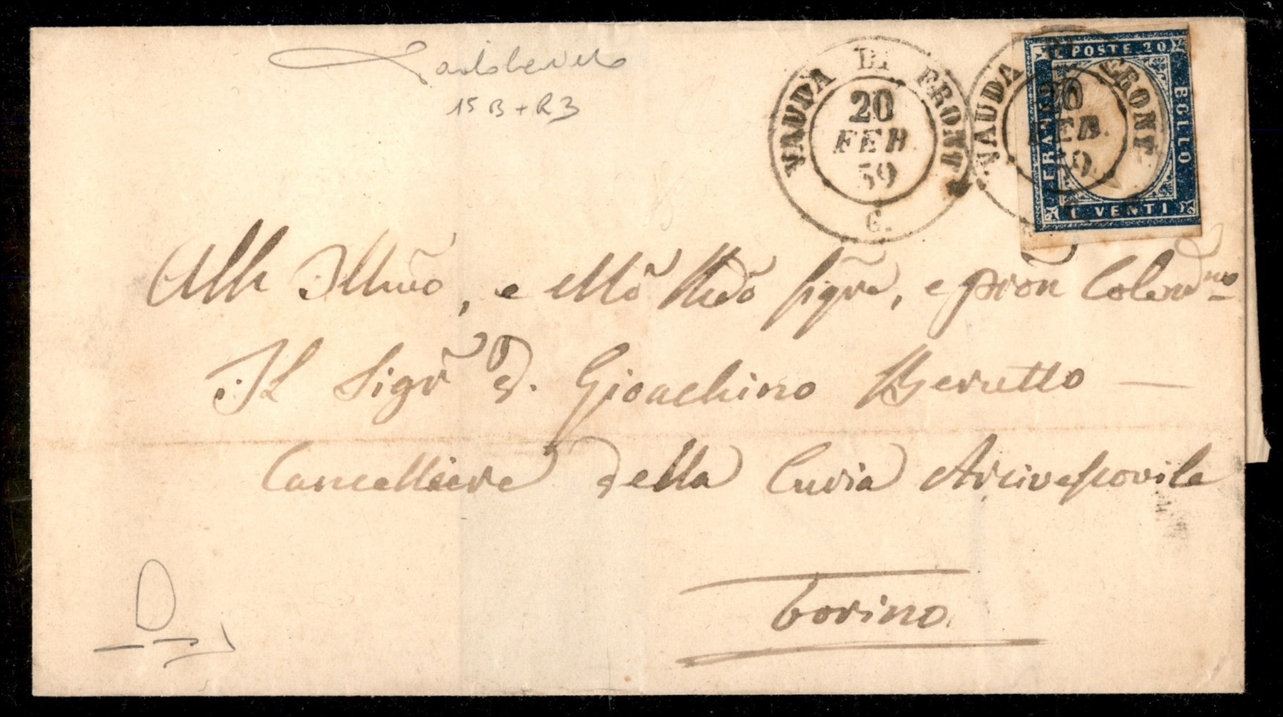 Lettera da VAUDA DI FRONT (Sass. R3) a Torino 20 febbraio 1859 con 20 cent. azzurro grigiastro (Sass. 15A) bene marginato cert. Manzoni (Image 1)