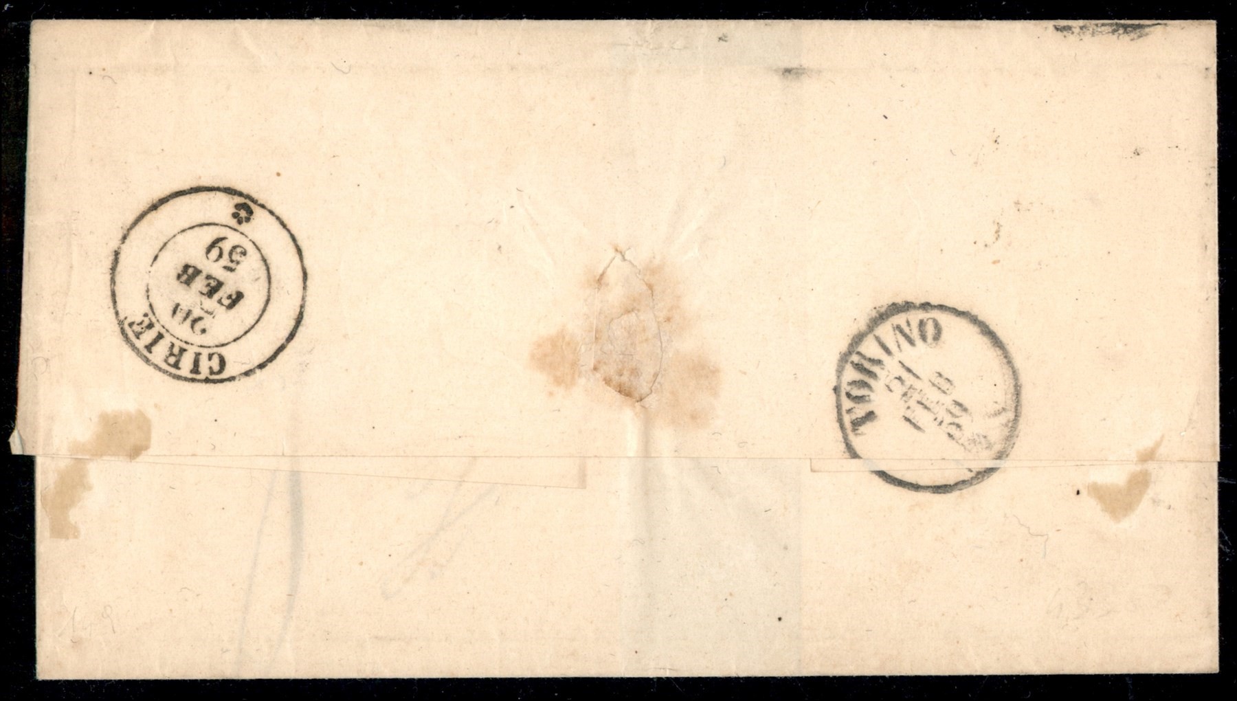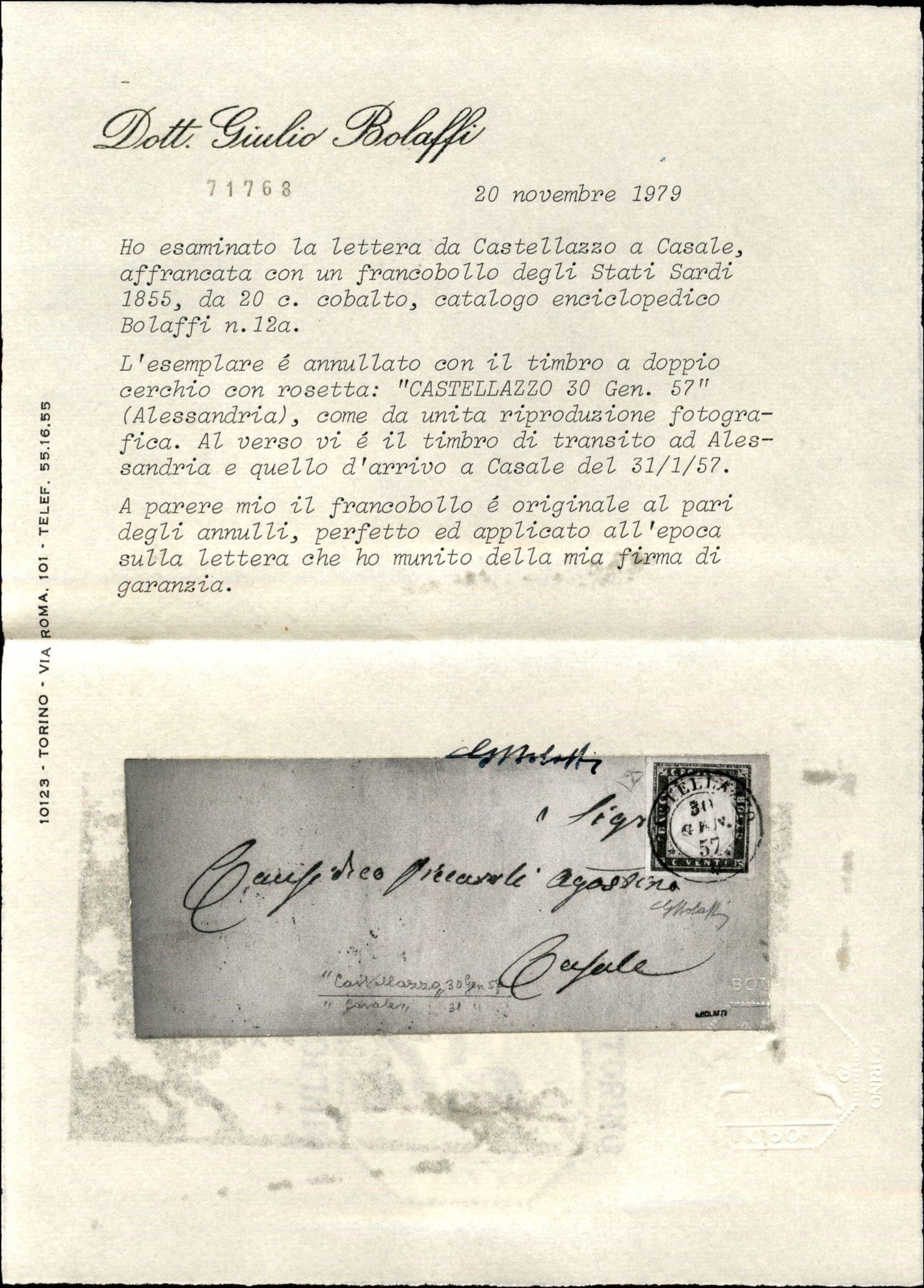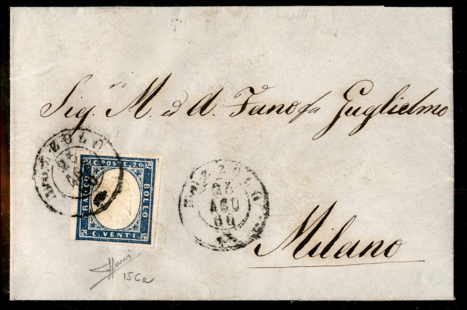 Lettera da VAUDA DI FRONT (Sass. R3) a Torino 20 febbraio 1859 con 20 cent. azzurro grigiastro (Sass. 15A) bene marginato cert. Manzoni (Image 1)