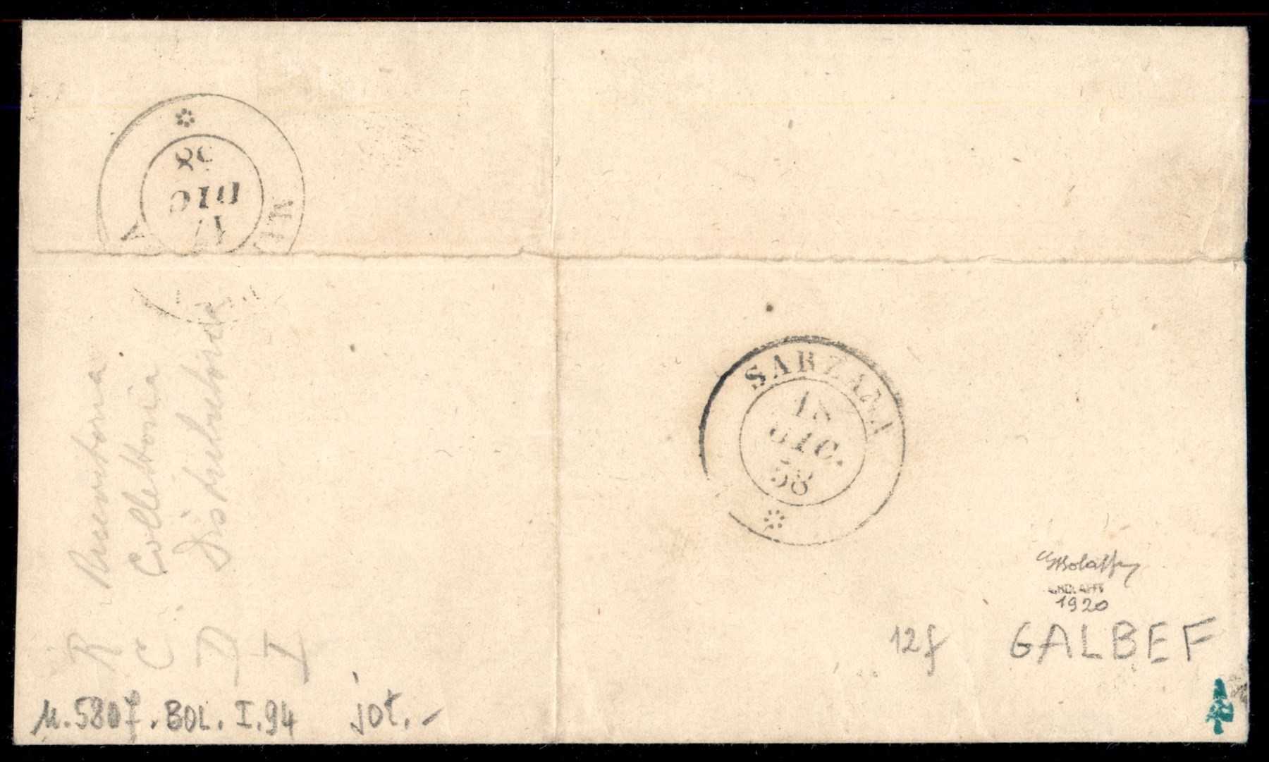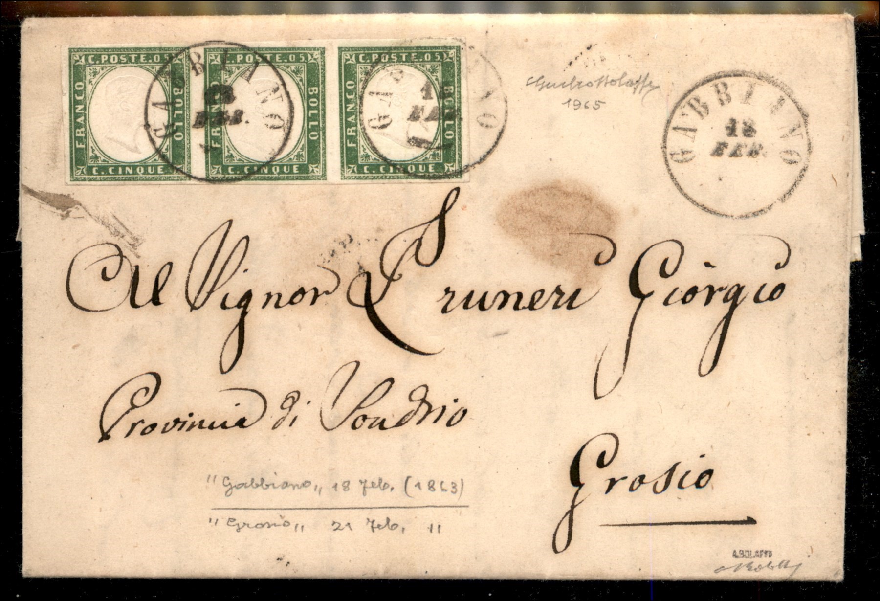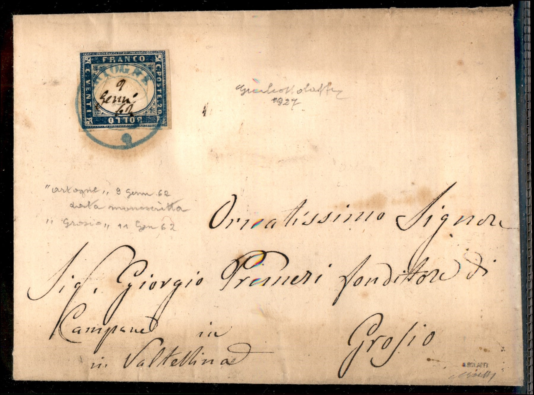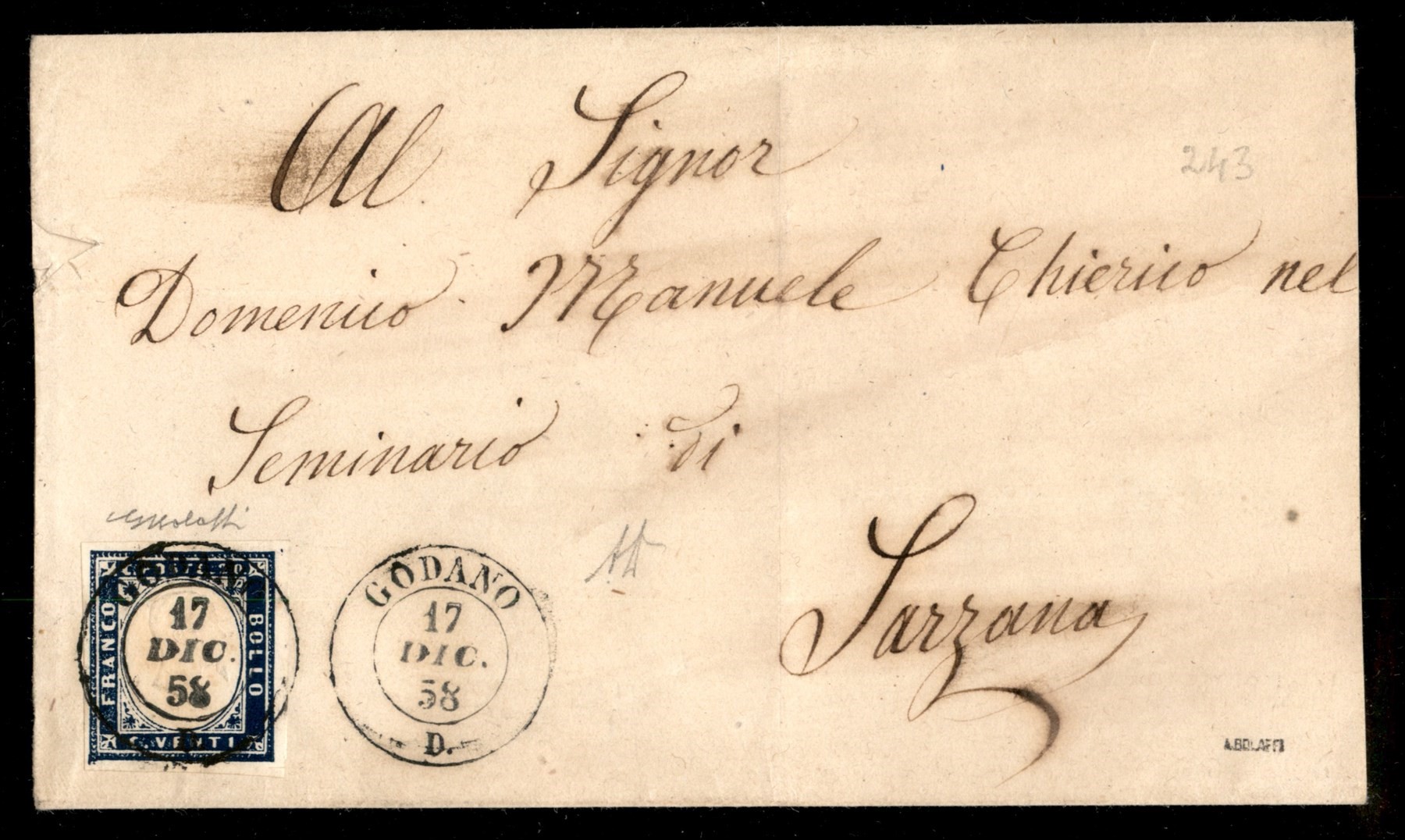 Lettera da VAUDA DI FRONT (Sass. R3) a Torino 20 febbraio 1859 con 20 cent. azzurro grigiastro (Sass. 15A) bene marginato cert. Manzoni (Image 1)