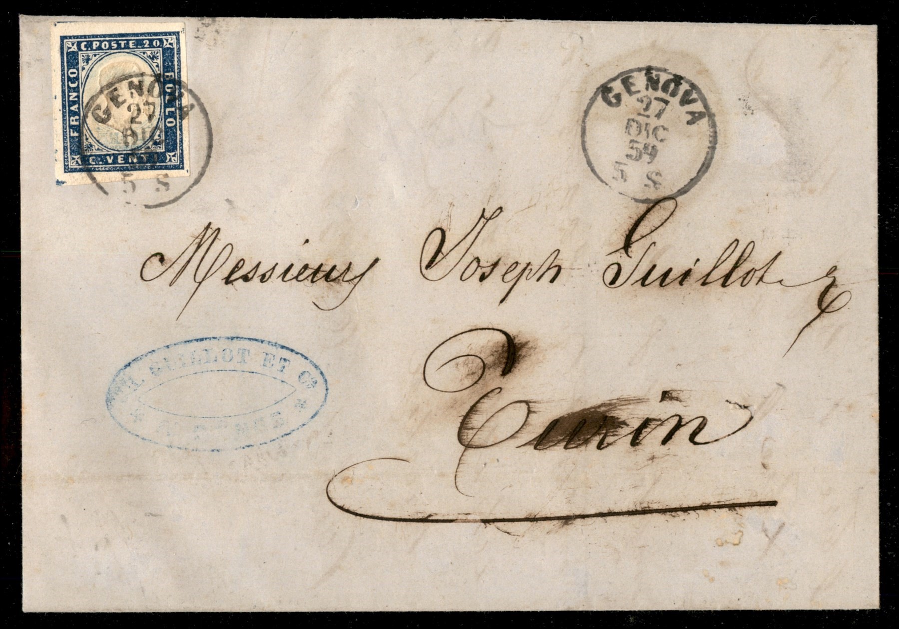 Lettera da Genova 27.12.59 affrancata con 20 cent (15Aa) ottimamente marginato - doppia stampa del cartiglio inferiore dovuta a cattiva pulizia del controstampo usato per l'impressione dell'effigie - non consueta negli