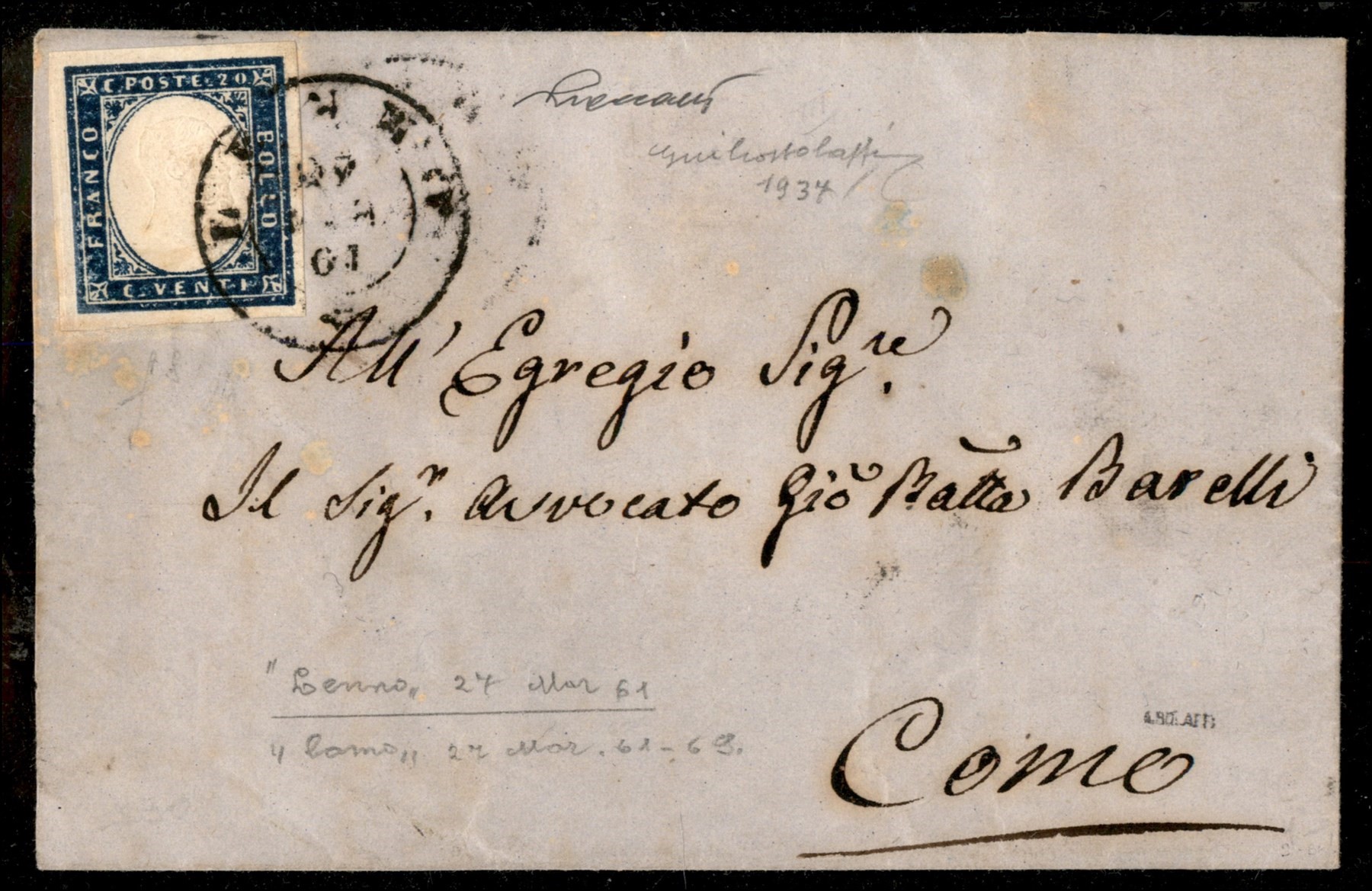 Da Lenno a Como il 27 marzo 1861 con 20 cent. (Sass. 15Ca) annullato con doppio cerchio (p. 8) (Image 1)