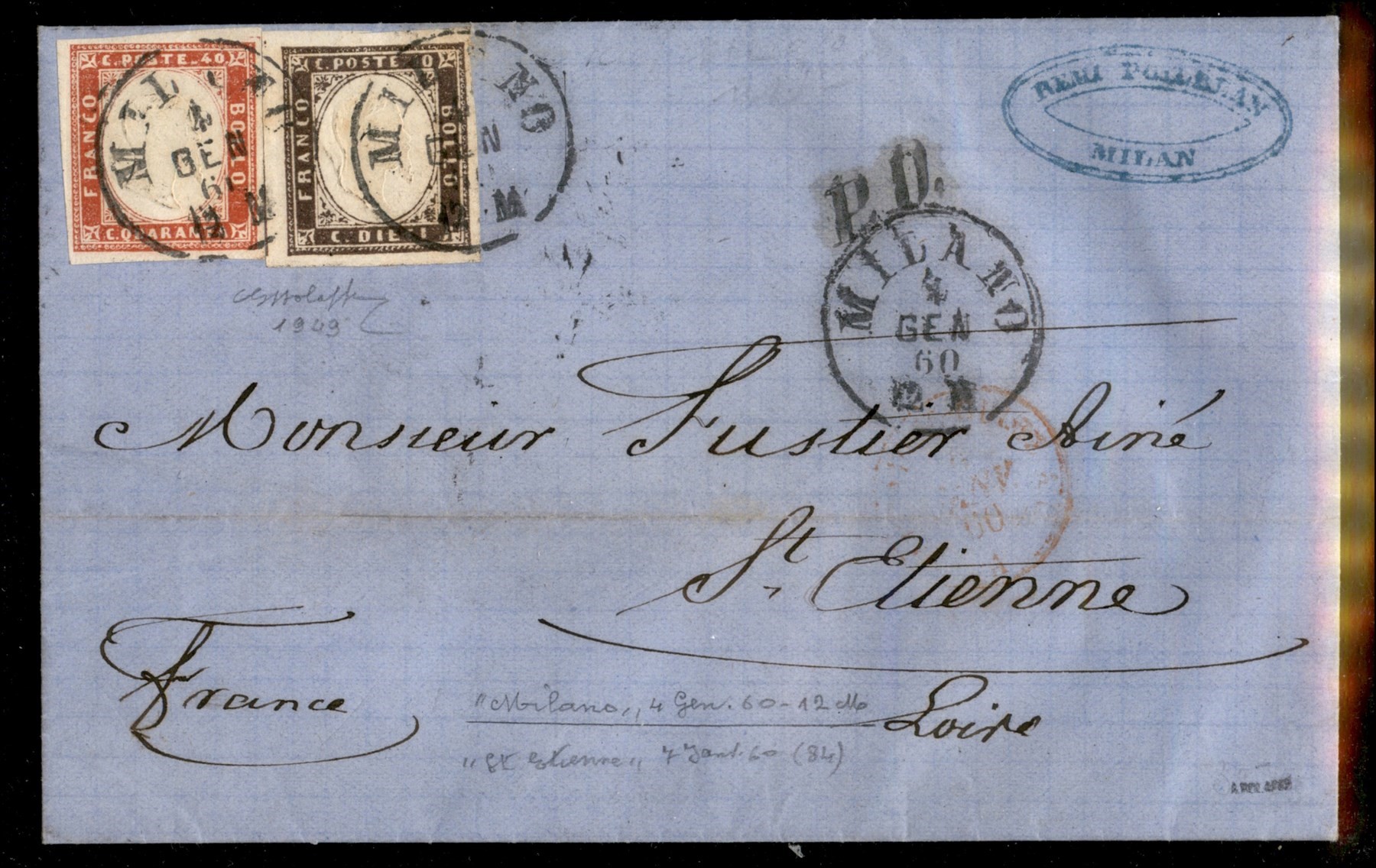 10 cent bruno cioccolato scuro + 40 cent rosso (14Af + 16C) su lettera da Milano a St. Etienne del 4.1.60 - splendido insieme - Bolaffi (Image 1)