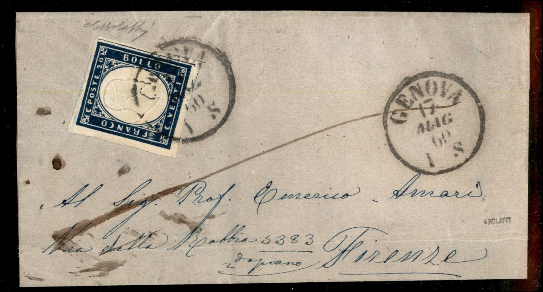 splendido esemplare del 20 cent azzurro scurissimo (15C) con filetto di riquadro a destra su letterina da Genova a Firenze del 17.5.60 - ex coll. Provera - Bolaffi (Image 1)