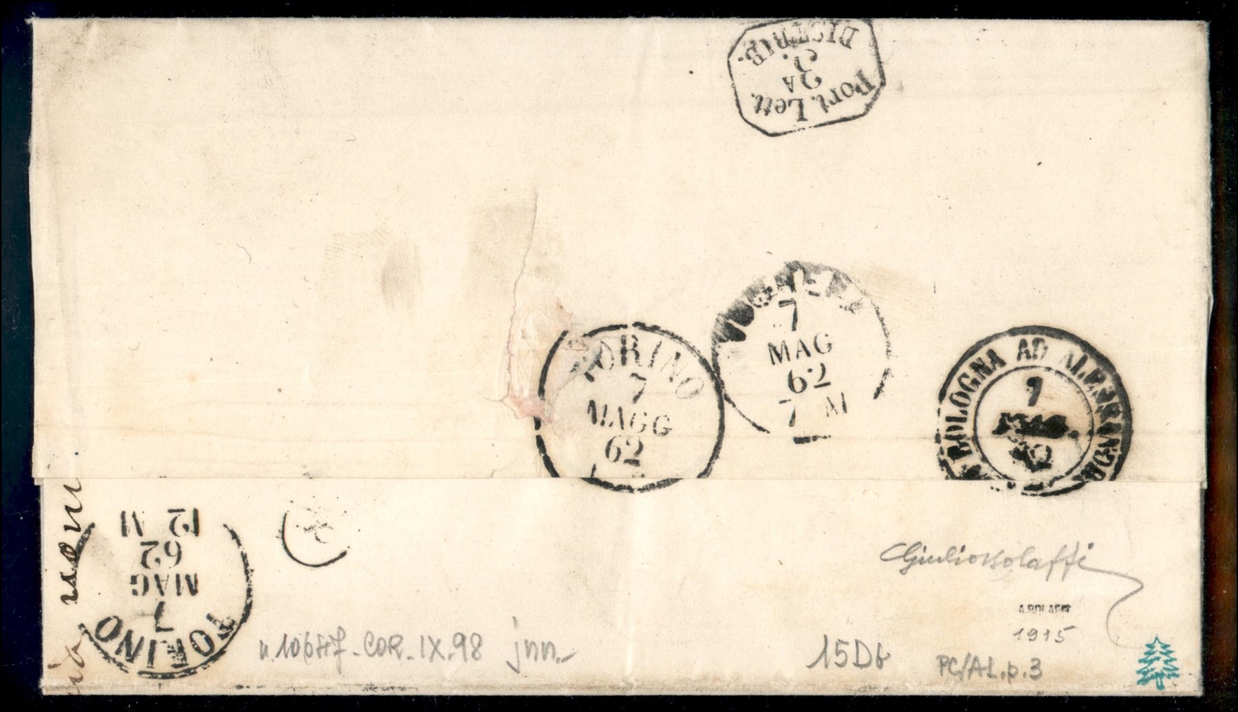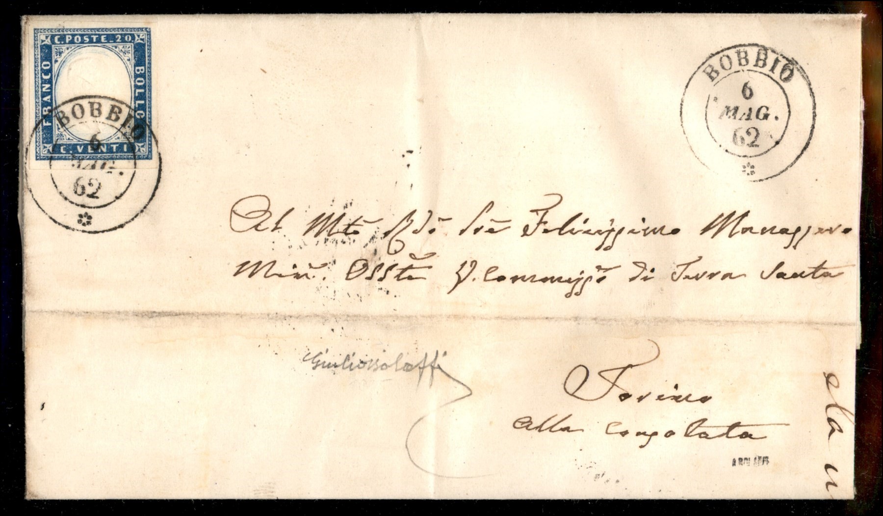 20 cent celeste (15Da) su lettera da Bobbio a Torino del 6.5.62 - molto bella - ex coll. Provera - Giulio Bolaffi (Image 1)