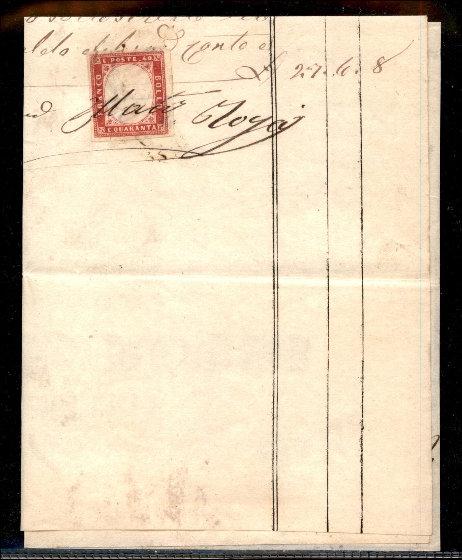 Esemplare del 40 cent rosa carminio lillaceo (16Eb) usato fiscalmente su ricevuta - Firenze 7.5.60 (Image 1)