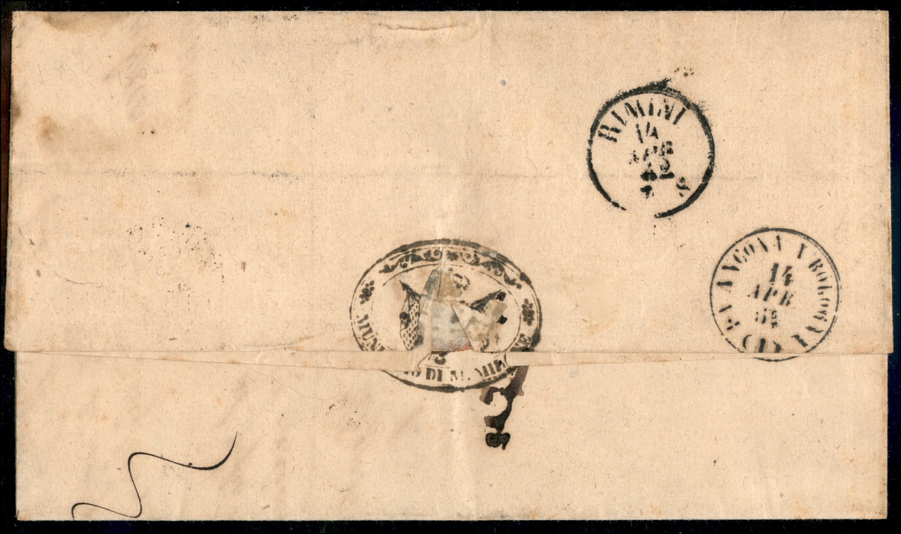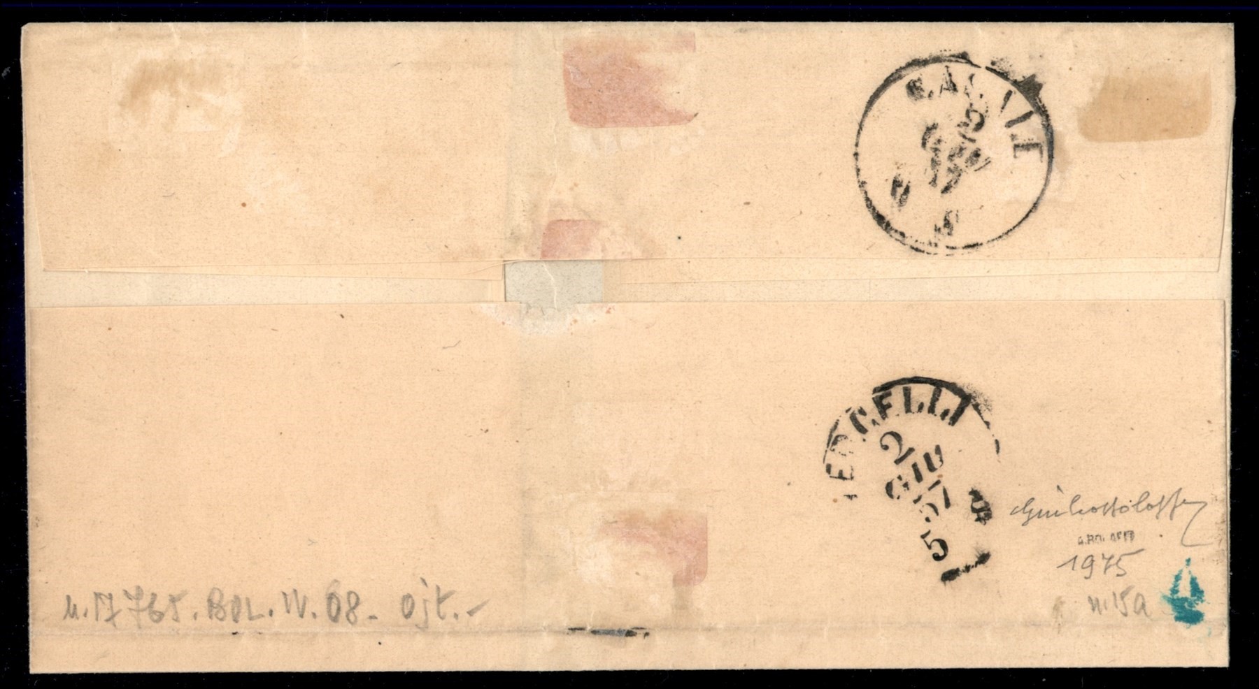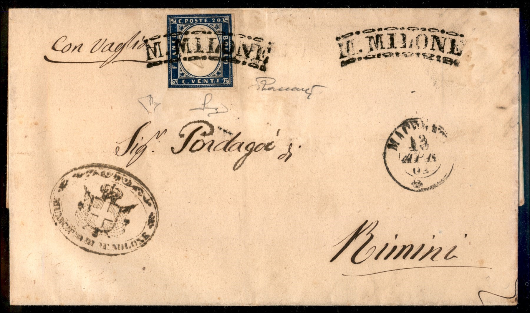 Lettera da Monte Milone (p. R1) a Rimini 13.4.61 affrancata con 20 cent. azzurro oltremare II tav. (Sass. 15Dc) – Molto rara e SPL Cert. (Image 1)