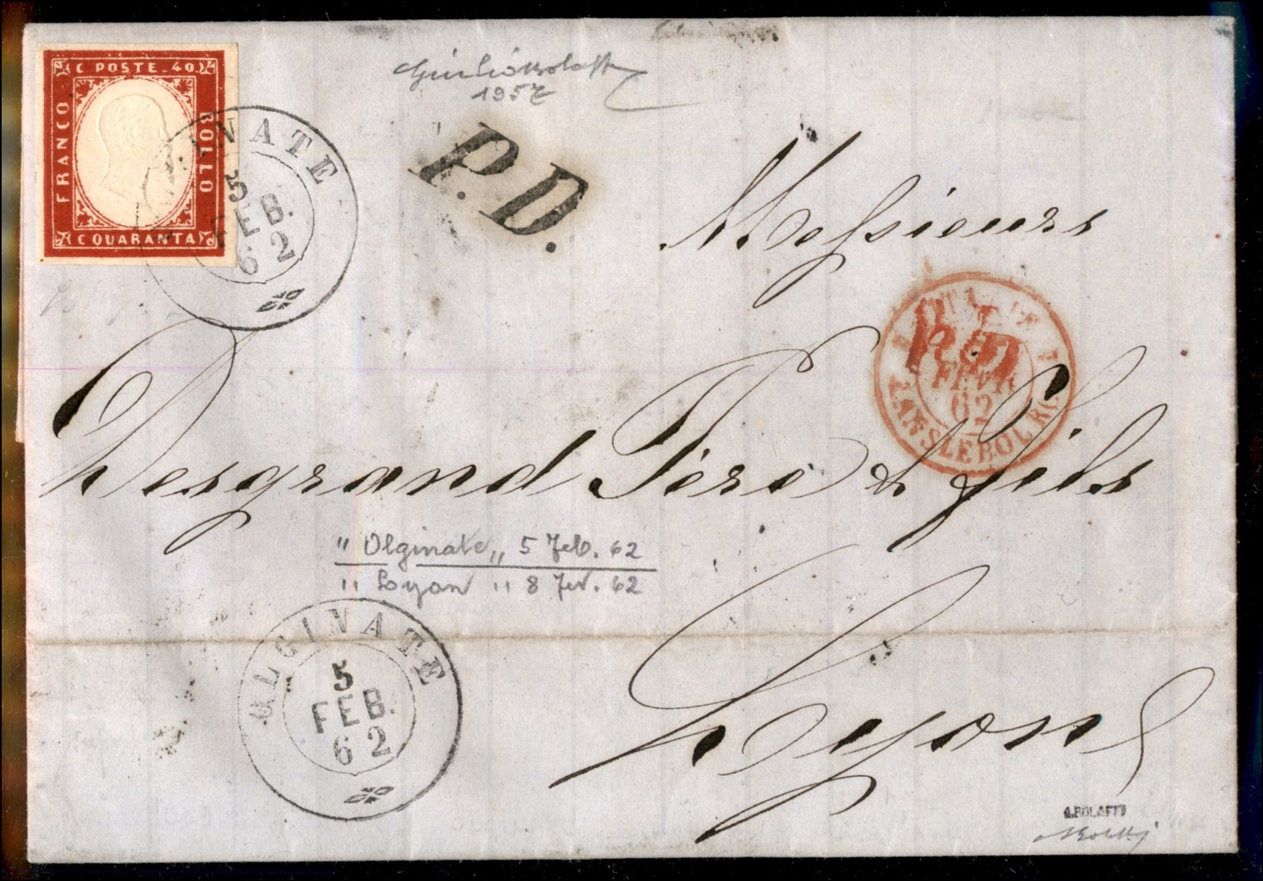 Lettera affrancata con 40 cent rosa carminio (16E) da Olgiate a Lione del 5.2.62 - bell'insieme molto fresco - Giulio Bolaffi (Image
