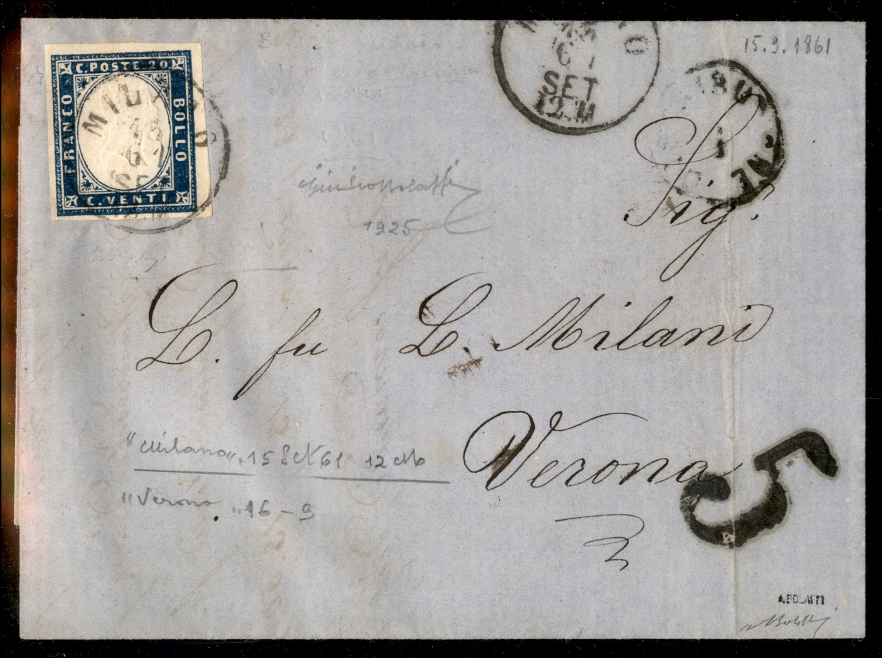 Bell'esemplare del 20 cent azzurro (15C) su lettera da Milano a Verona del 15.9.61 - molto bella - Giulio Bolaffi (Image 1)