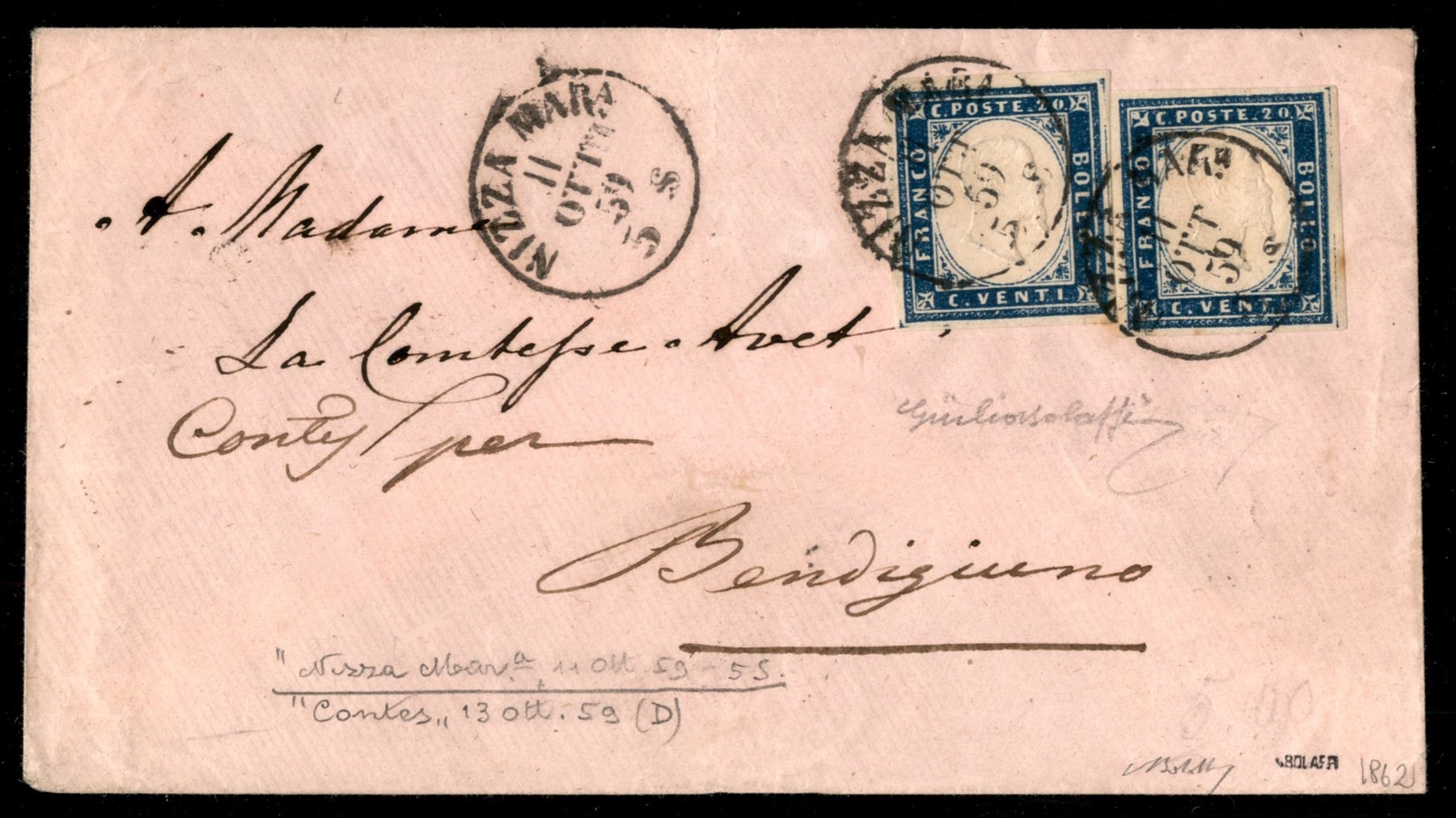 Due esemplari del 20 cent azzurro scuro (15B) su bella bustina di colore rosa da Nizza Marittima a Contes del 11.10.59 - fresca e molto bella - Giulio Bolaffi (Image 1)