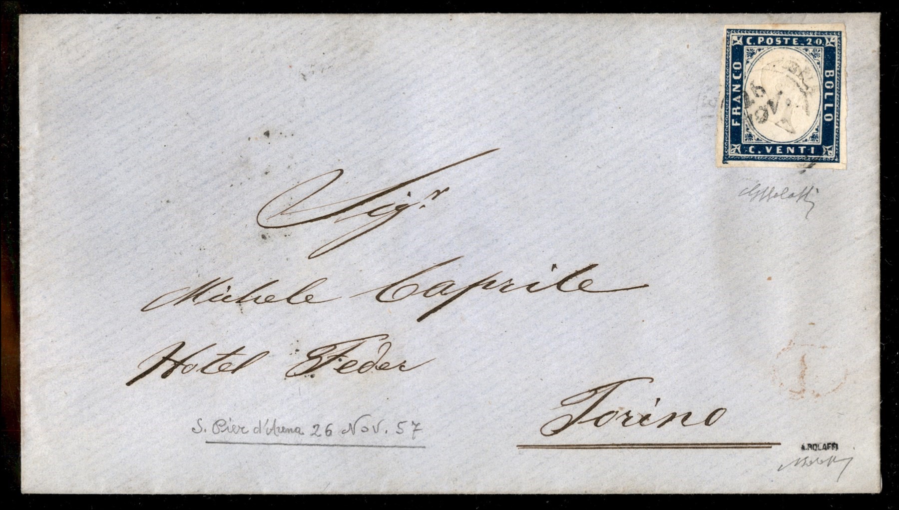 Bell'esemplare del 20 cent azzurro grigiastro (15A) su bustina da S. Pier d'Arena a Torino del 26.11.57 - molto bella - G. Bolaffi (Image 1)