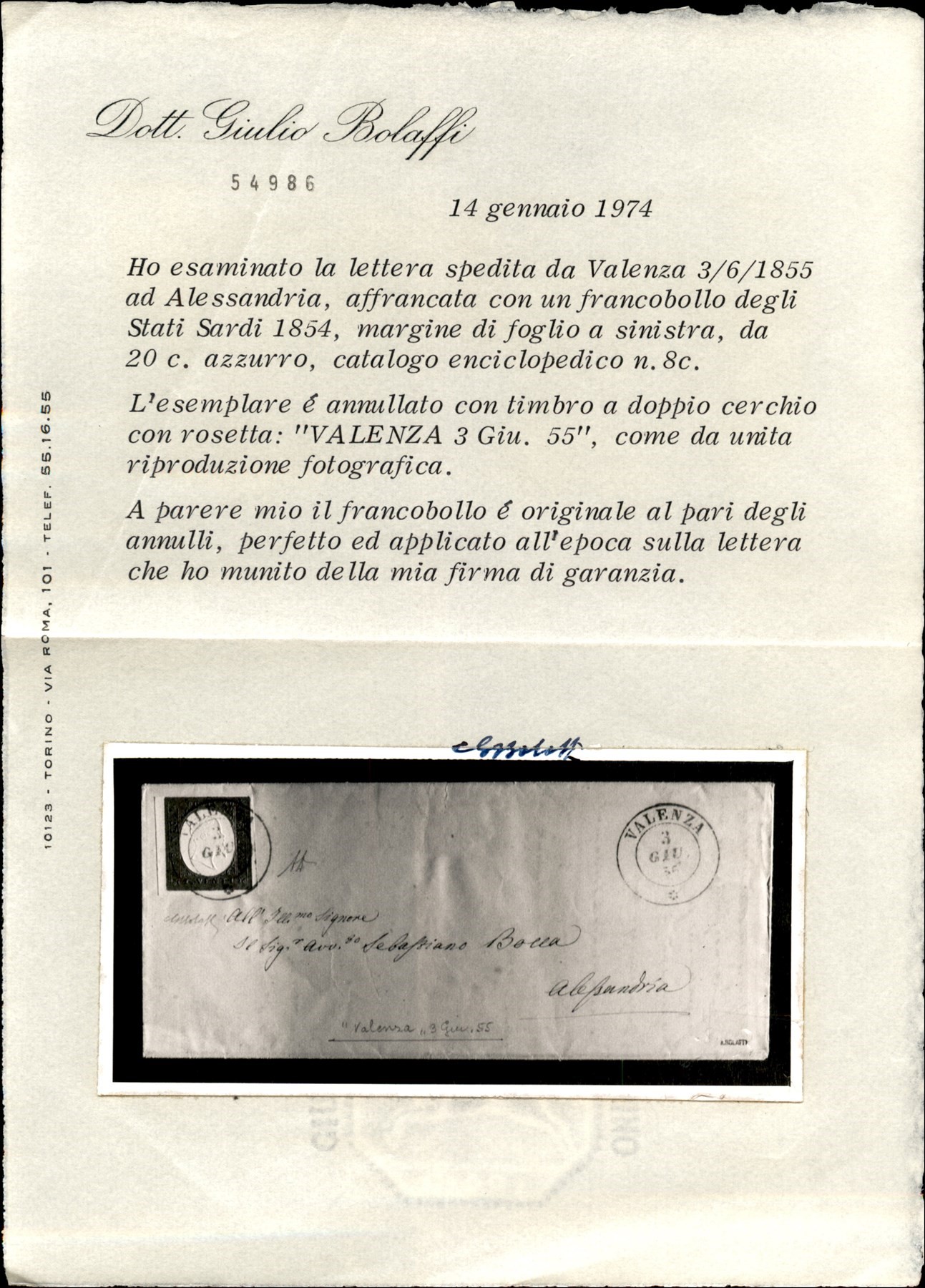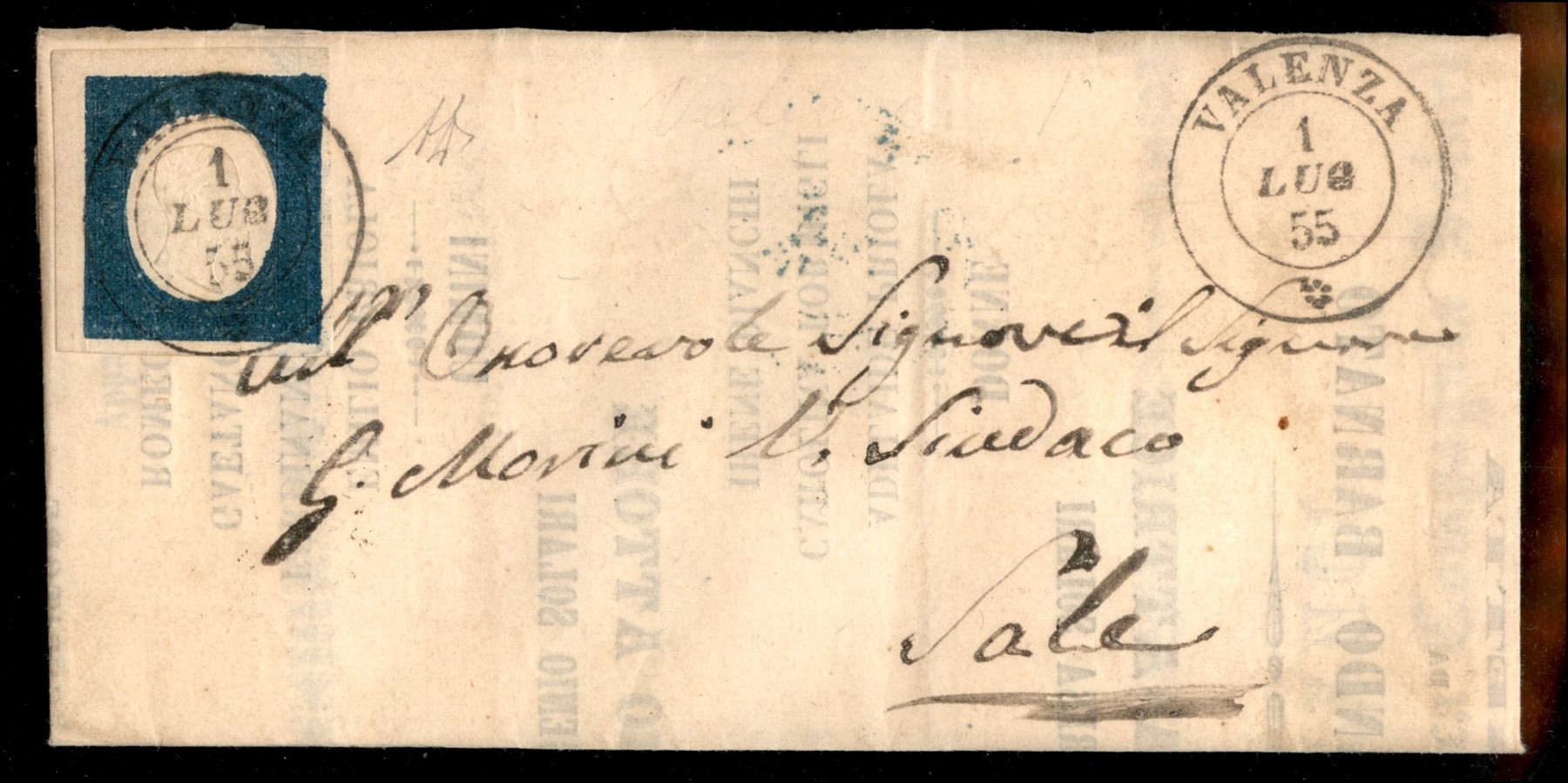 Fresco esemplare angolo di foglio del 20 cent azzurro (8) su letterina in parte stampata da Valenza (P.ti 7) a Sale del 1.7.55 - molto bella - cert. G. Bolaffi (Image 1)