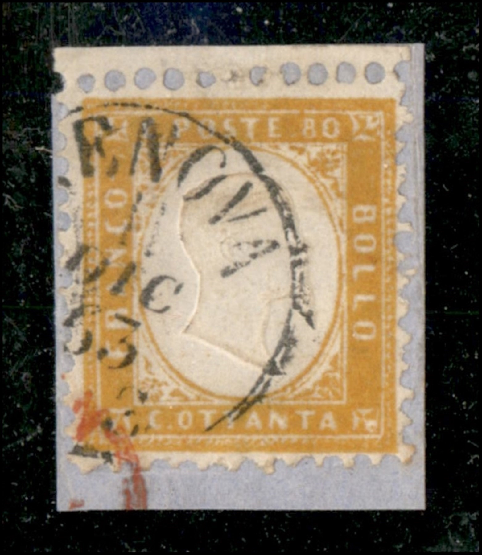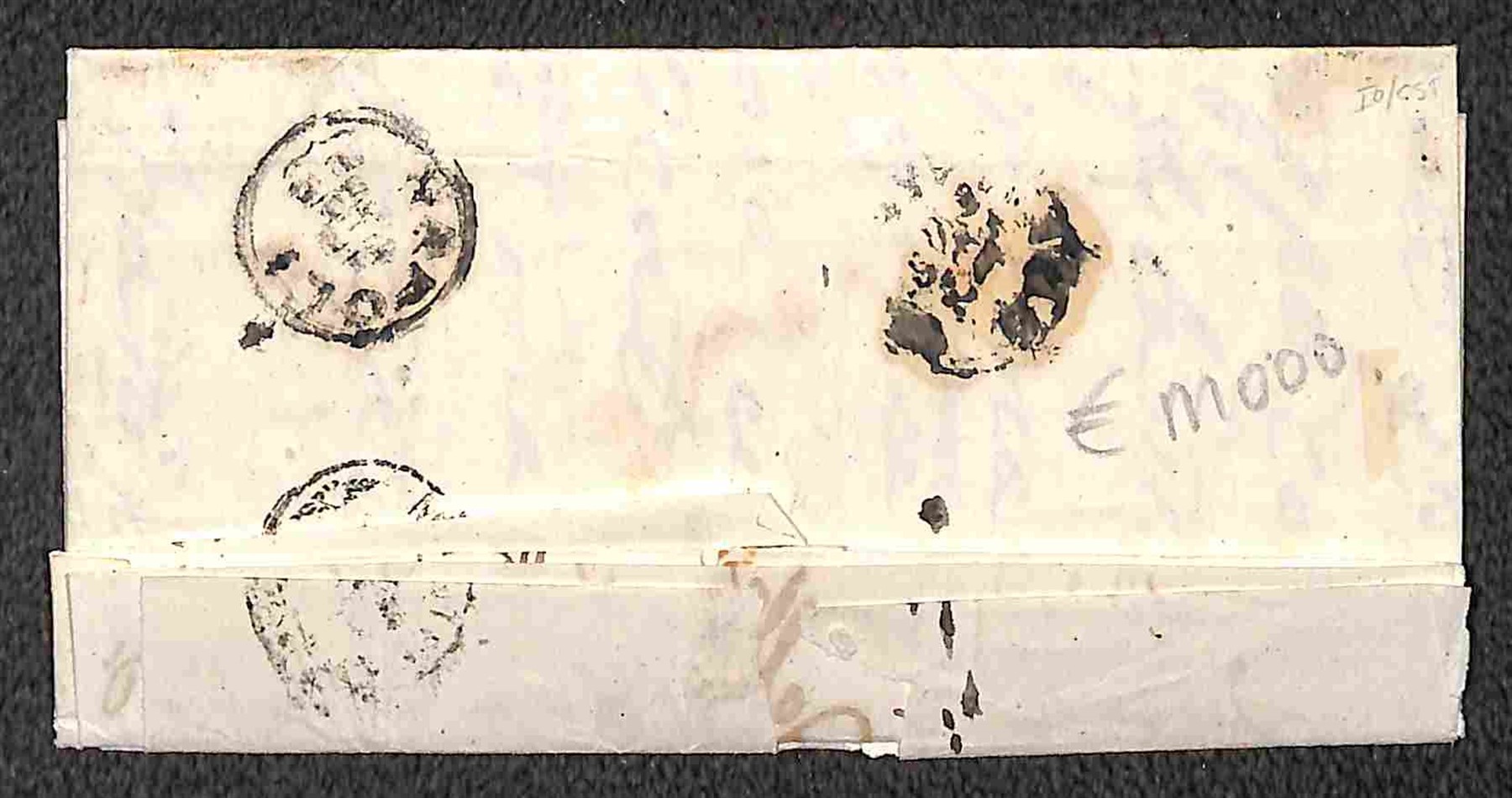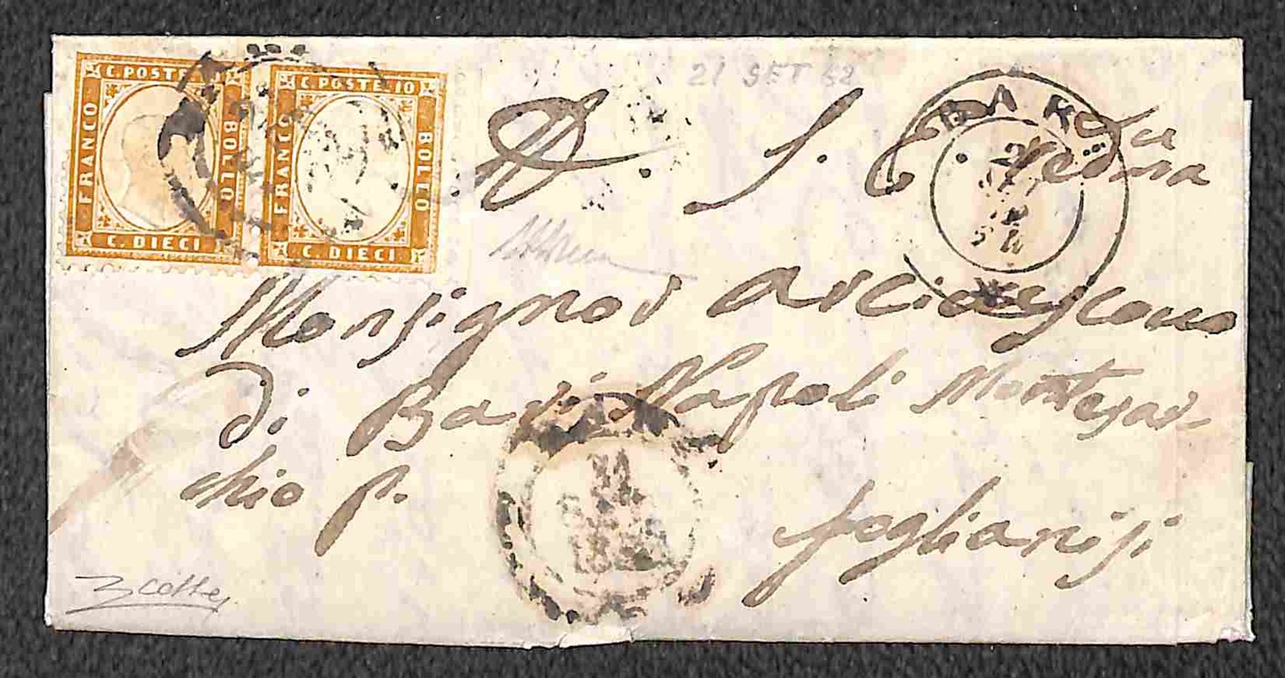 Lettera da Bari (p. 8) per Foglianisi il 21 settembre 1862 con 10 cent. dentellato coppia bordo di foglio a destra (Sass. 1) Primissimi giorni d'uso dei francobolli d'Italia nelle Province napoletane che anticipa la data