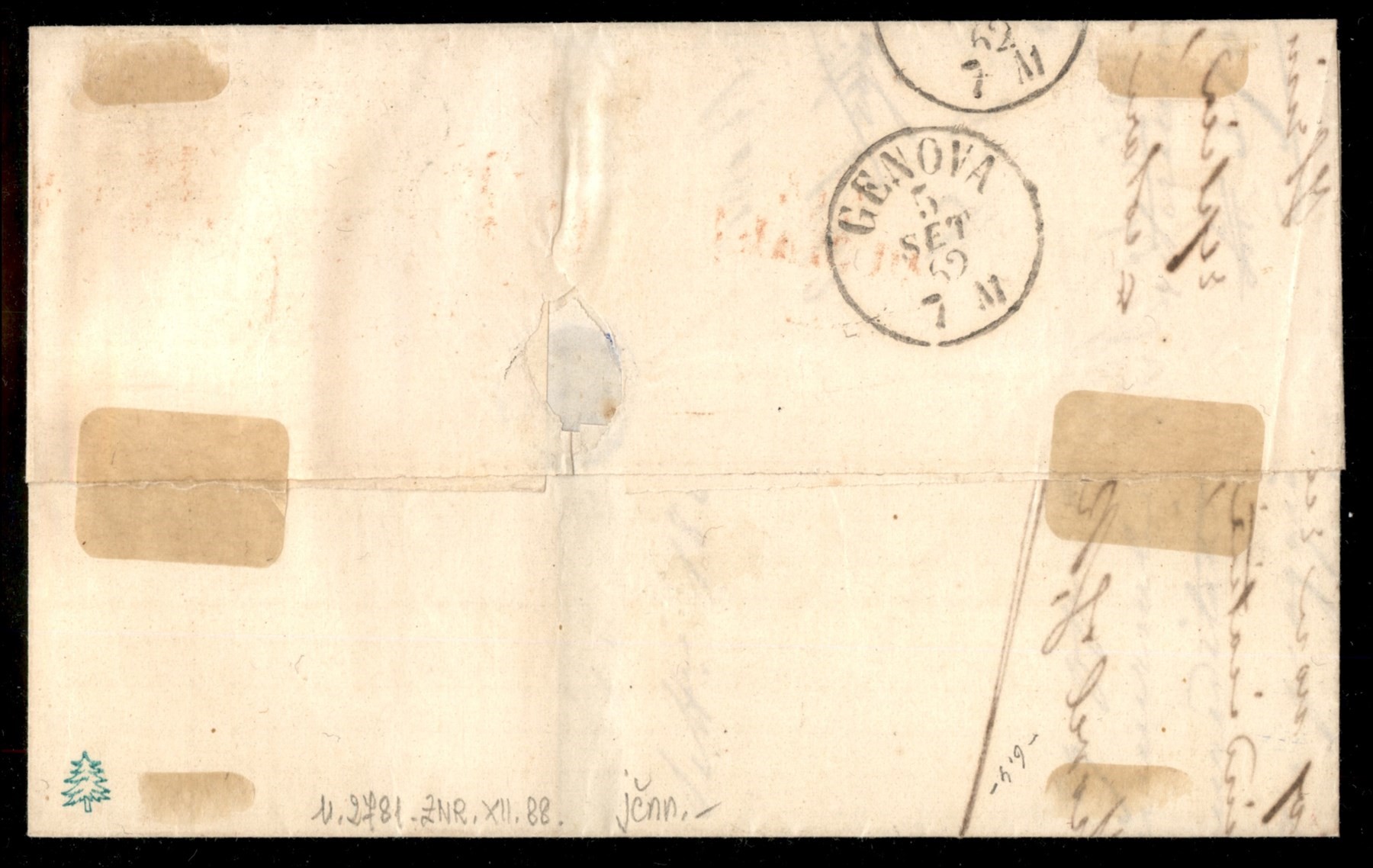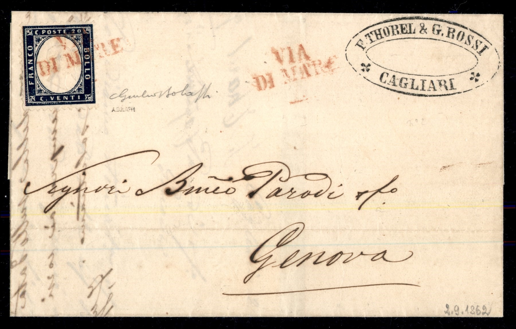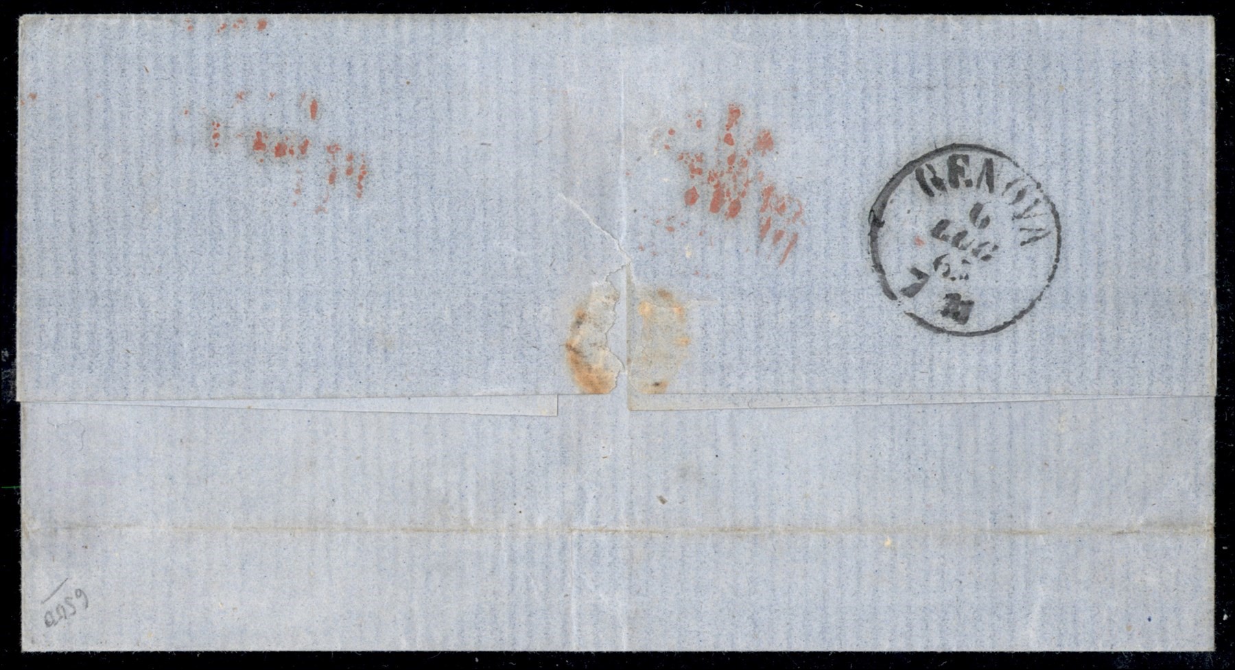 Lettera da Sorrento a Genova il 3.7.1863 con 15 cent. litografico (Sass. 13) annullato VIA DI MARE su due righe in rosso (p.5) (Image 1)