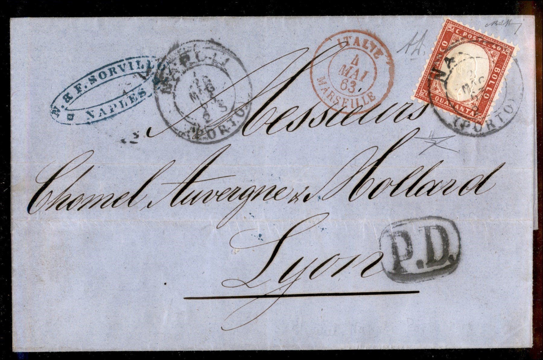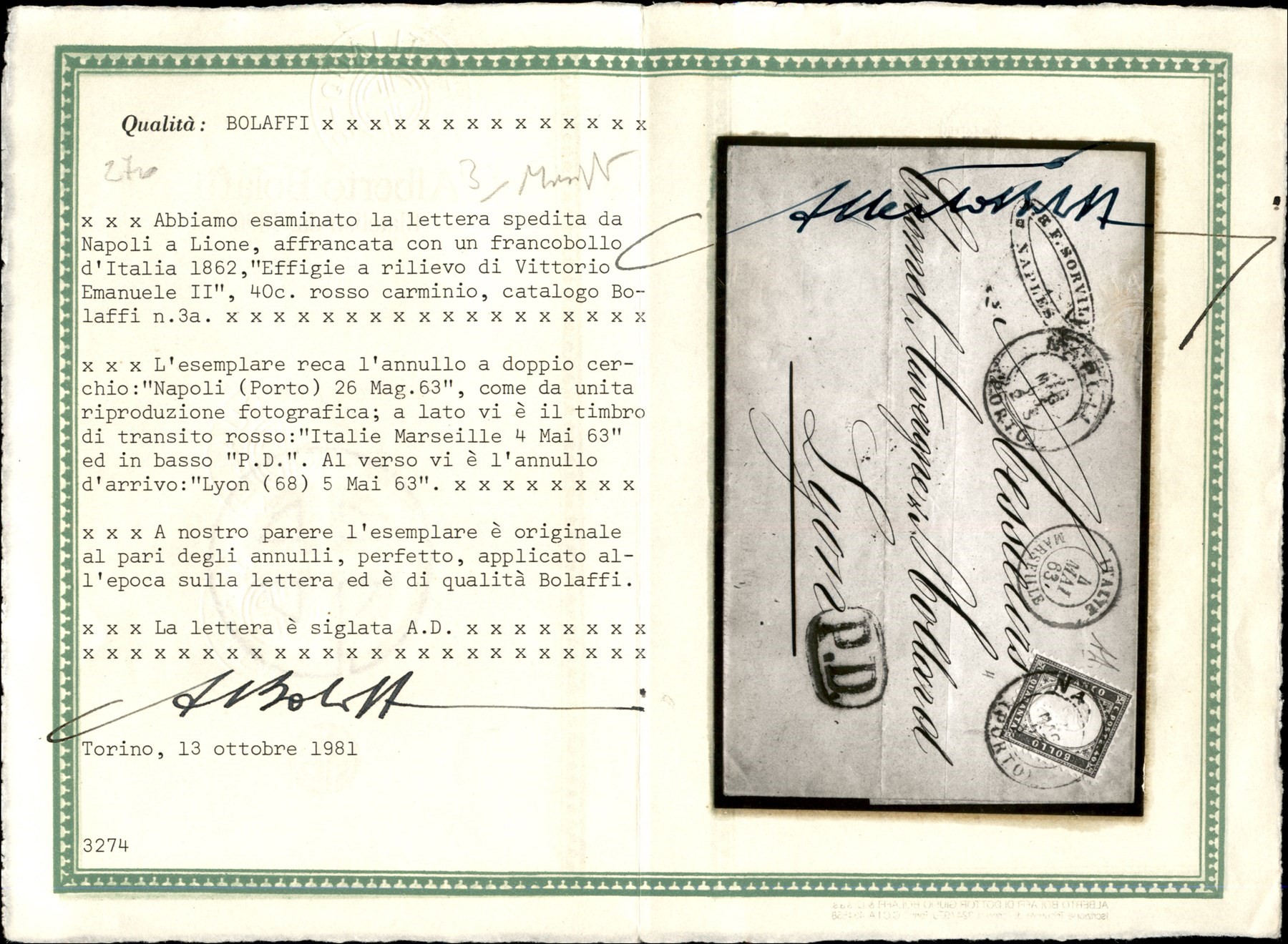 Fresca lettera con 40 cent rosso carminio scuro ()3a) da Napoli a Lione del 2.5.63 - ex coll. Provera - Diena + Bottacchi + cert. Bolaffi (Image 1)