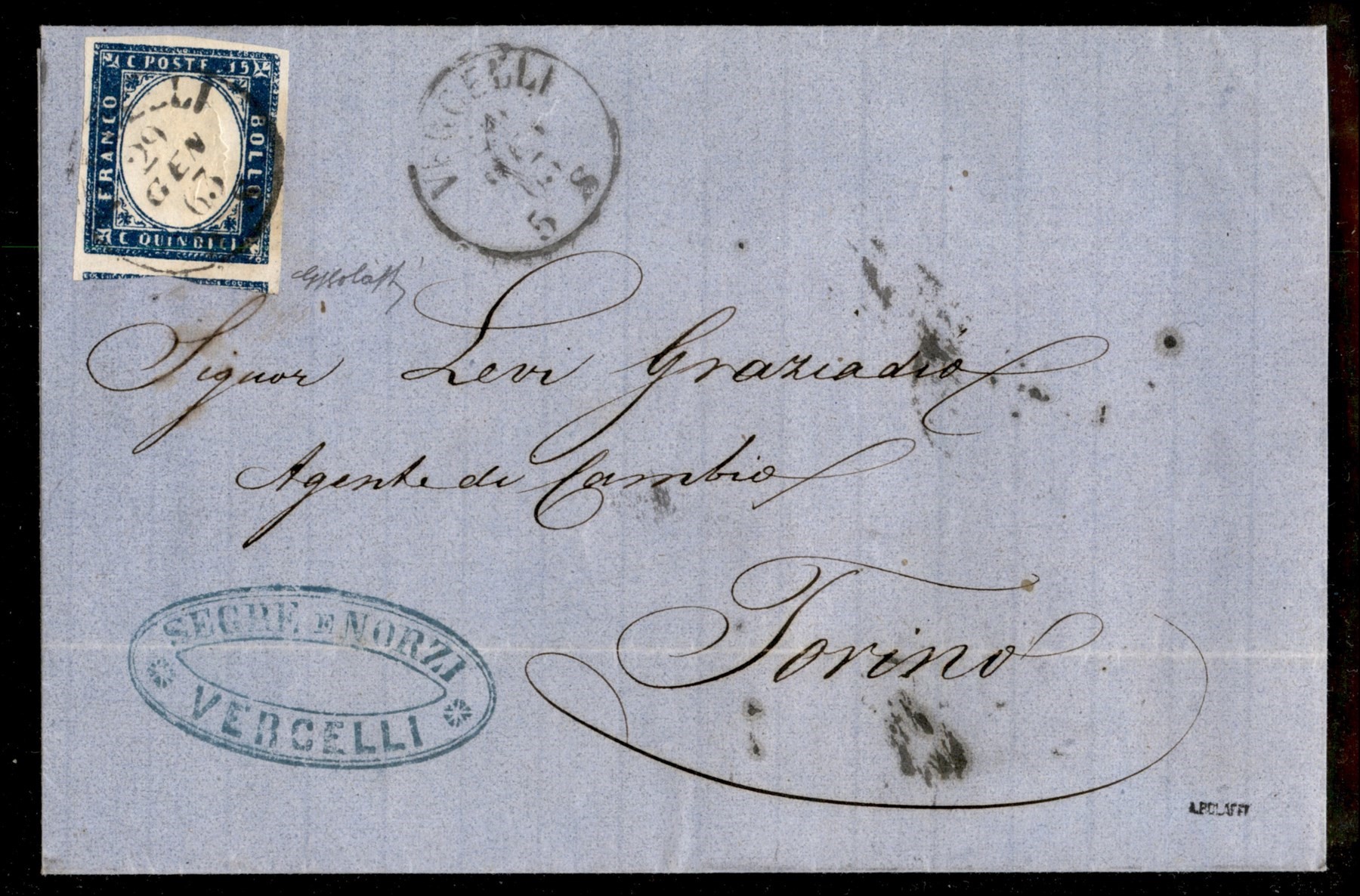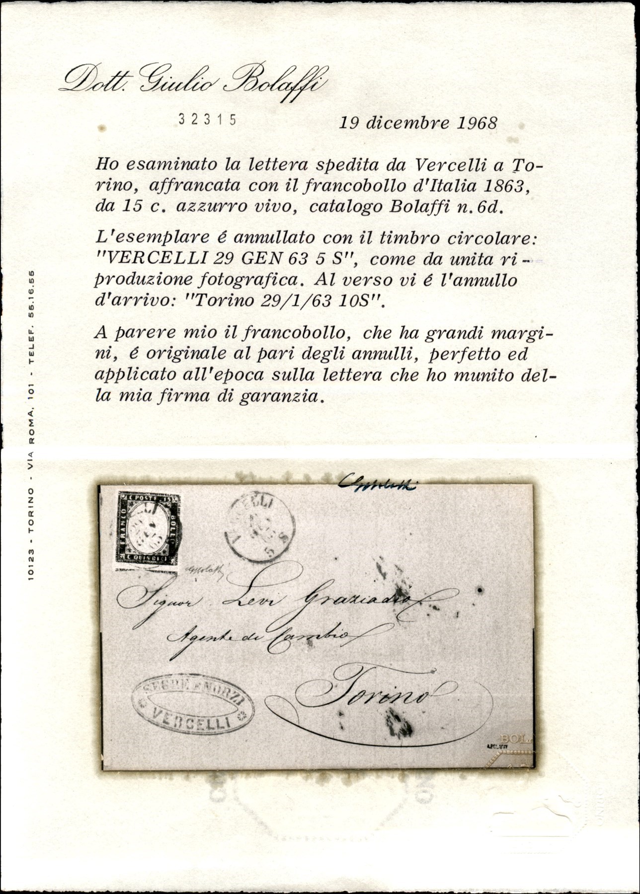 Splendido 15 cent azzurro vivo (11) con ampi margini e parte dell'esemplare inferiore su lettera da Vercelli a Torino del 29.1.63 - molto bella - cert. Bolaffi (Image 1)