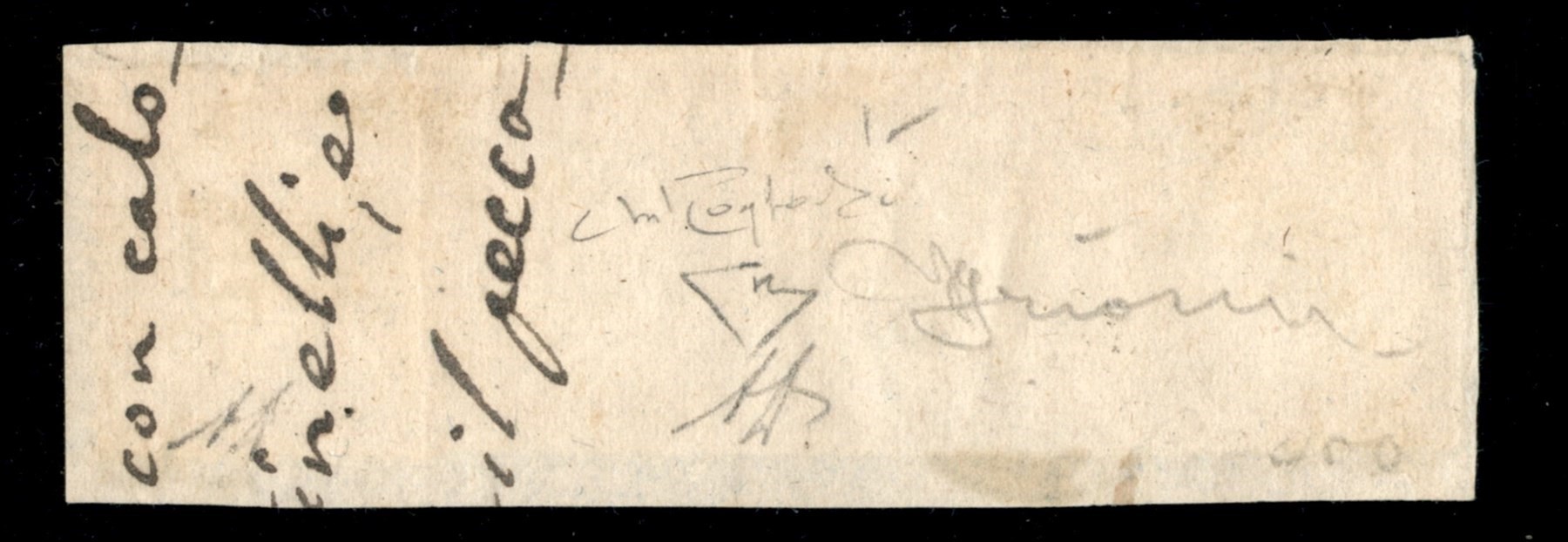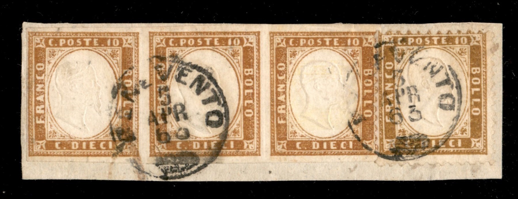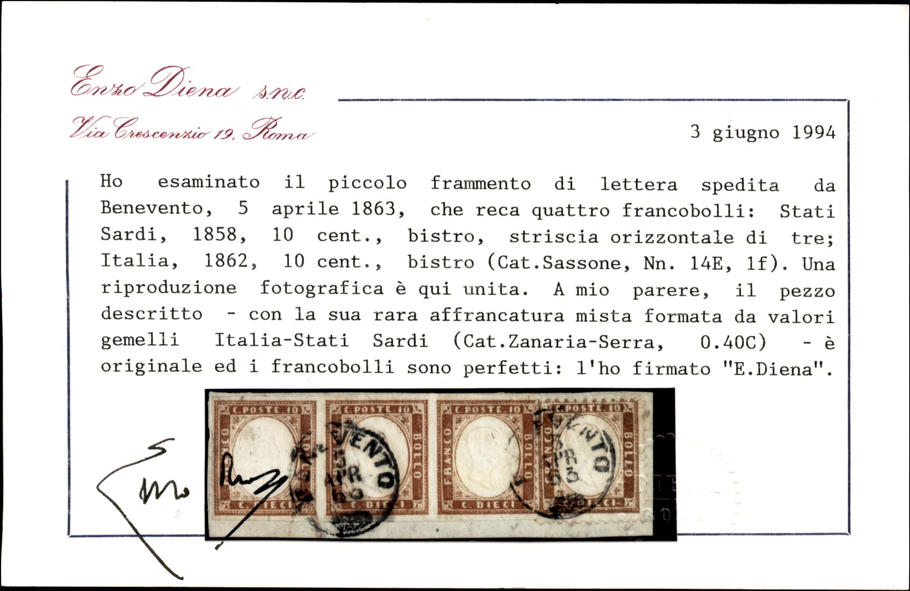 Frammento di lettera con splendida affrancatura mista di valori gemelli del 10 cent Sardegna/Regno (14E striscia di tre + 1f) annullati a Benevento 5.4.63 - splendida - cert. E. Diena (Image 1)