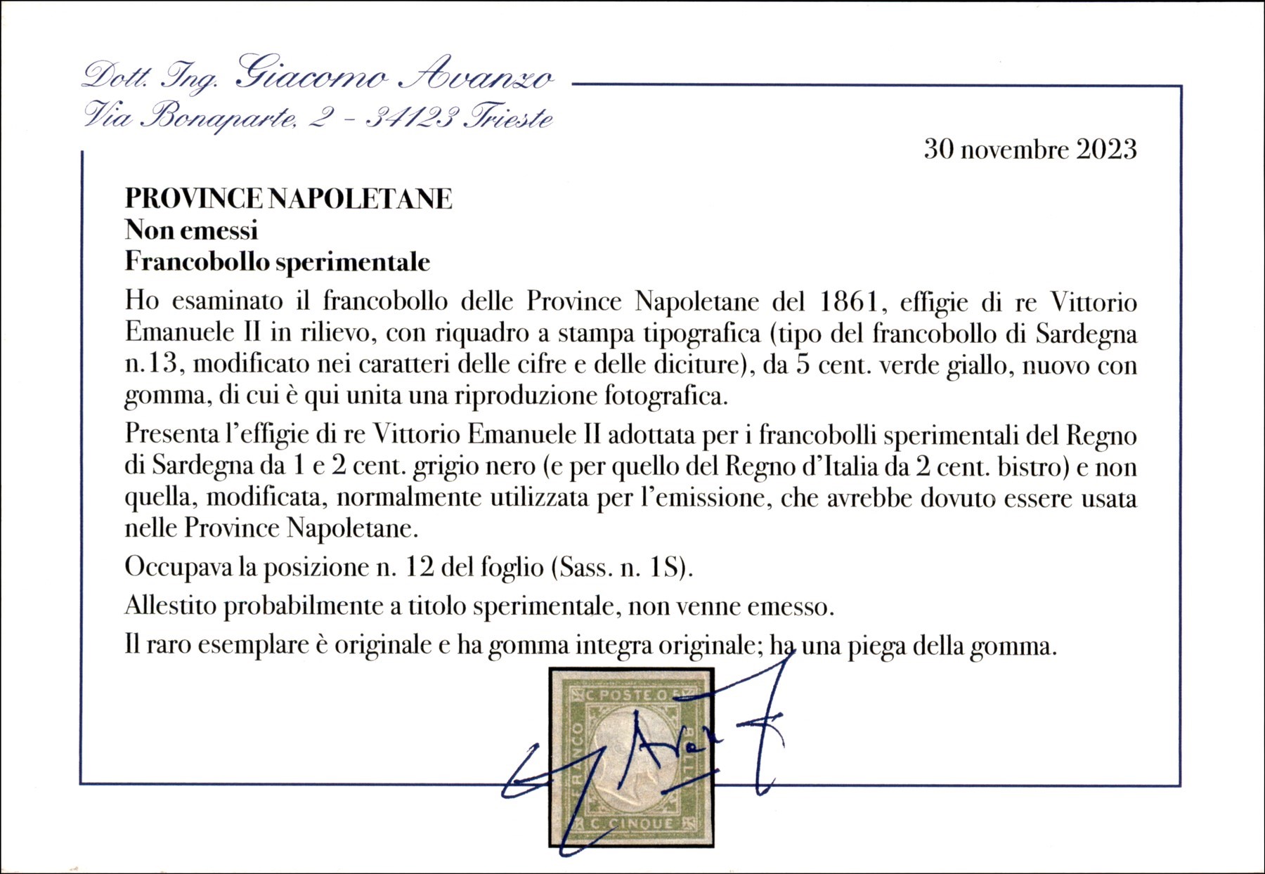 1861 - Emissione per le Province Napoletane - Francobollo Sperimentale - 5 cent verde giallo (1S) nuovo con gomma integra - molto bello e raro - cert. Avanzo (Image 1)