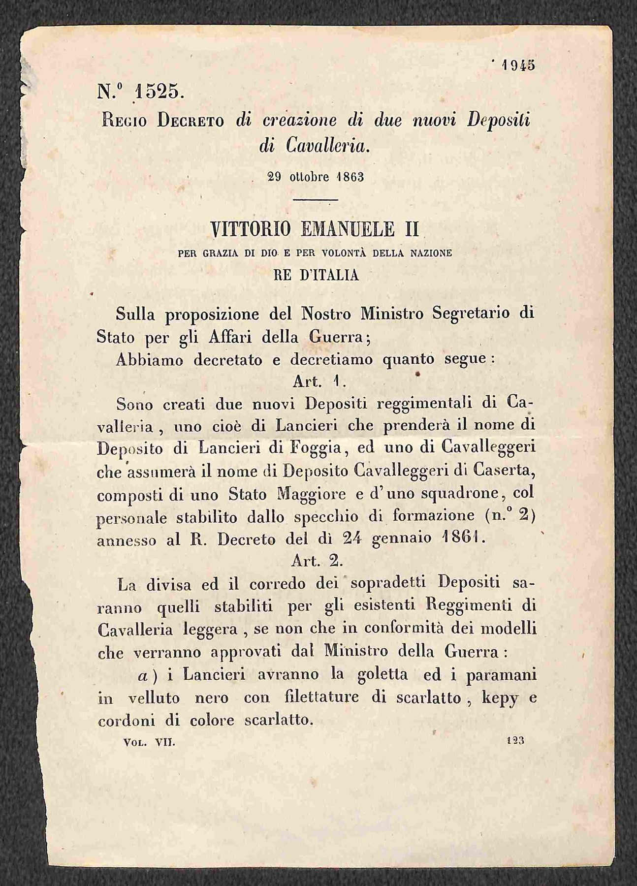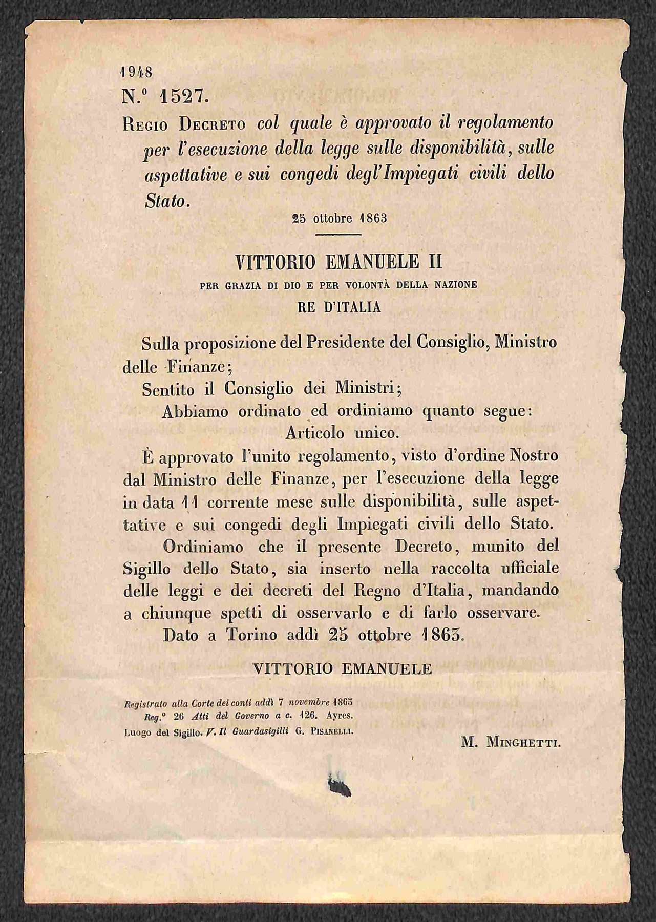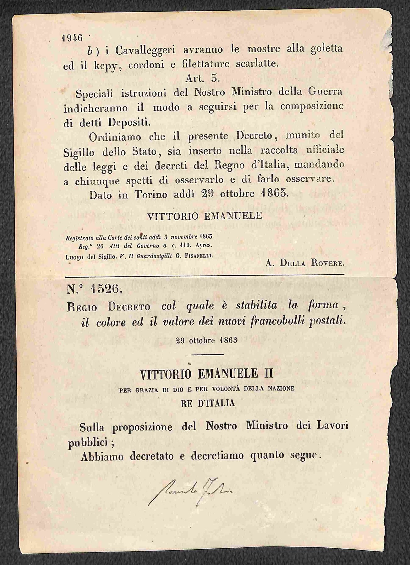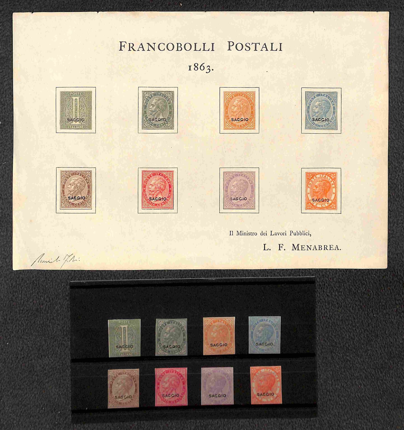 1863 - Fresco foglietto Menabrea + serie del Saggi (staccati da un altro foglietto) e i due Regi Decreti (N. 1525 e N. 1527) relativi all'emissione - insieme non comune - Fabris (Image 1)