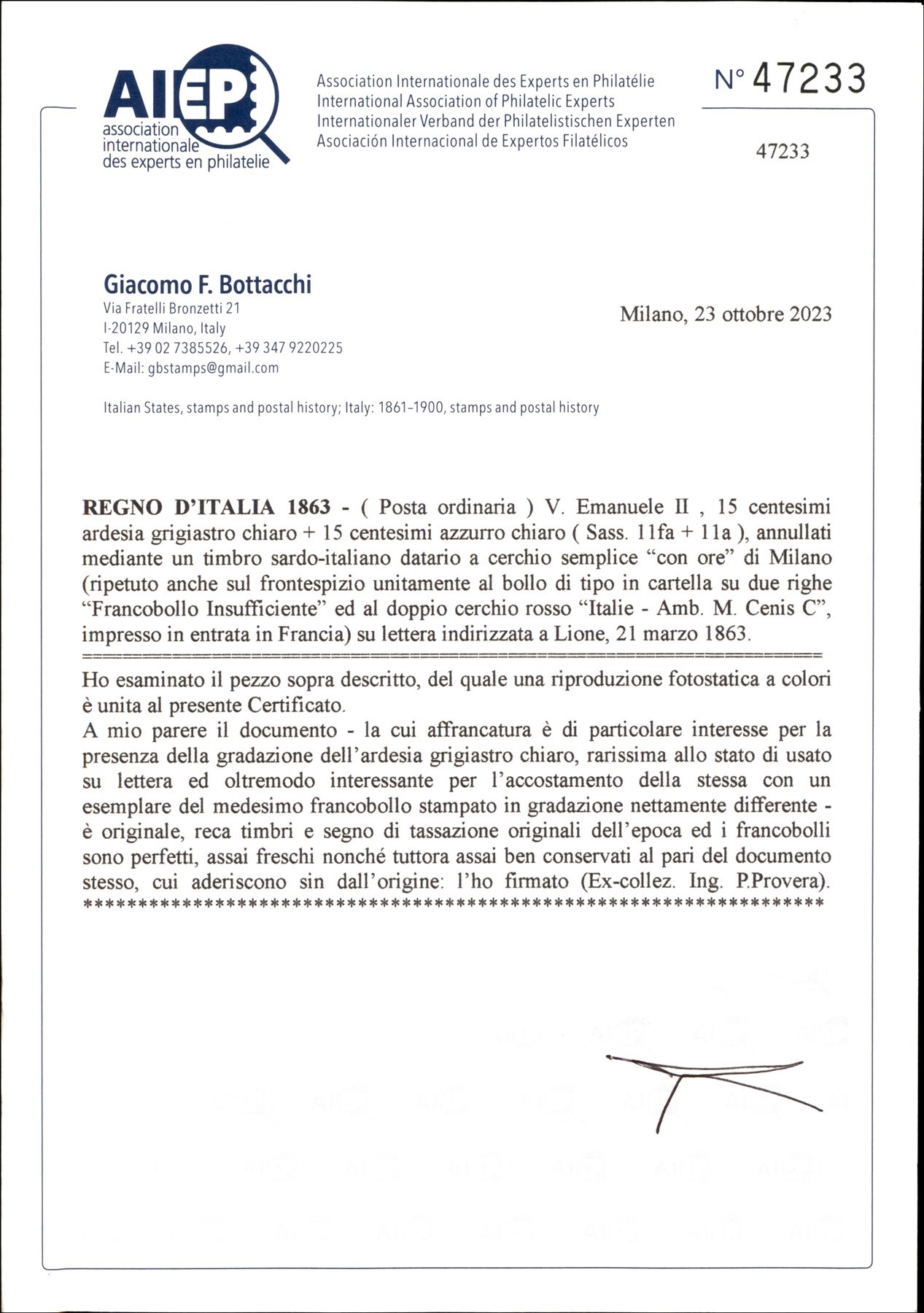Lettera con cent. 15 azzurro ardesia chiaro + cent. 15 azzurro chiaro (11fa + 11a ) da Milano a Lione del 11.3.63 - valori gemelli con il raro ardesia chiaro - ex coll. Provera - Cert Bottacchi (Image 1)