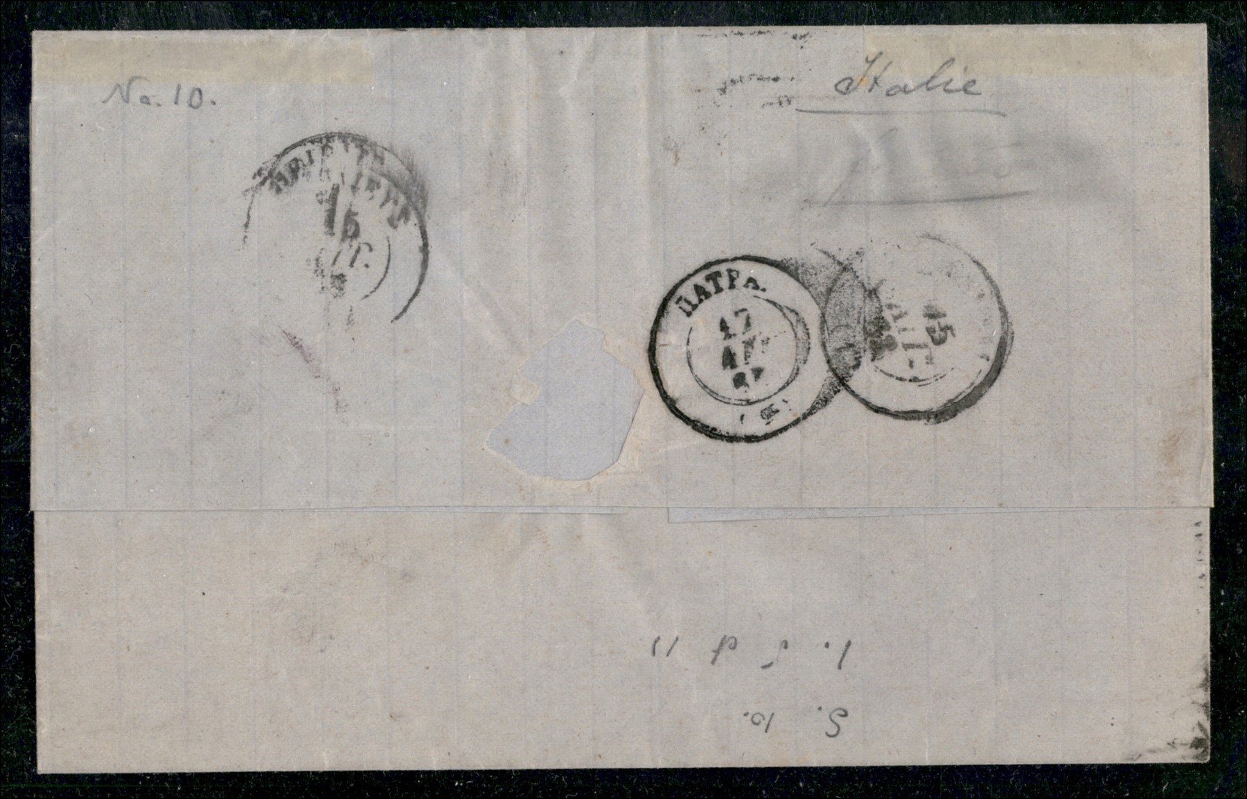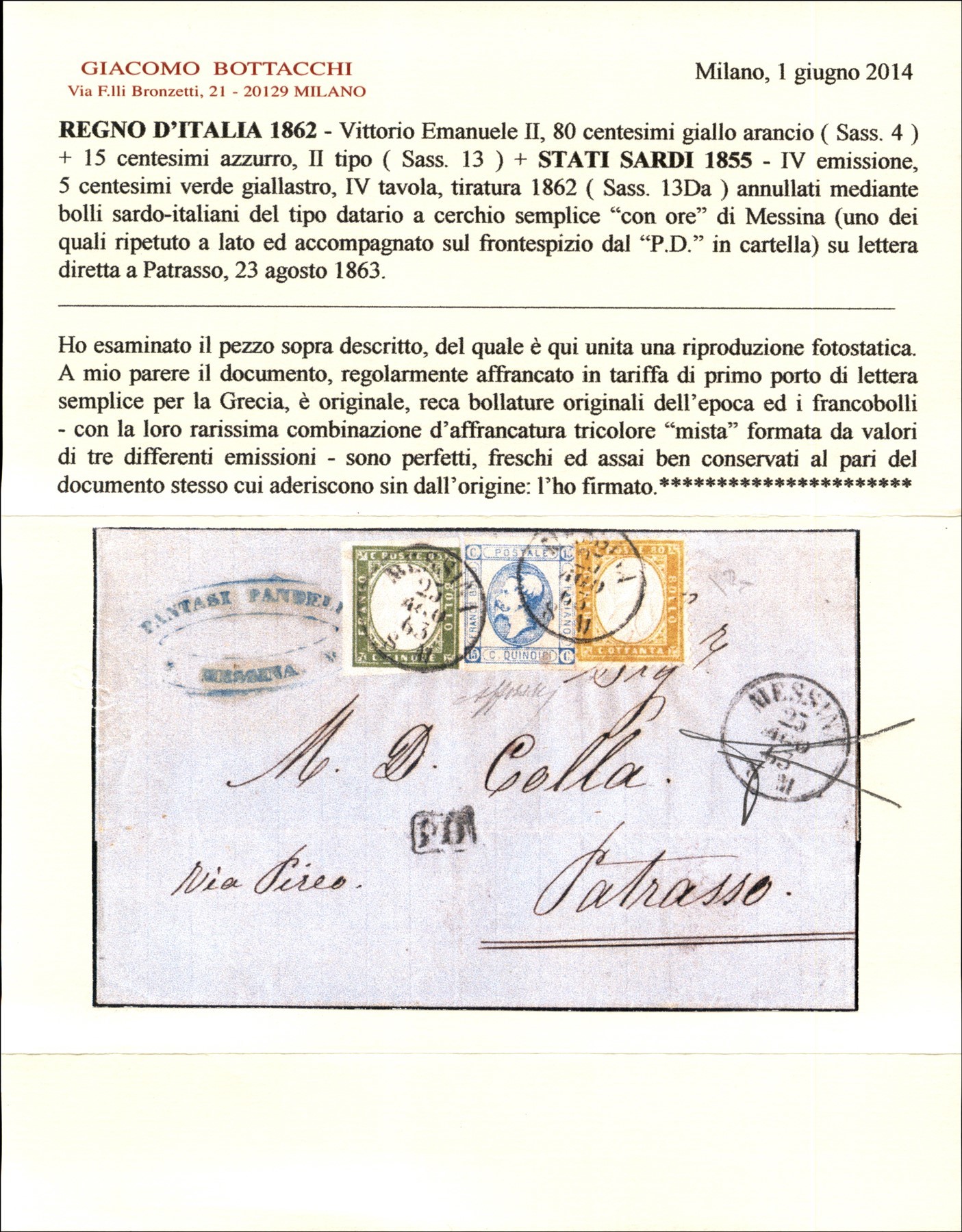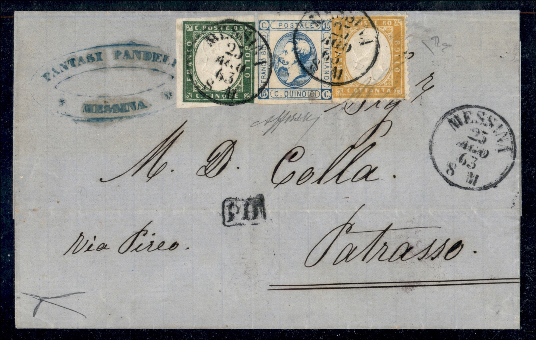 Mista Sardegna Regno d'Italia - Lettera affrancata con cent. 5 verde giallastro IV tavola + cent 15 azzurro II tipo + cent. 80 giallo arancio (13Da+4+13) da Messina 23.8.63 per Patrasso (Grecia) - splendida qualità lusso -