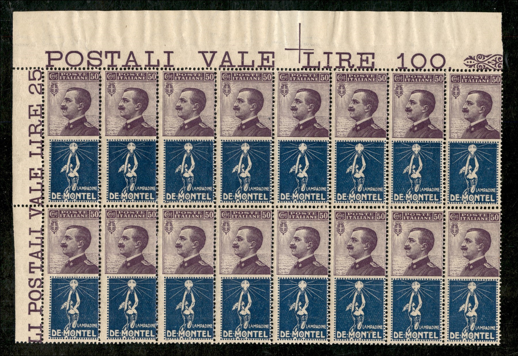 1925 - Pubblicitari - Blocco angolare di 16 esemplari del 50 cent De Montel (12) - alcune vignette con spostamento - gomma integra (Image 1)