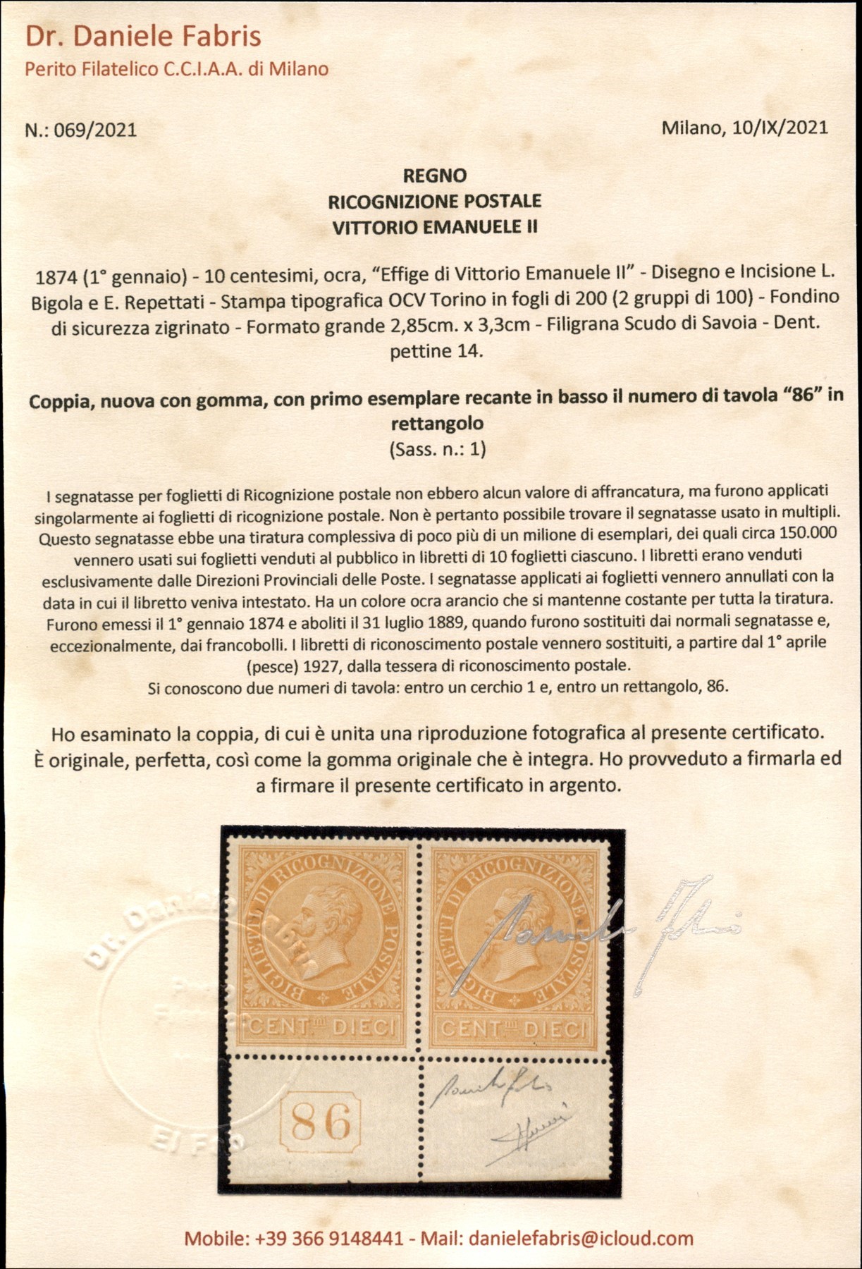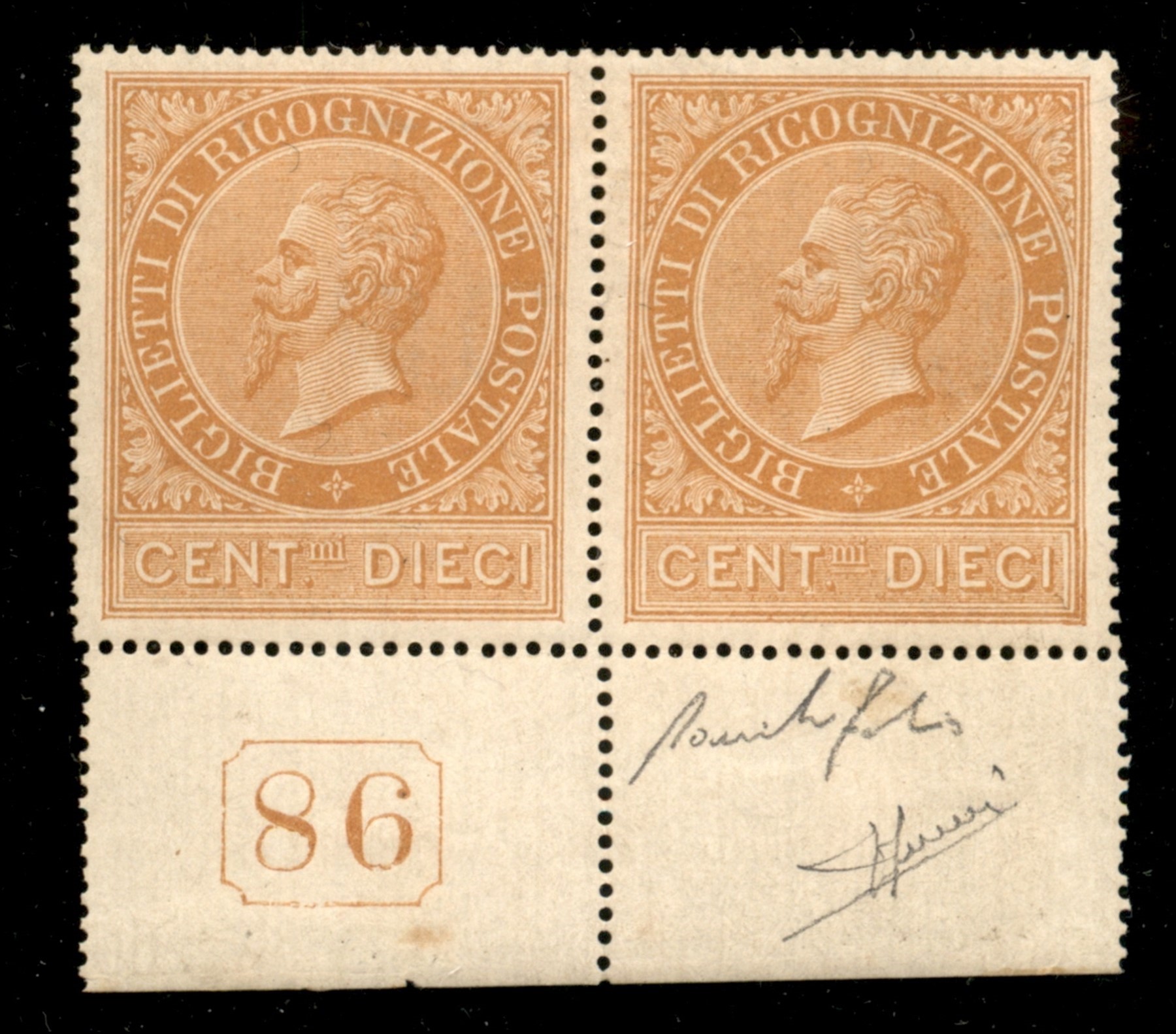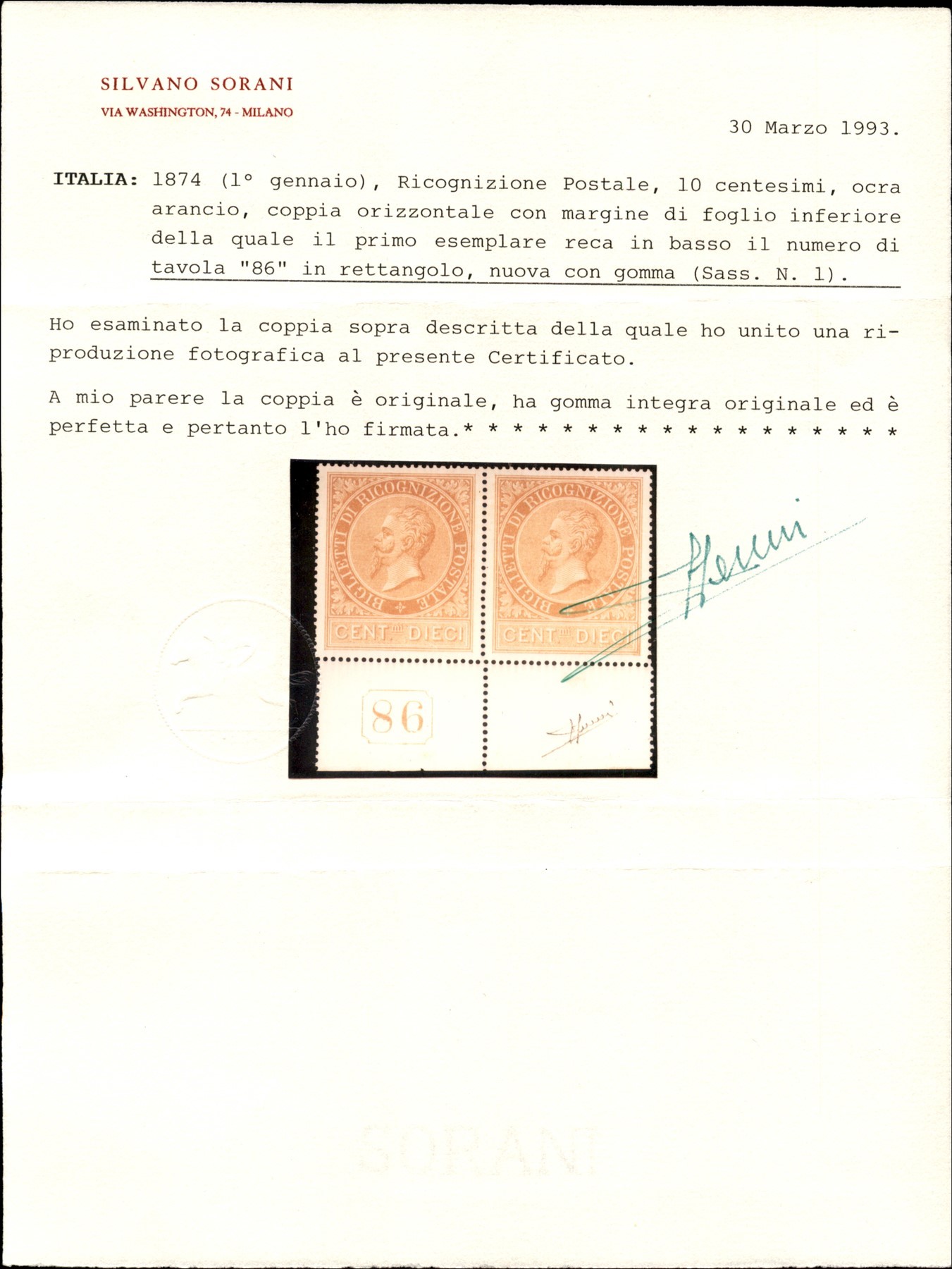 Coppia del 10 cent ocra arancio (1) bordo di foglio con numero di Tavola "86" in rettangolo sull'esemplare di sinistr - discretamente centrati - gomma integra - cert. Sorani + cert. Fabris (Image 1)