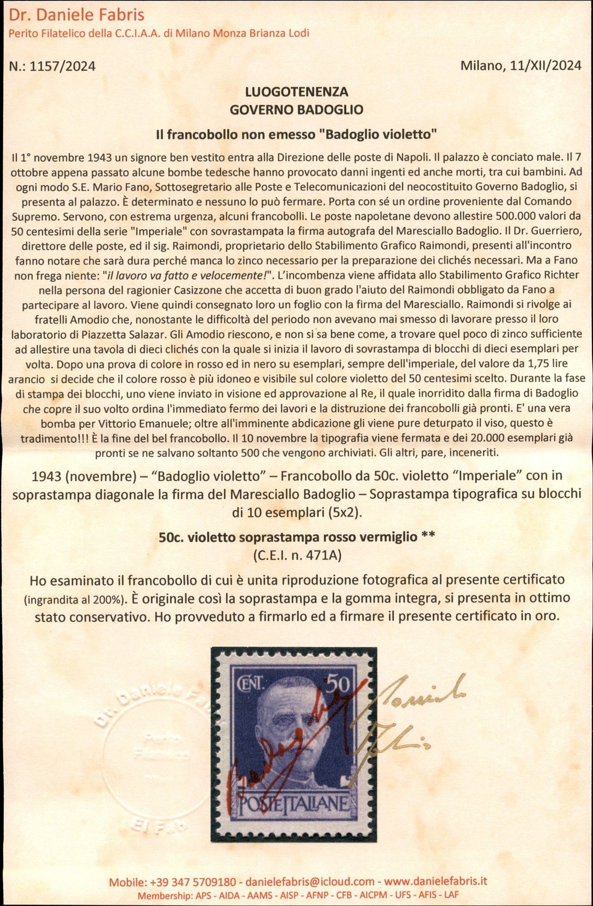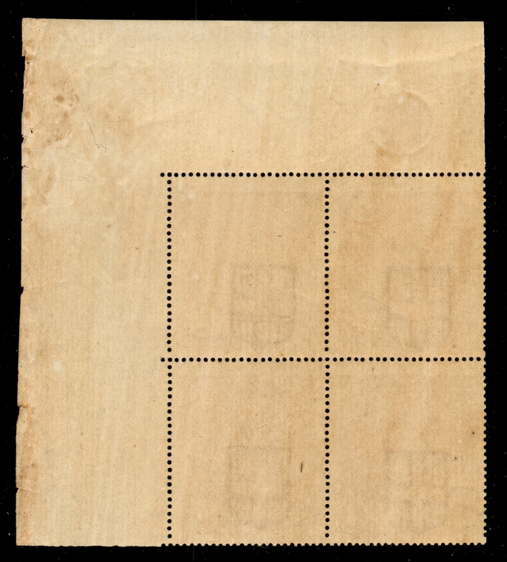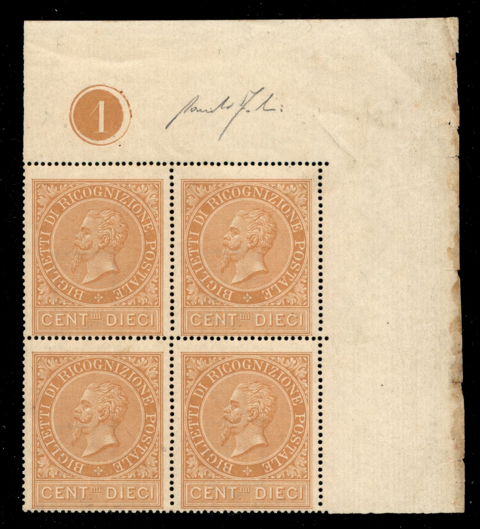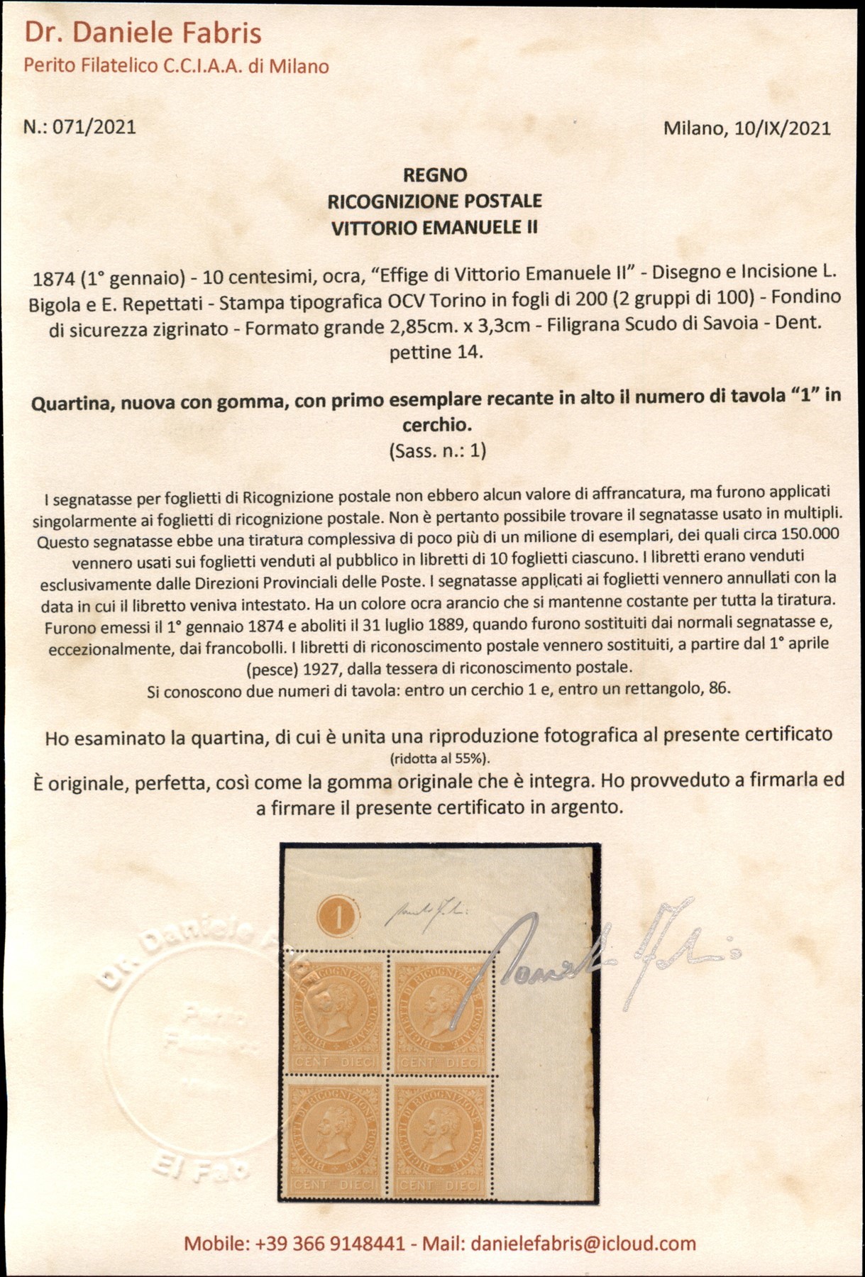 Quartina del 10 cent ocra arancio (1) angolo di foglio con numero di Tavola "1" in cerchio in alto a sinistra - gomma integra - cert. Fabris (Image 1)