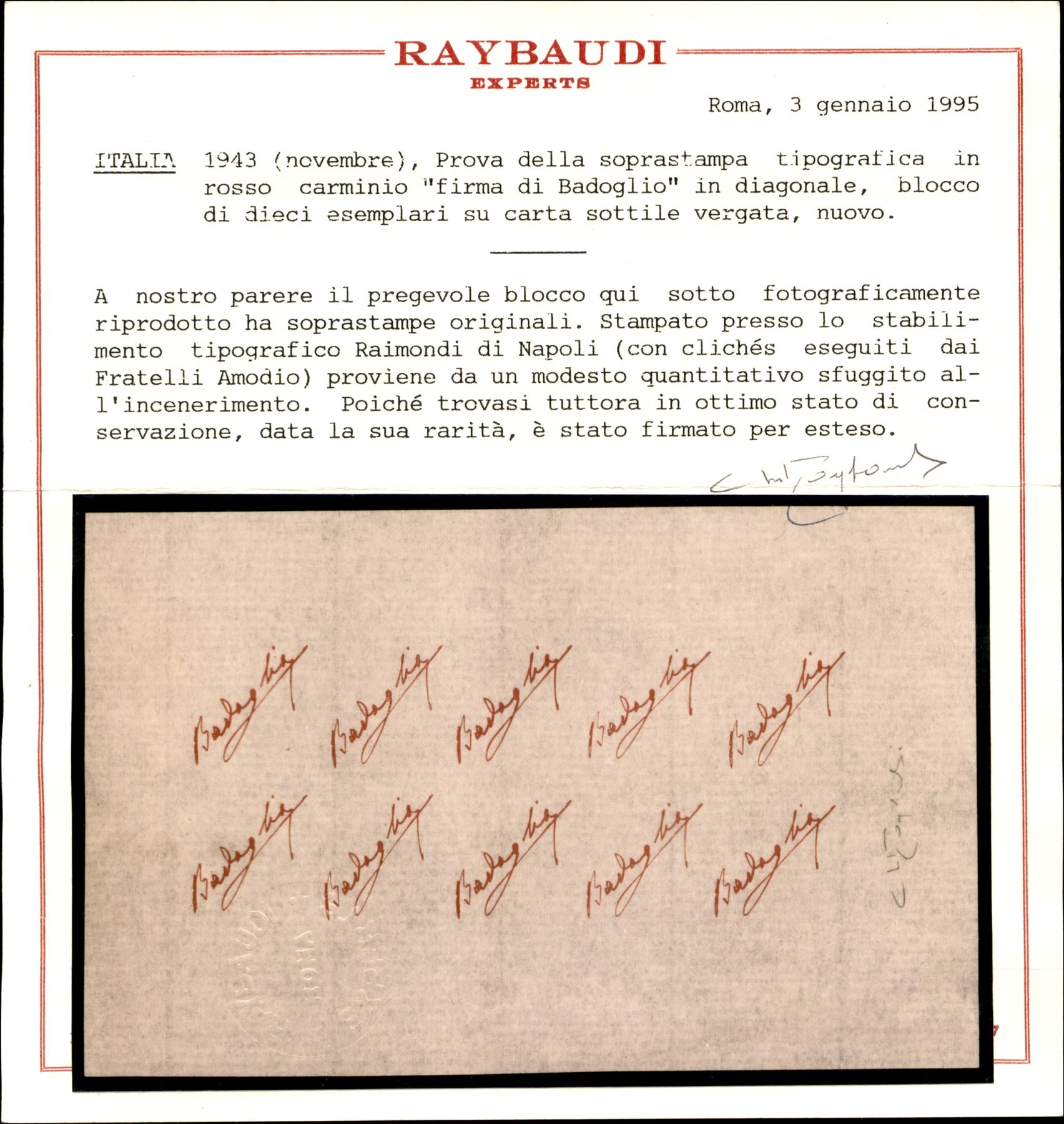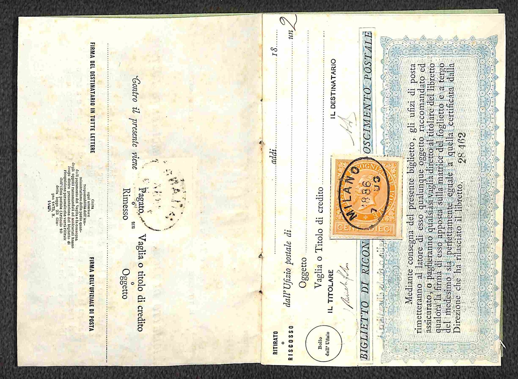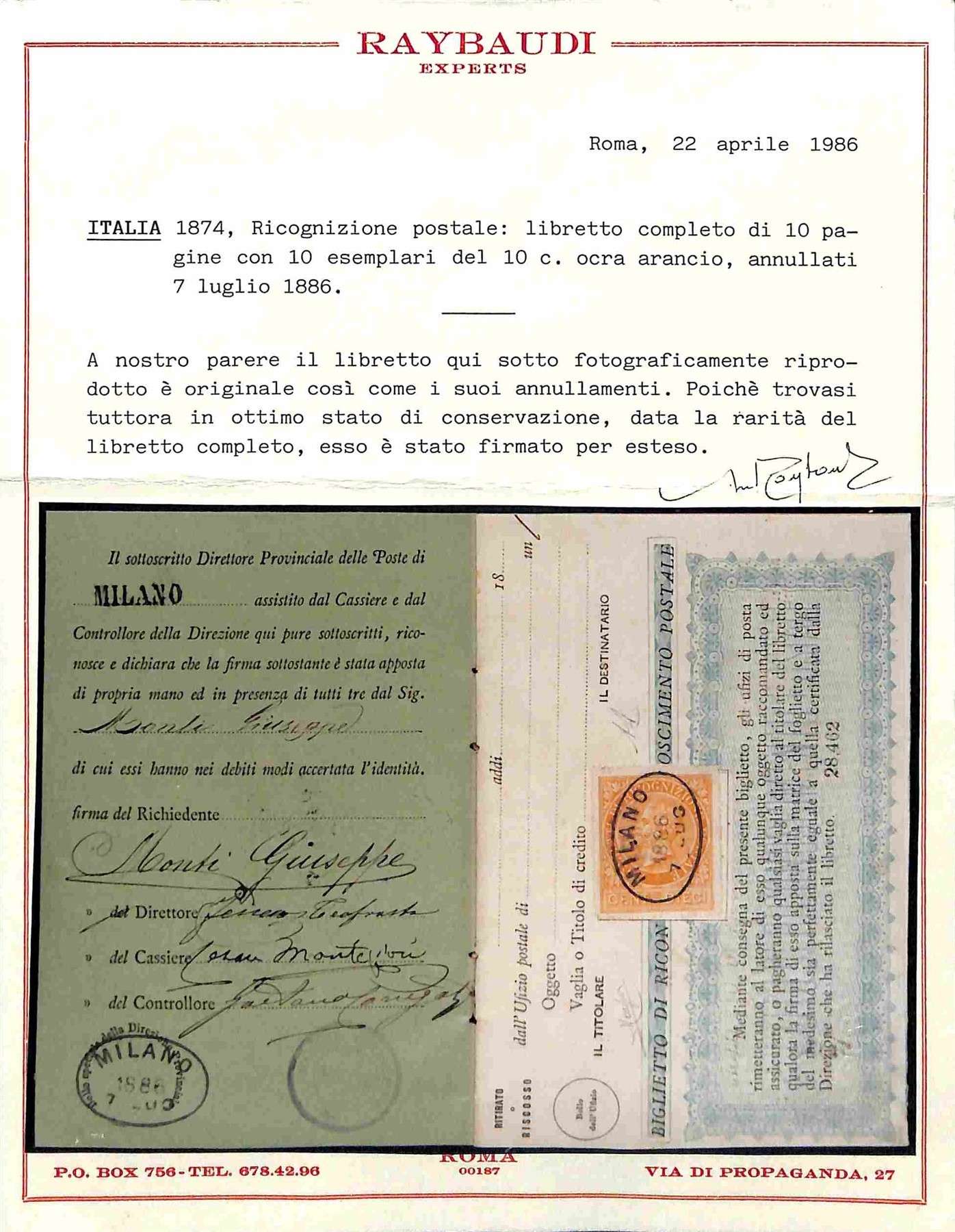 Libretto di ricognizione Postale completo delle 10 pagine con apposta su ciascuna il 10 cent (1) debitamente annullato Milano 7.7.1886 - splendido insieme in ottimo stato di conservazione e molto raro - cert. Raybaudi + cert.
