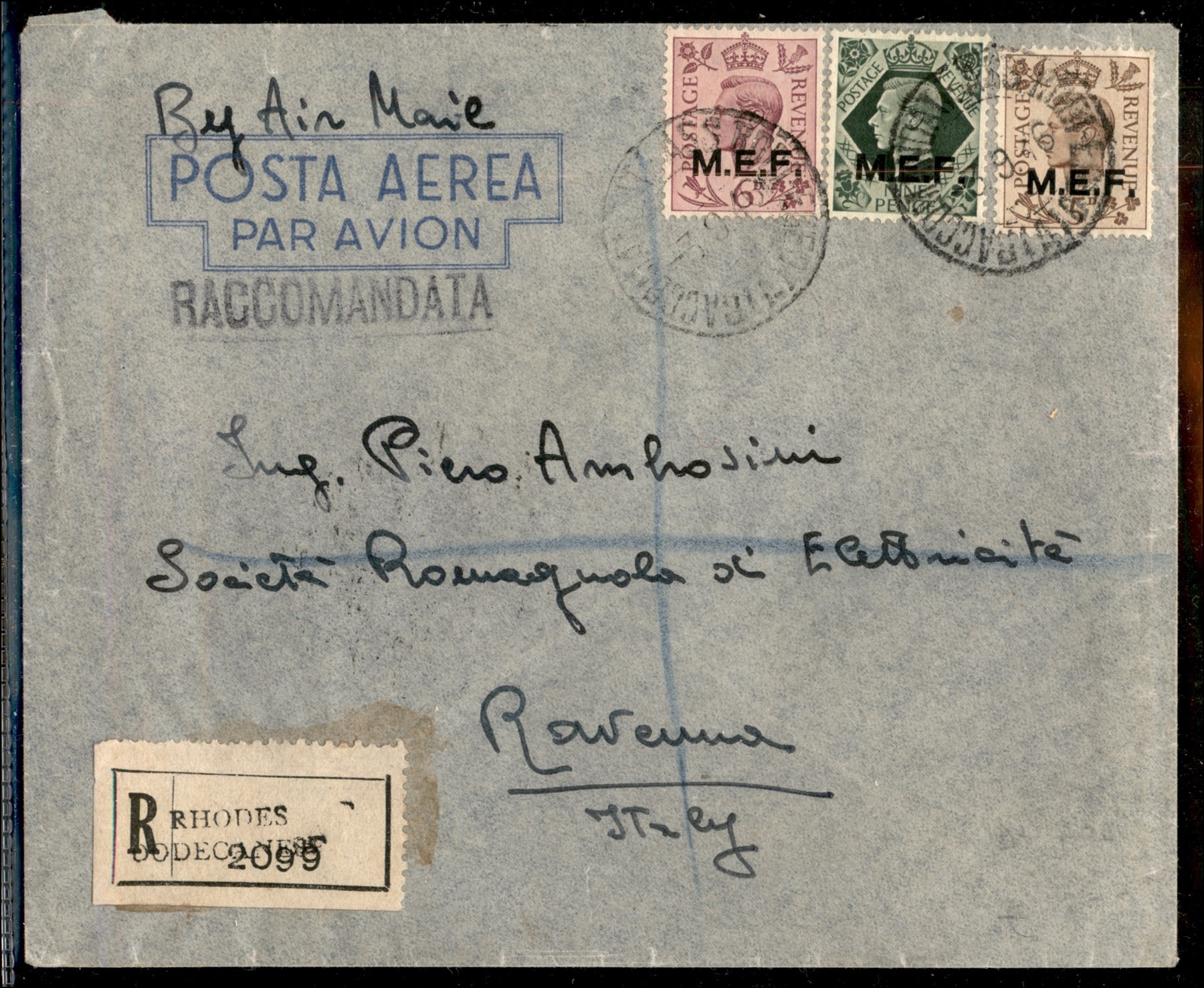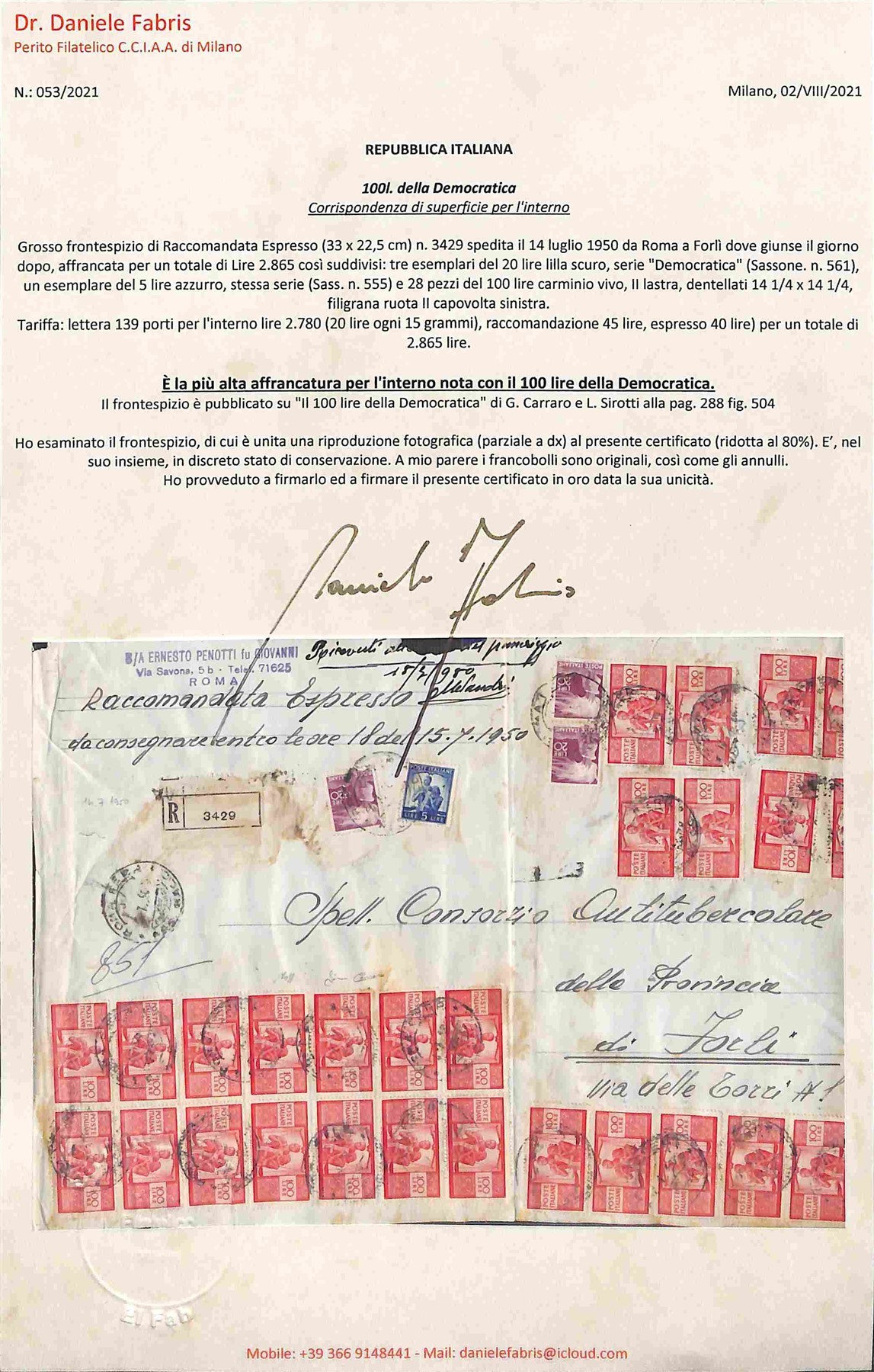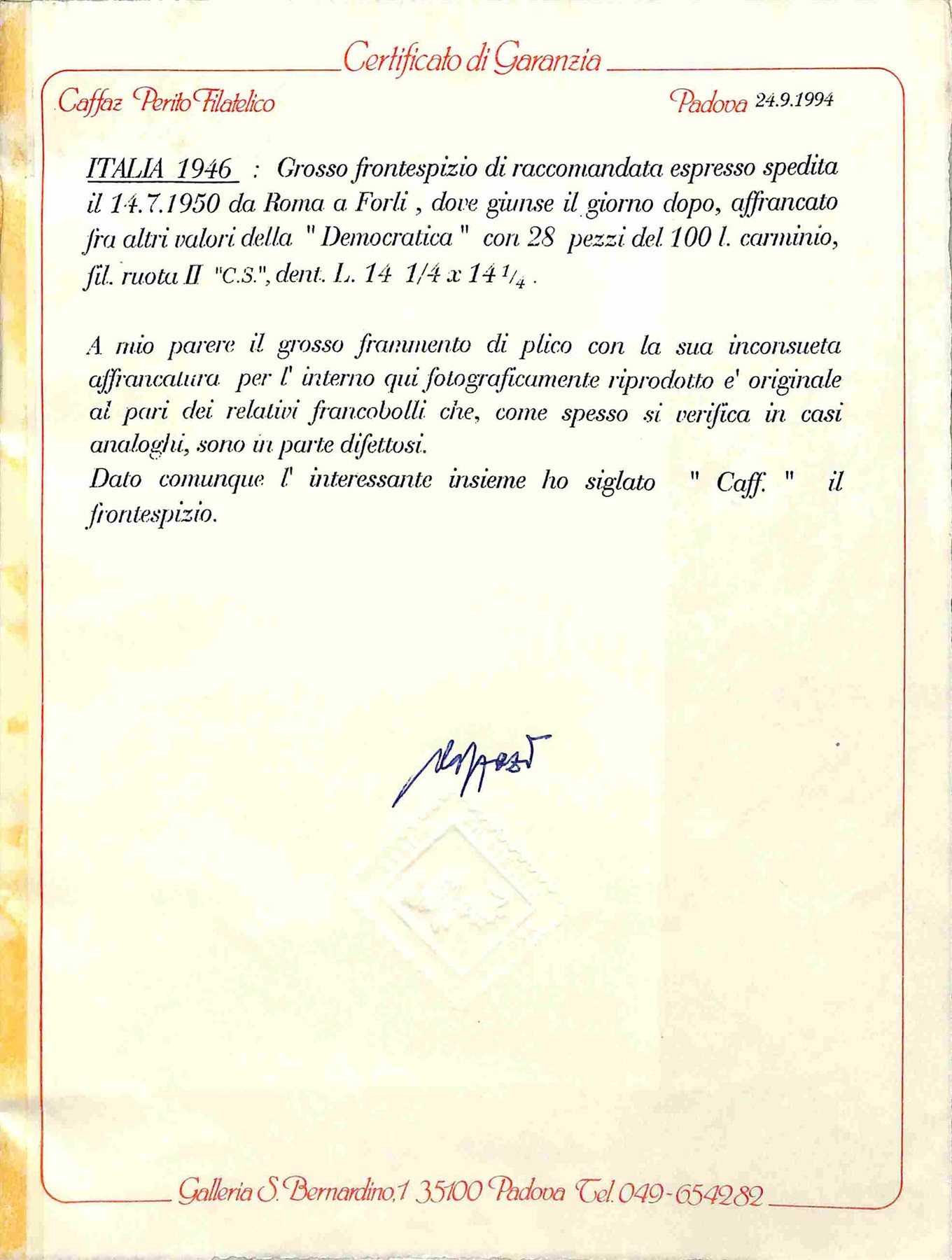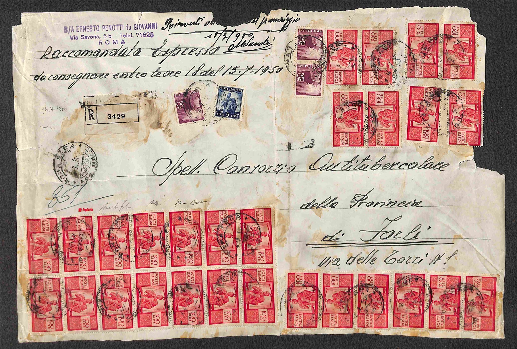 Grande frontespizio di raccomandata espresso con 28 esemplari del 100 lire Democratica (565) + complementari (555 + 561) da Roma a Forlì del 14.7.50 - si tratta della più alta affrancatura per l'interno nota con il 100 lire