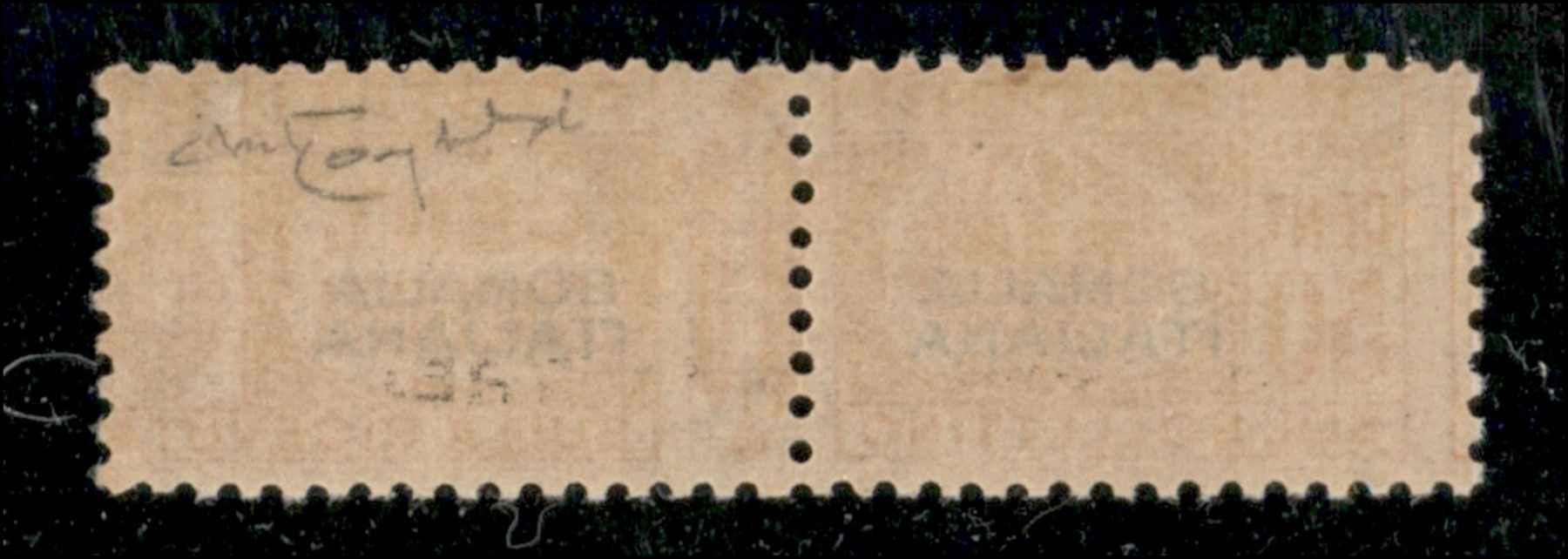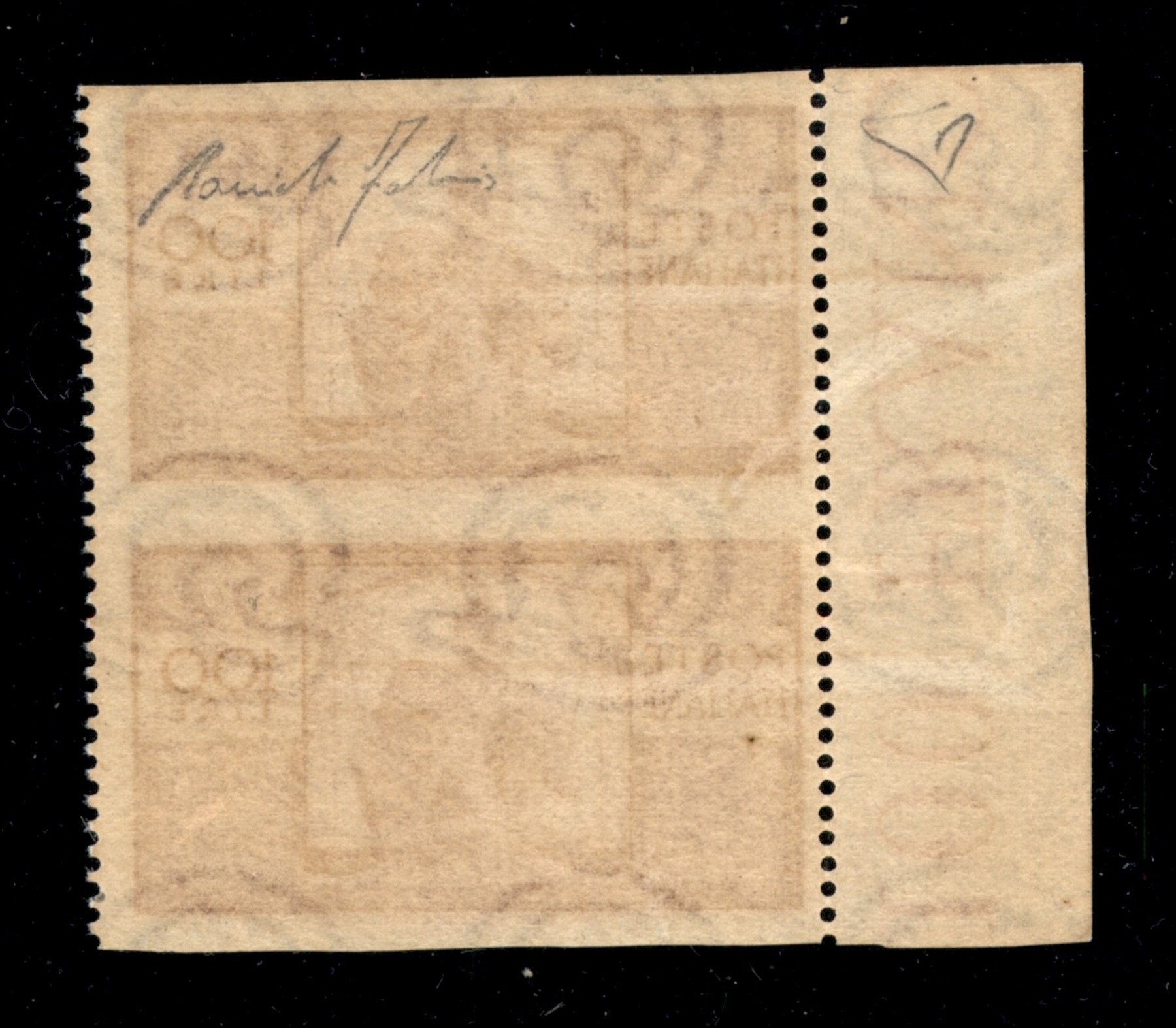 1946 - Coppia bordo di foglio del 100 lire Democratica (565ai) non dentellato orizzontalmente - gomma integra - cert. Fabris (Image