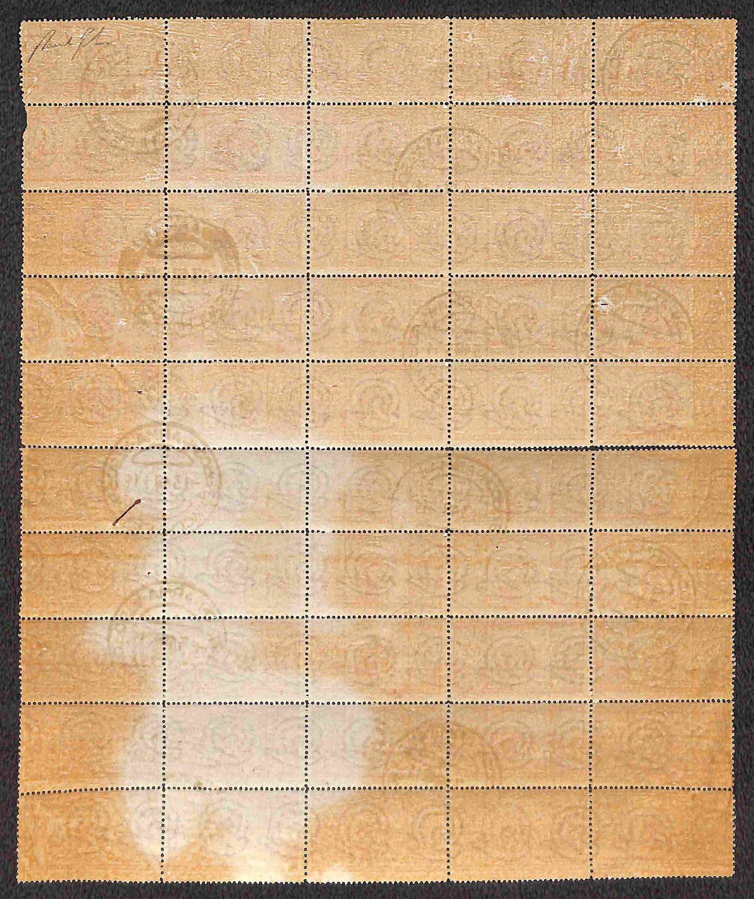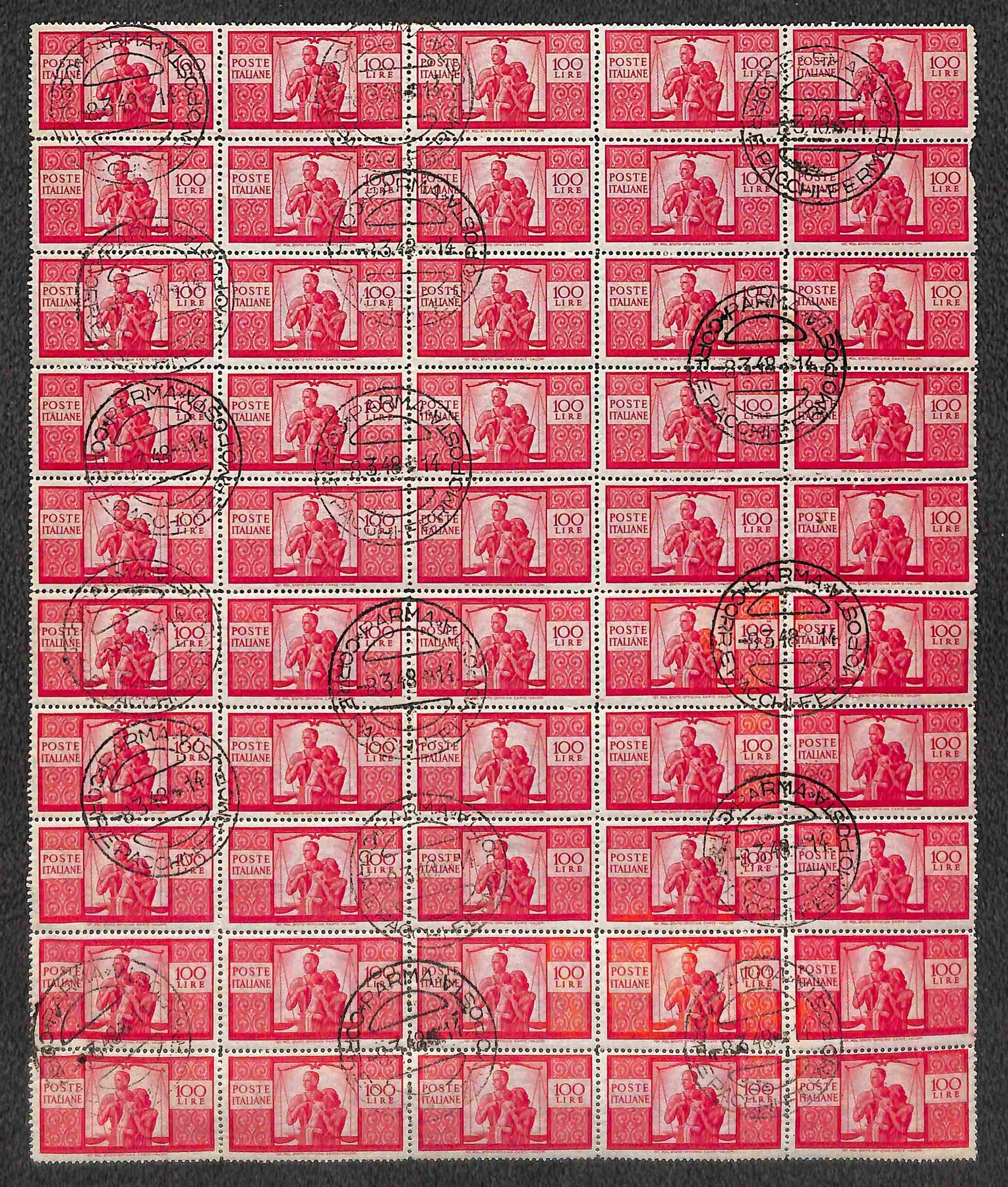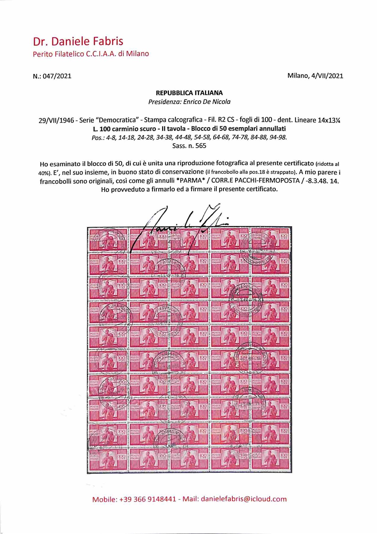 Foglio di cinquanta esemplari del 100 lire Democratica (565/I) annullato Parma 8.3.48 - un esemplare con strappo sul bordo - cert. Fabris (Image 1)