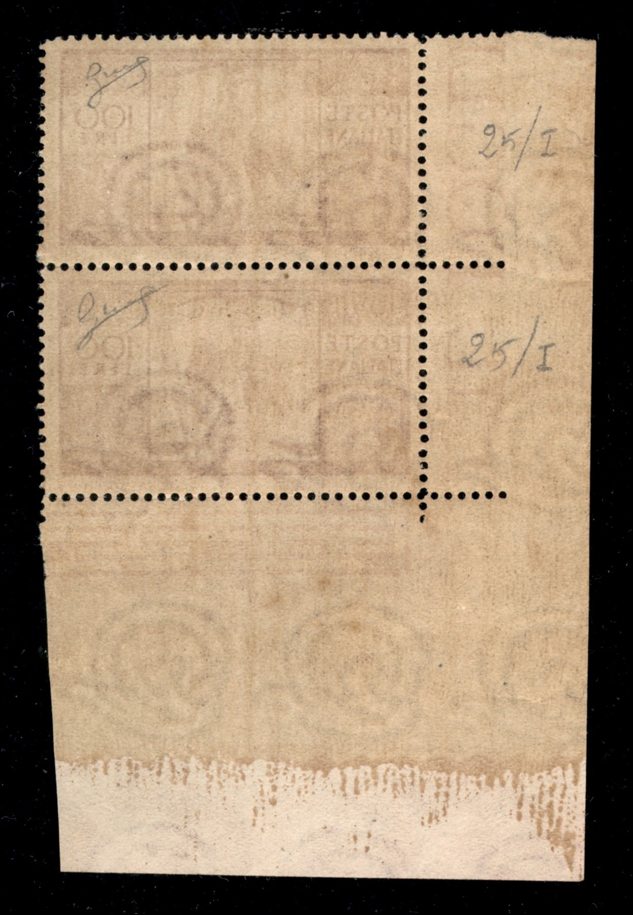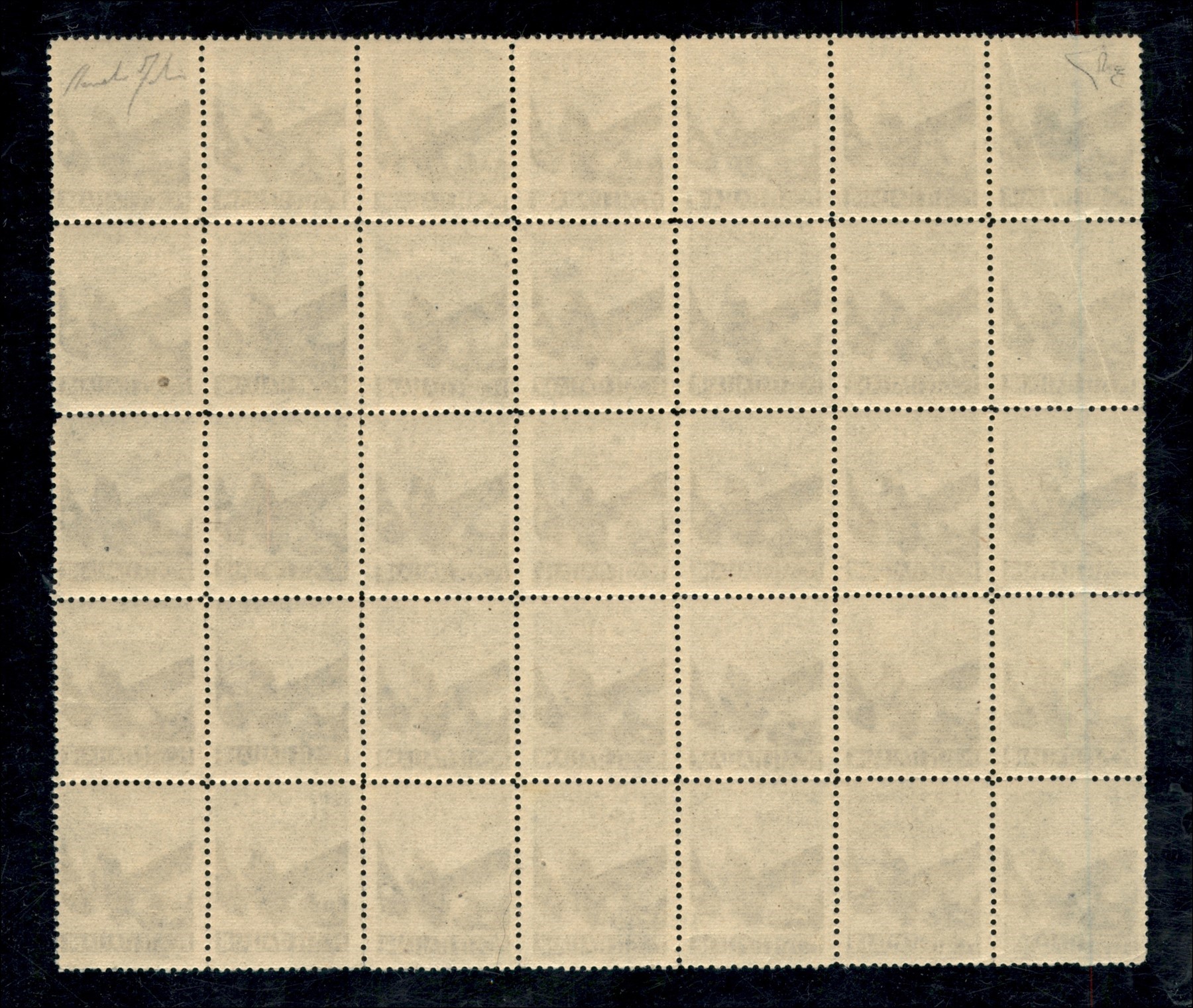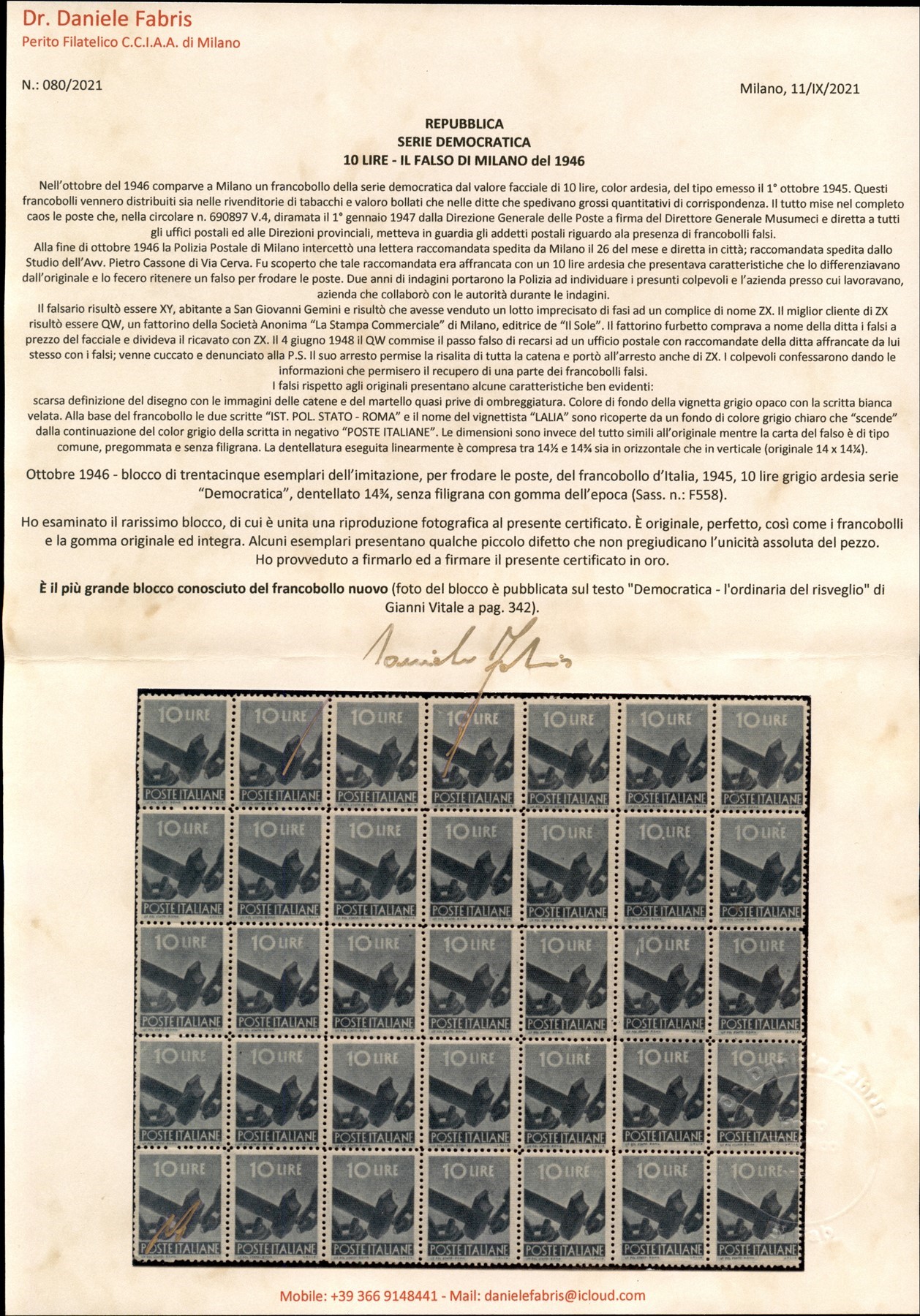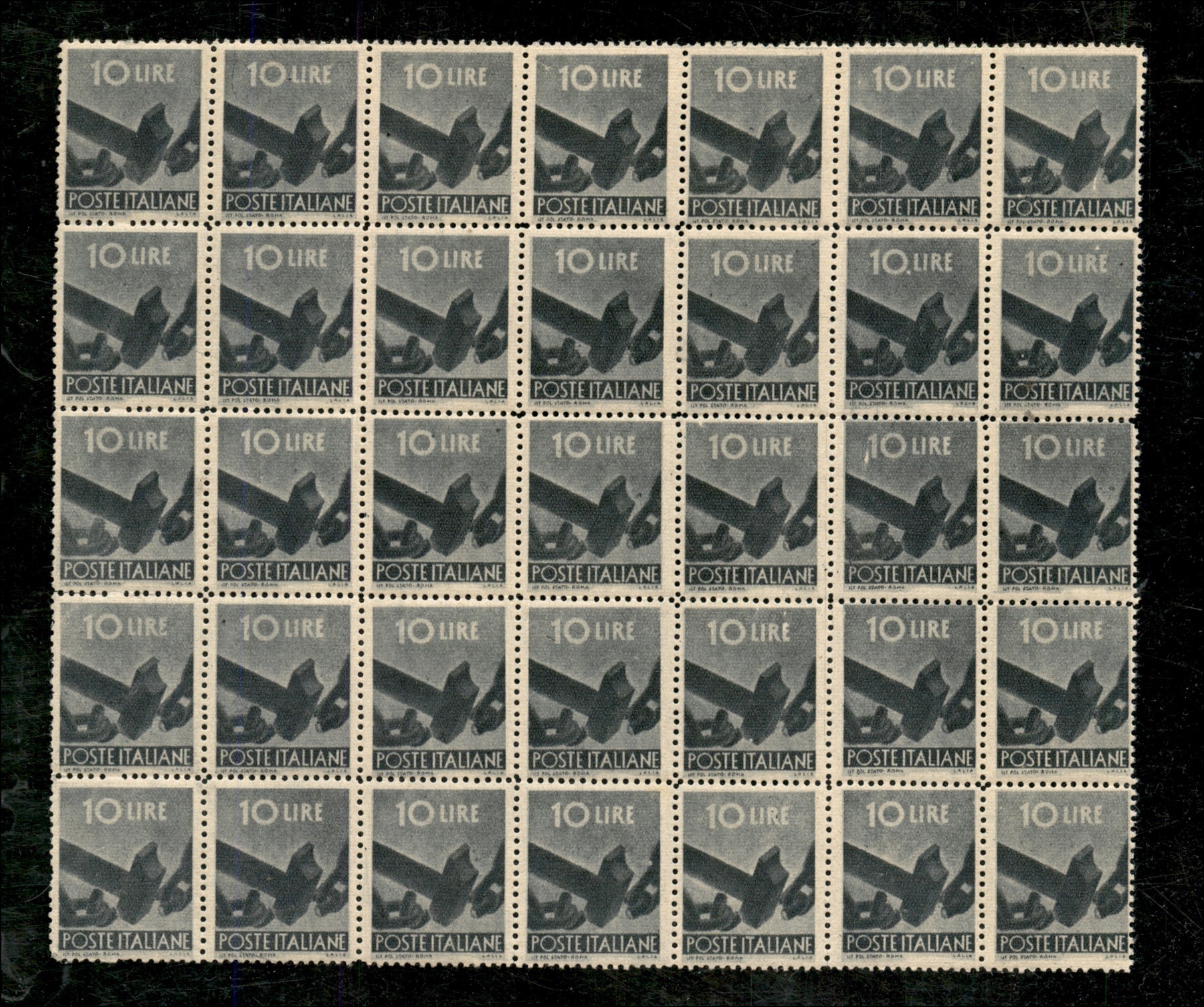 1945 - Falso di Milano - Splendido blocco di trentacinque esemplari del 10 lire grigio ardesia (F558) nuovo con gomma integra - si tratta del più grande blocco noto di questo valore - molto raro - cert. Diena + cert. Fabris (Image 1)