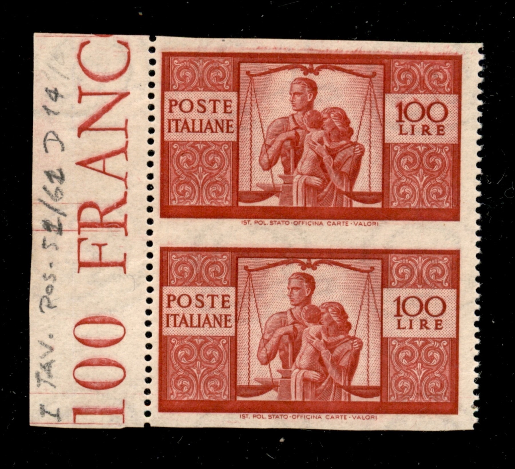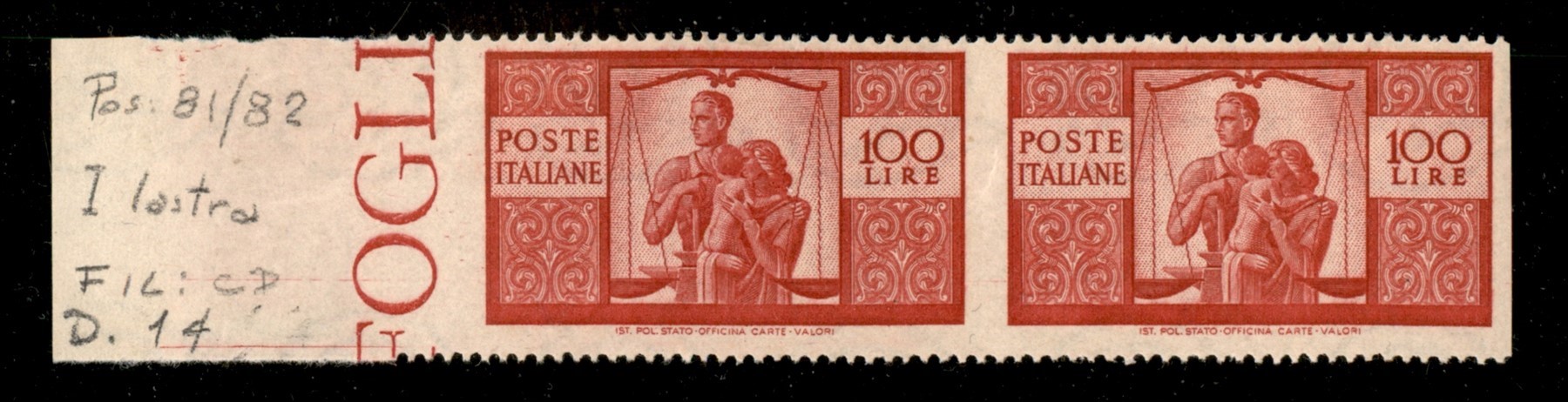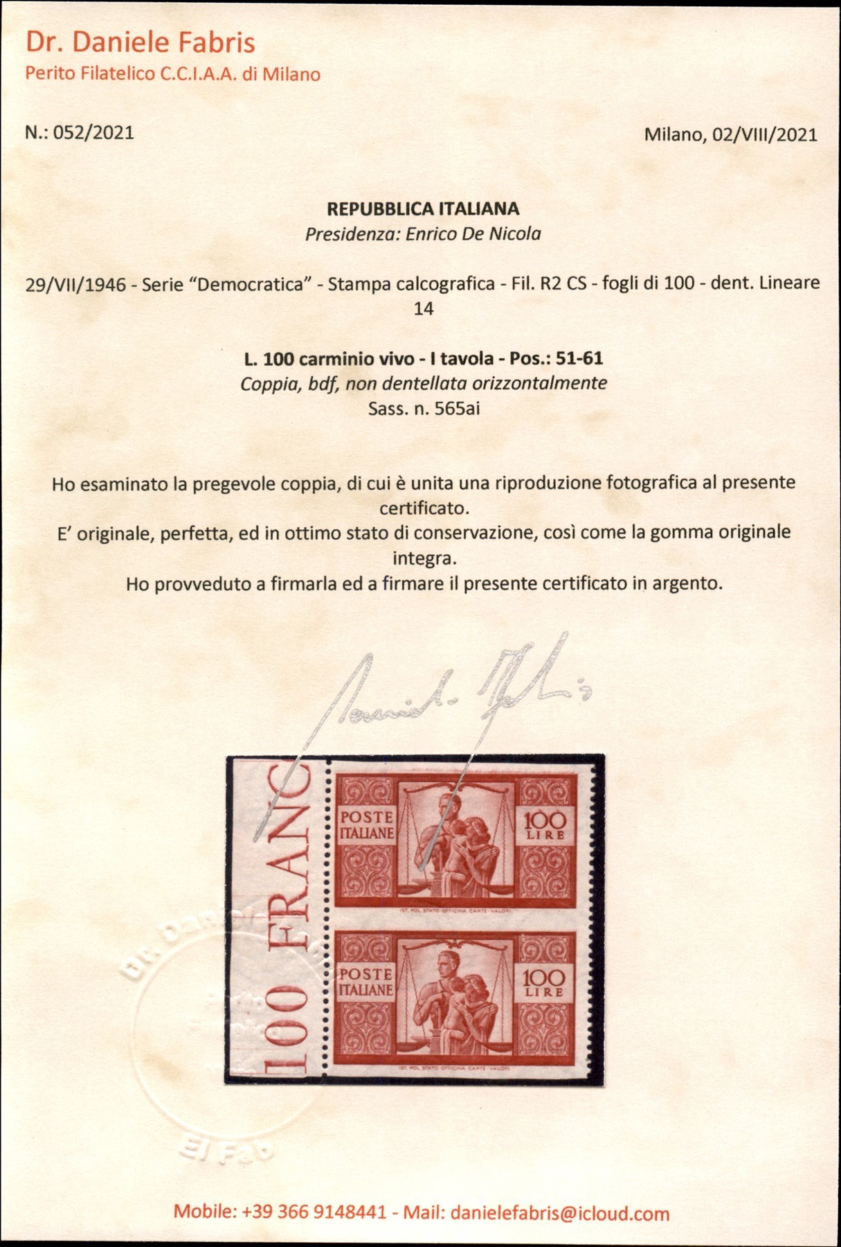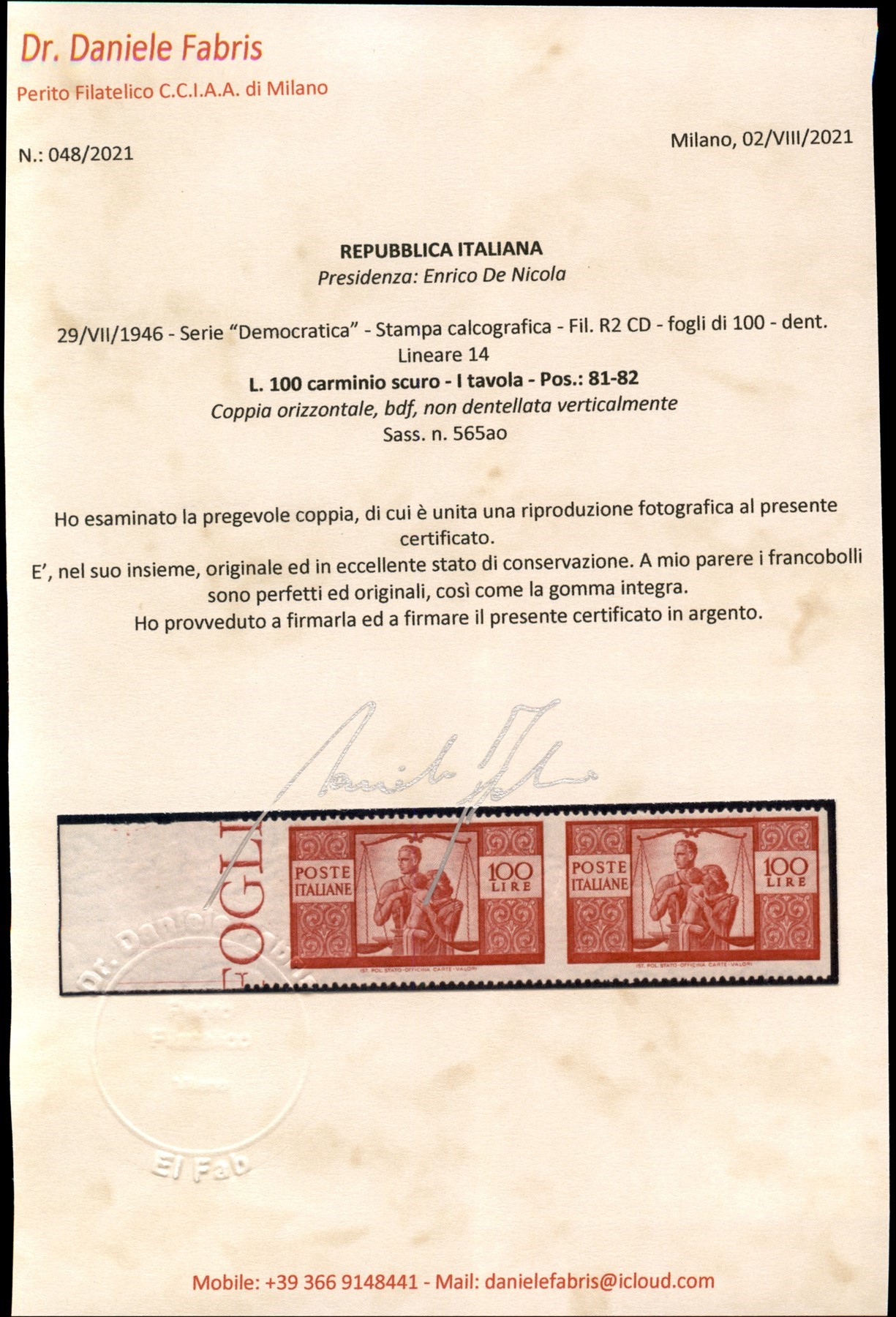 1946 - Coppia bordo foglio (Pos. 81/82) del 100 lire Democratica (565ao) non dentellata verticalmente - gomma integra - molto bella - Bolaffi + Diena + cert. Fabris (Image 1)
