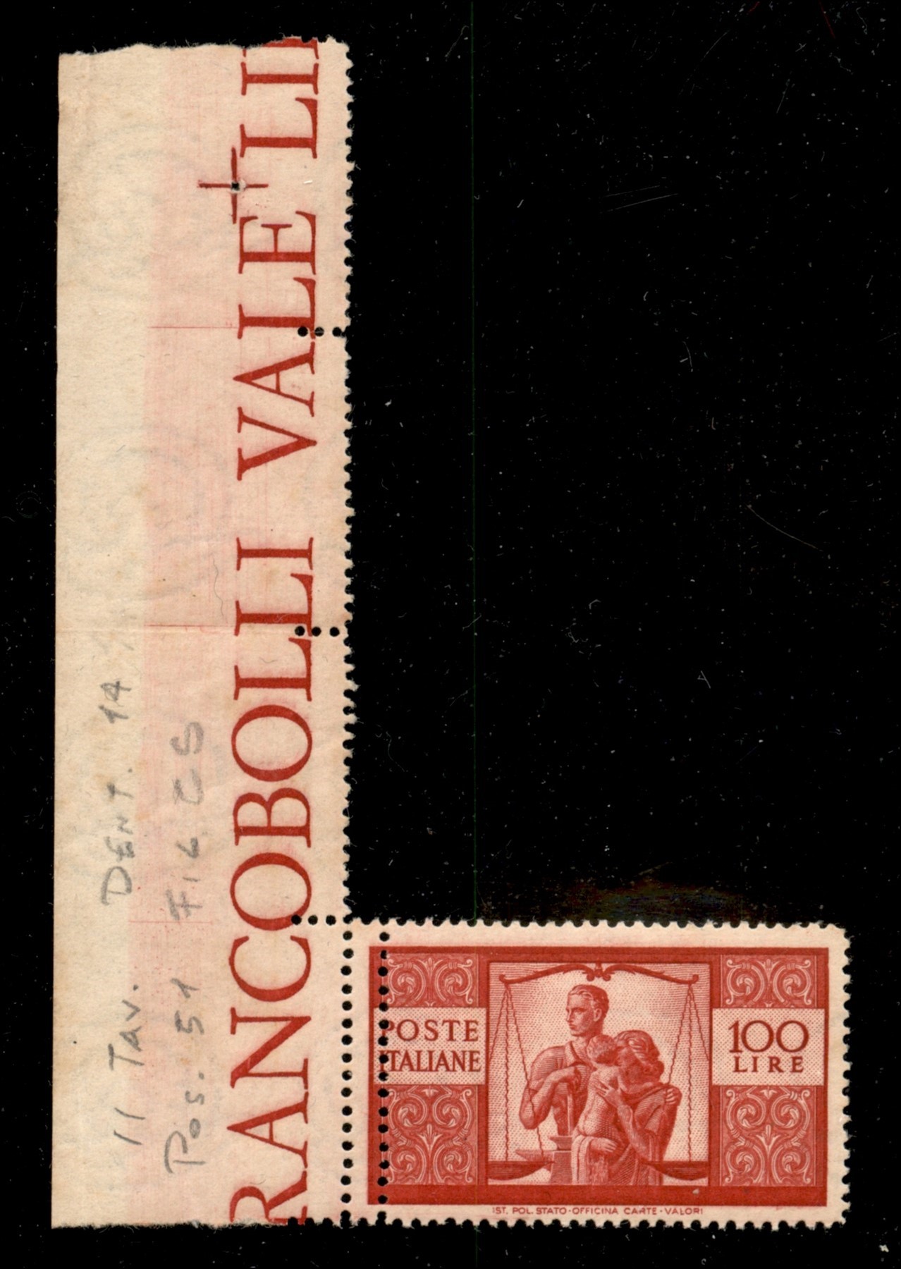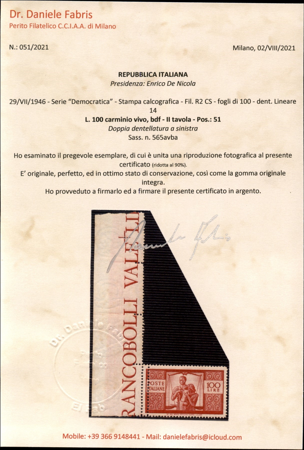 1946 - Bellissimo esemplare del 100 lire Democratica (565avba) con doppia dentellatura a sinistra e grande bordo di foglio - gomma integra - cert. Fabris (Image 1)