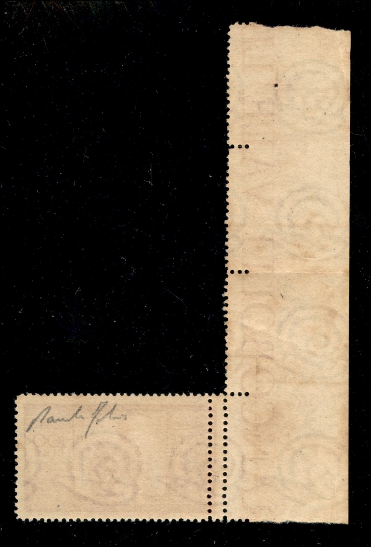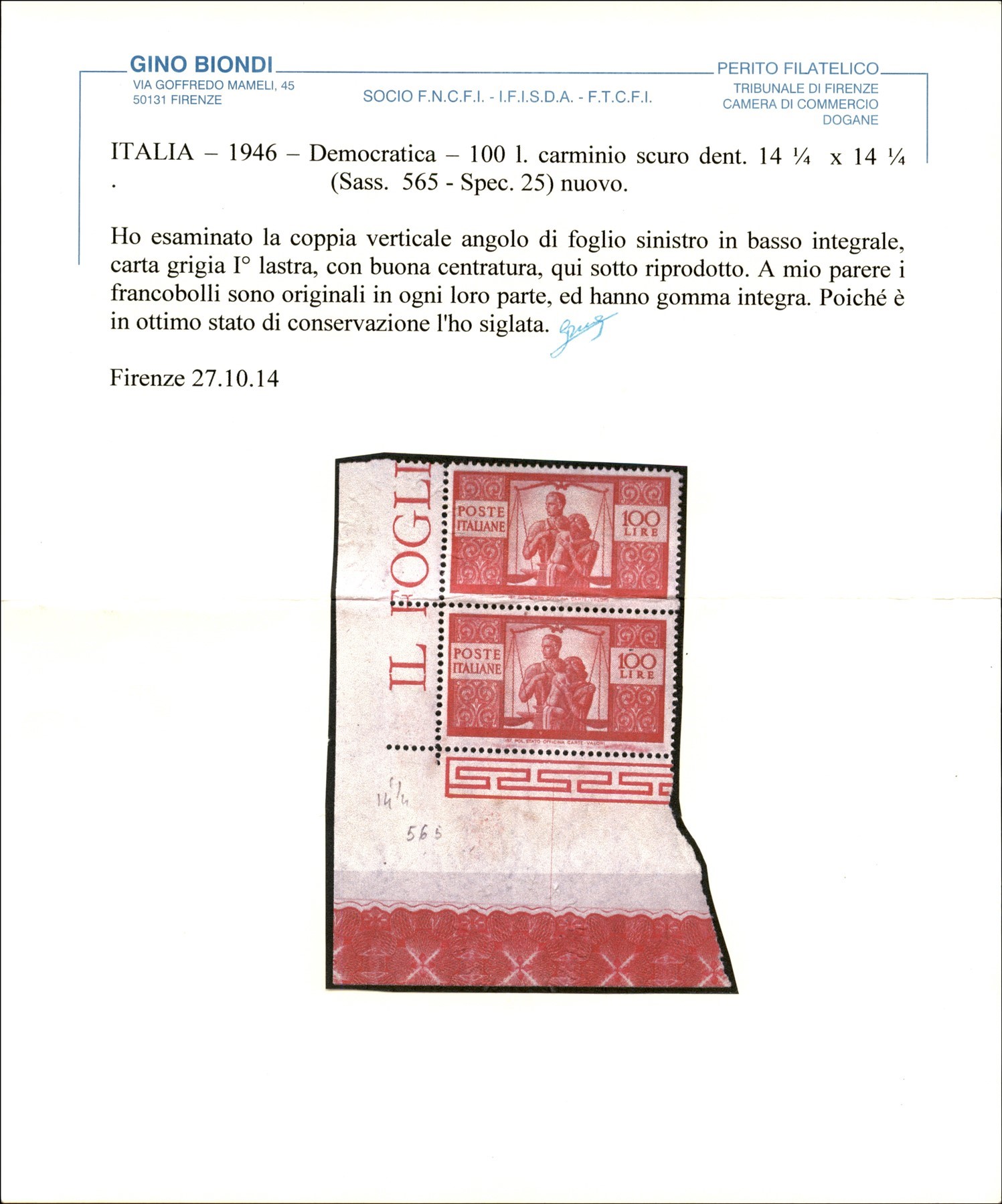 1946 - Coppia angolo di foglio del 100 lire Democratica (565) I lastra su carta grigia - gomma integra - molto bello - cert. Biondi (Image 1)