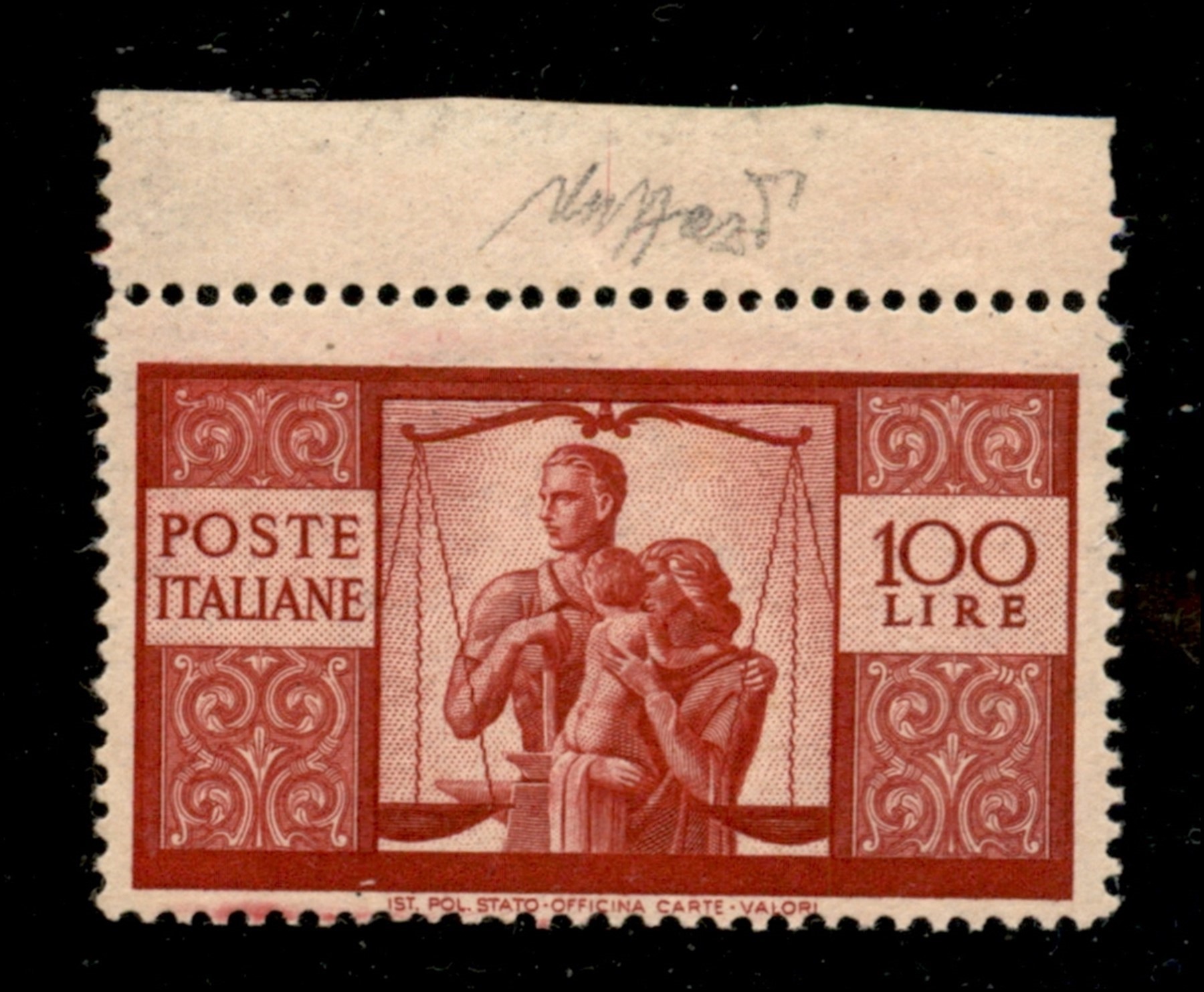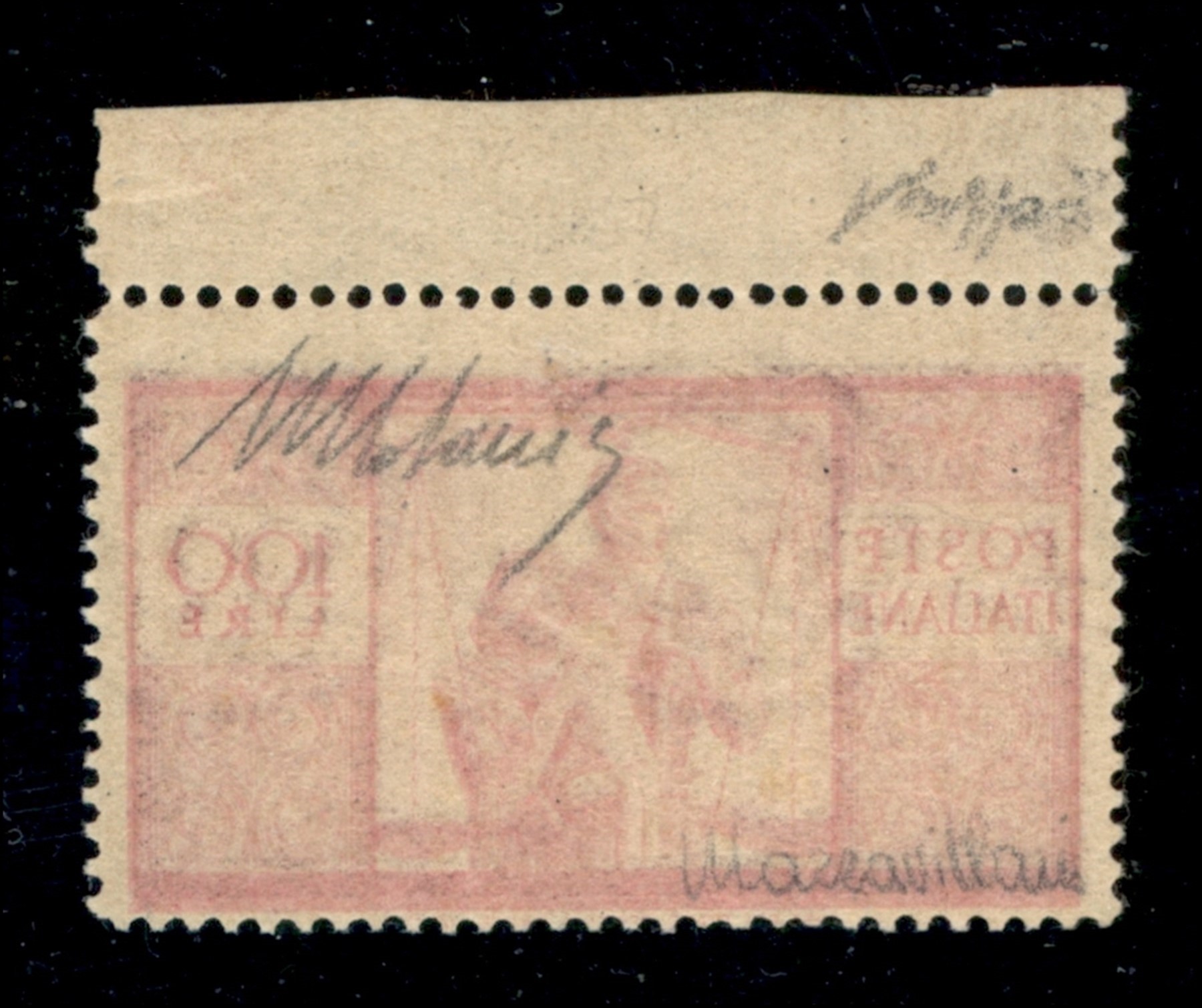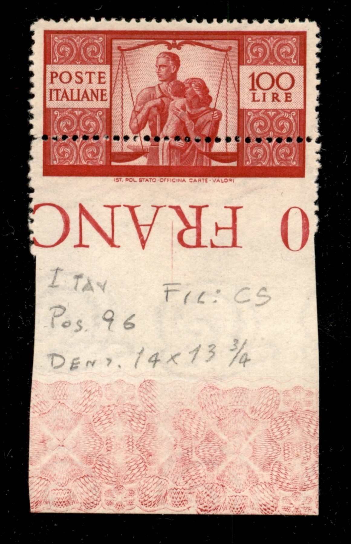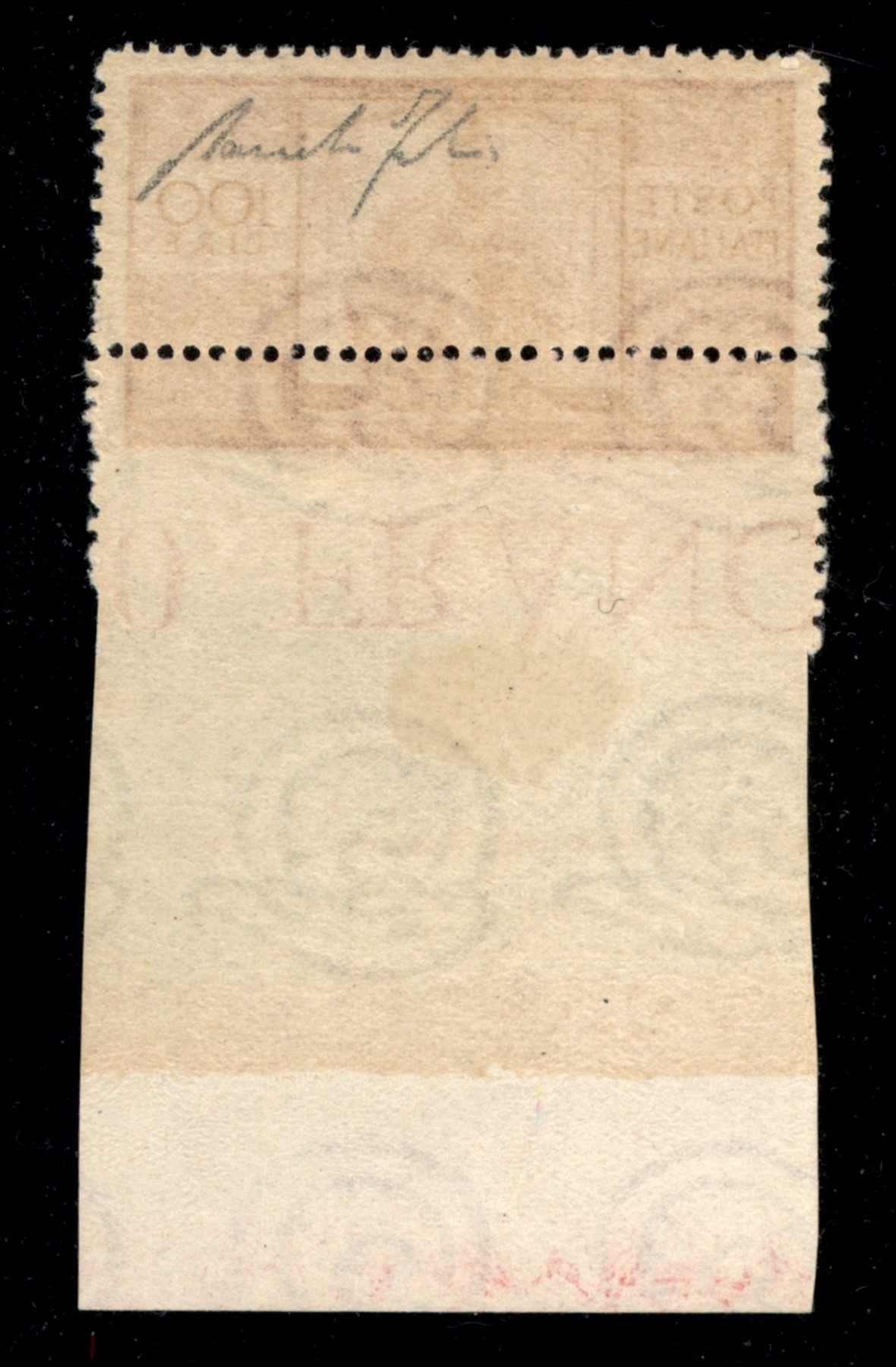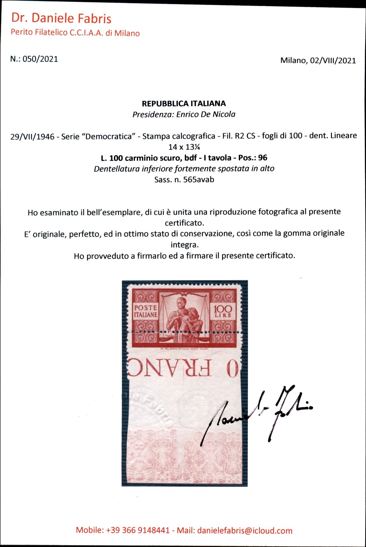 1946 - Esemplare bordo di foglio del 100 lire Democratica (565avab) con dentellatura inferiore fortemente spostata in alto - gomma integra - molto bello - cert. Fabris (Image 1)