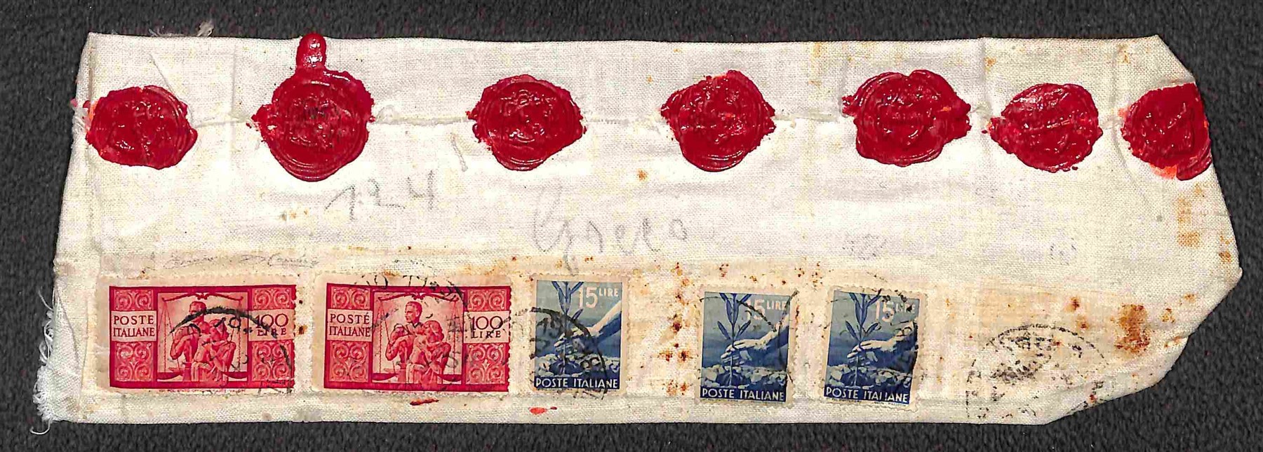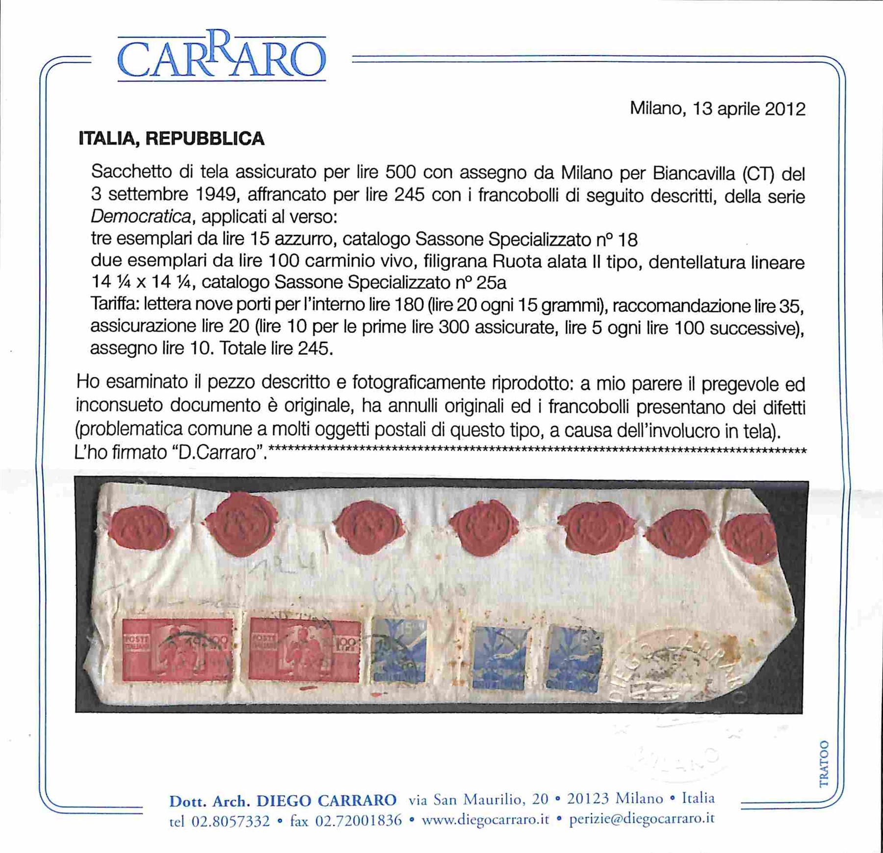 Sacchetto di tela assicurato per 500 lire con assegno e affrancato due 100 lire Democratica (565) + tre 15 lire (560) da Milano a Biancavilla del 3.9.49 - molto bello e inconsueto - cert. Carraro (Image 1)