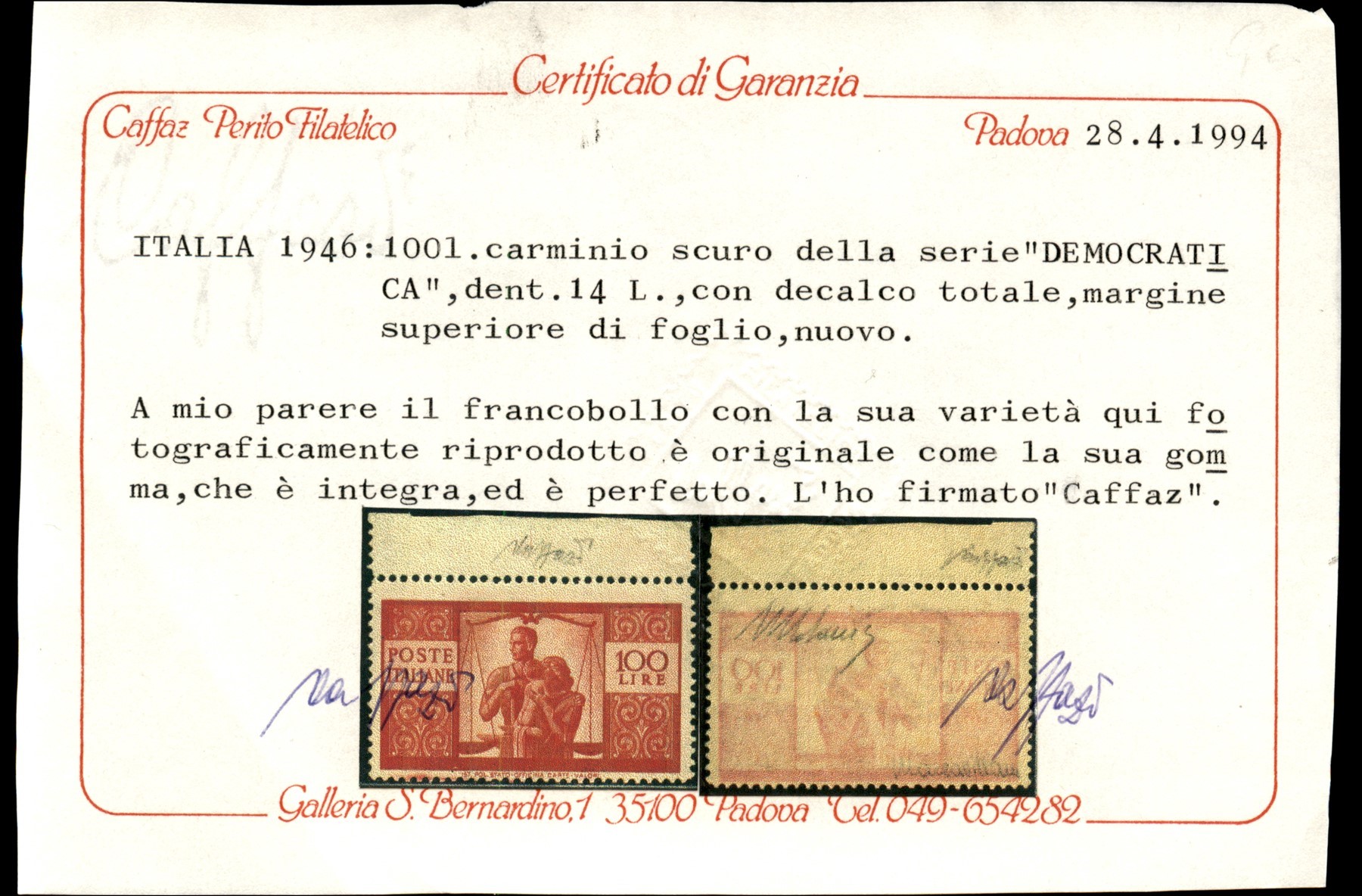 1946 - Esemplare bordo foglio del 100 lire Democratica (565z) con decalco - gomma integra - cert. Caffaz (Image 1)