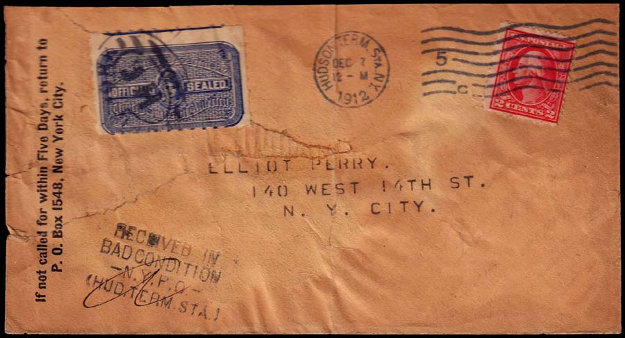 2246 O image(OX14) On damaged cover to N.Y. City to famous stamp collector "Elliot Perry", HC, "Received in Bad Condition" handstamp, VG-F, a most unusual cover.