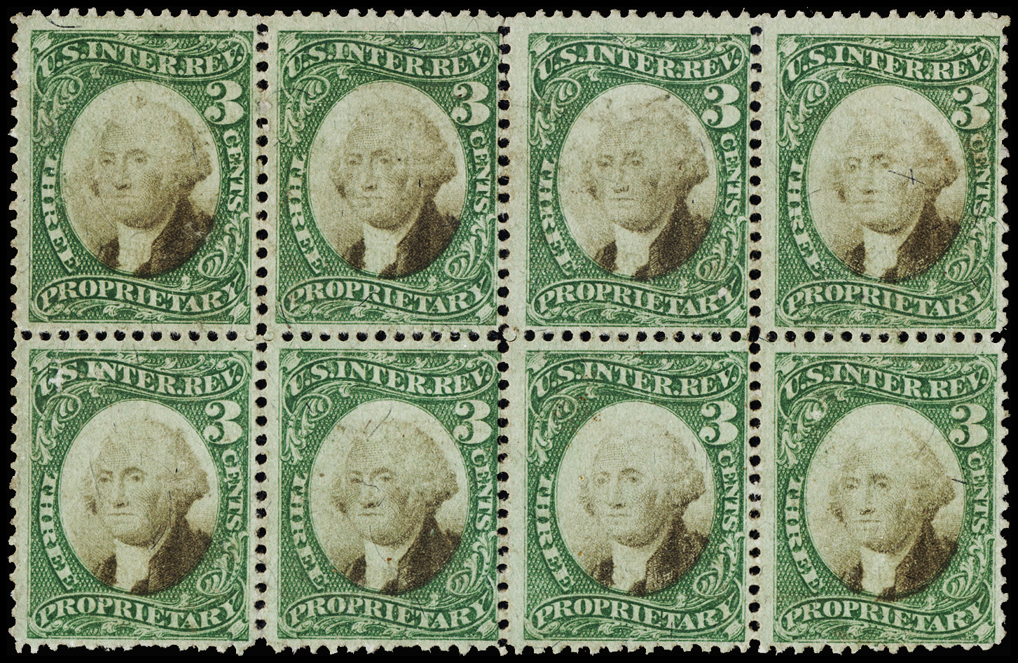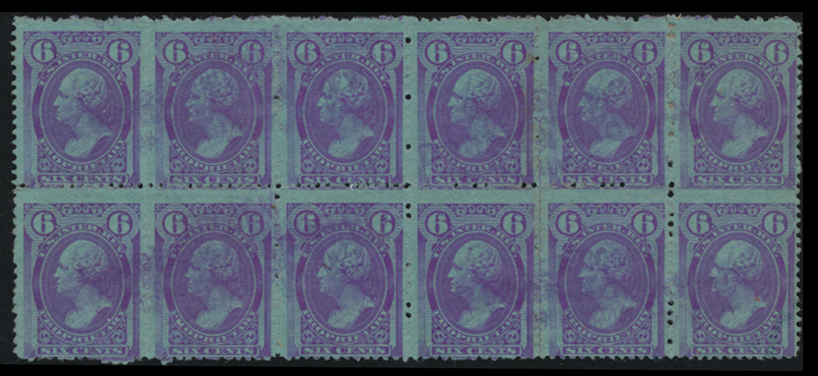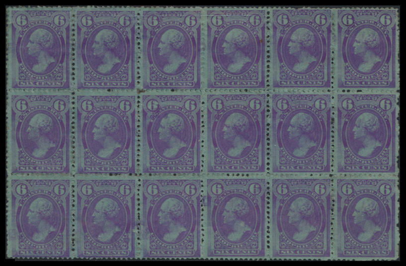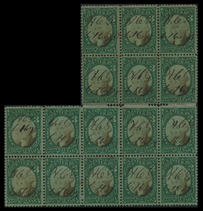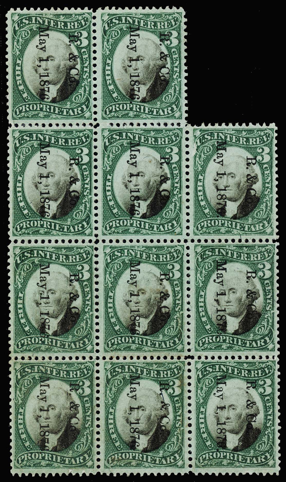 4032 O[] image(RB3b) BL/11, PC, "R. & Co. May 1, 1876", sm. thin on one stamp, deep dark color, fresh and F-VF, a extremely rare multiple with a printed cancel.