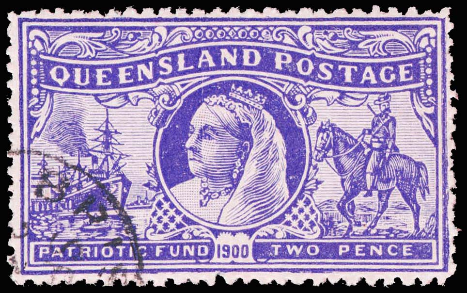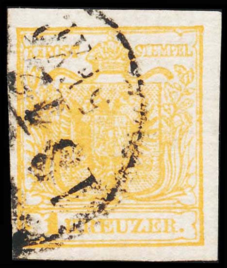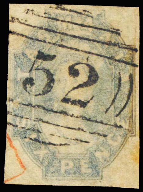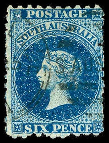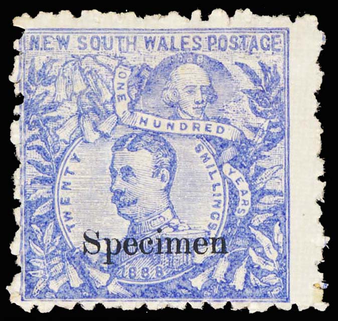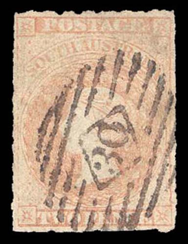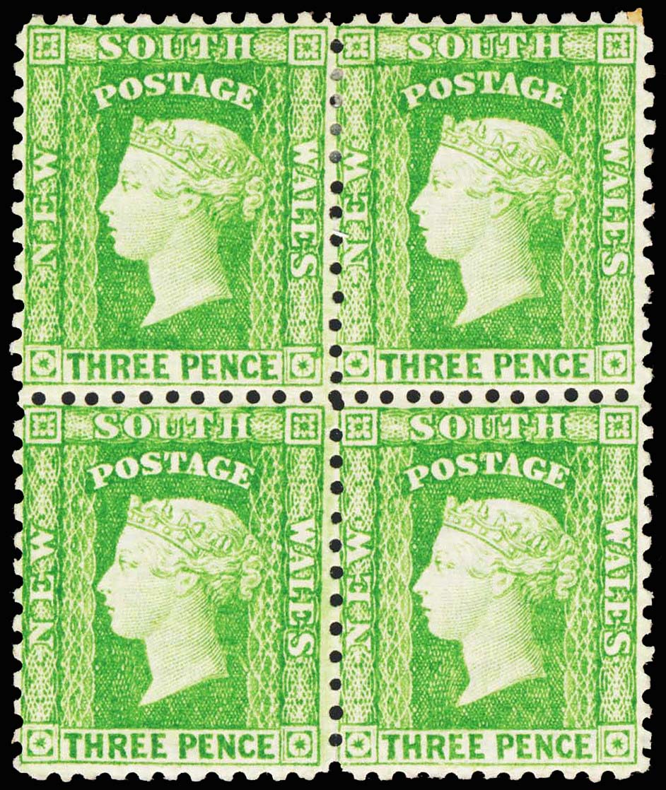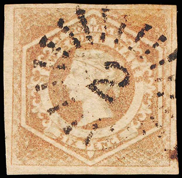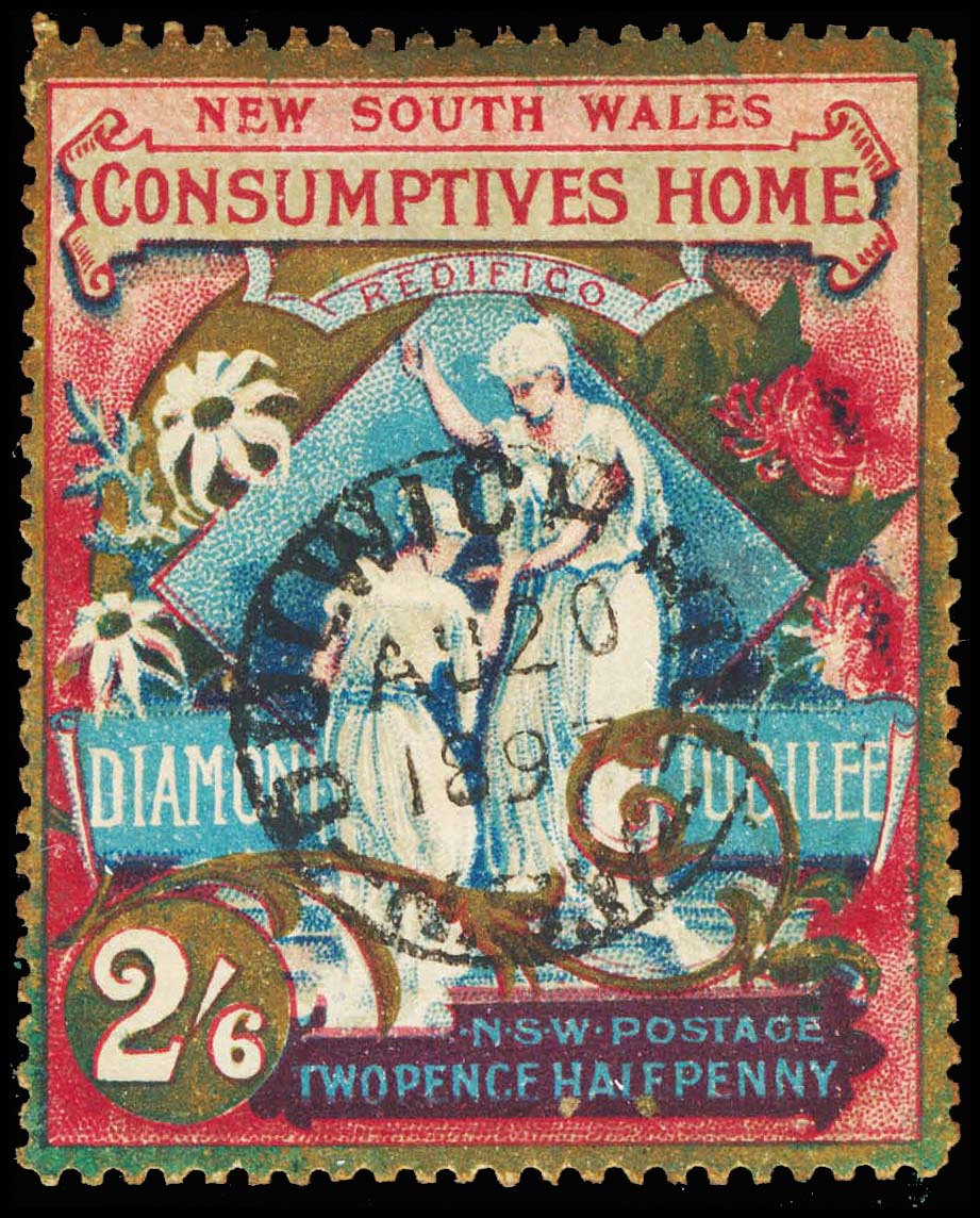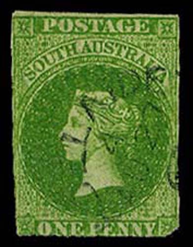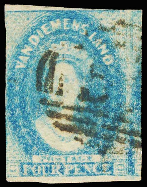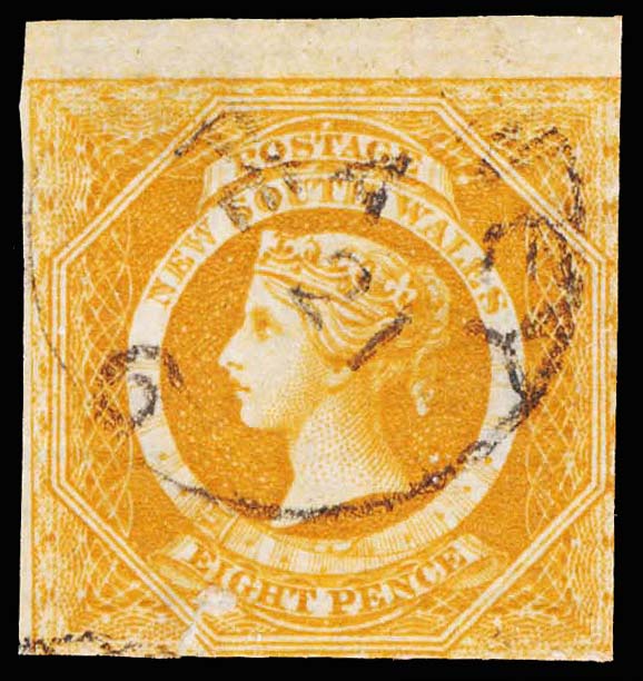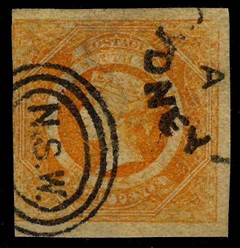 5462 O image(30) Neat HC's with both "N.S.W." and "Sydney" cancels, amazing deep dark color, three large margins and just in at L., VG-F appearing example of this scarce stamp.