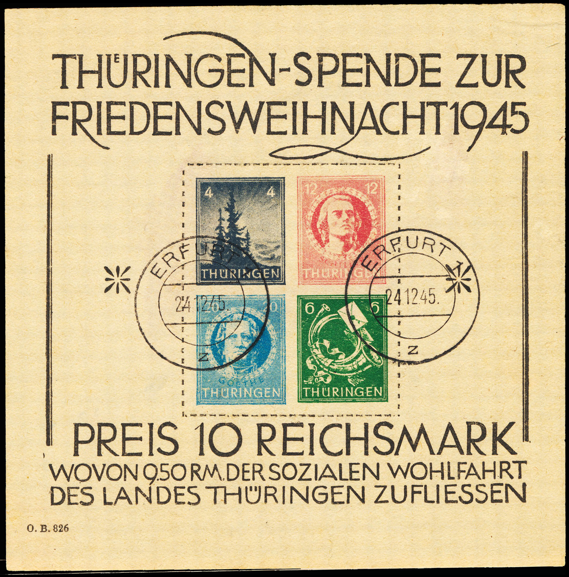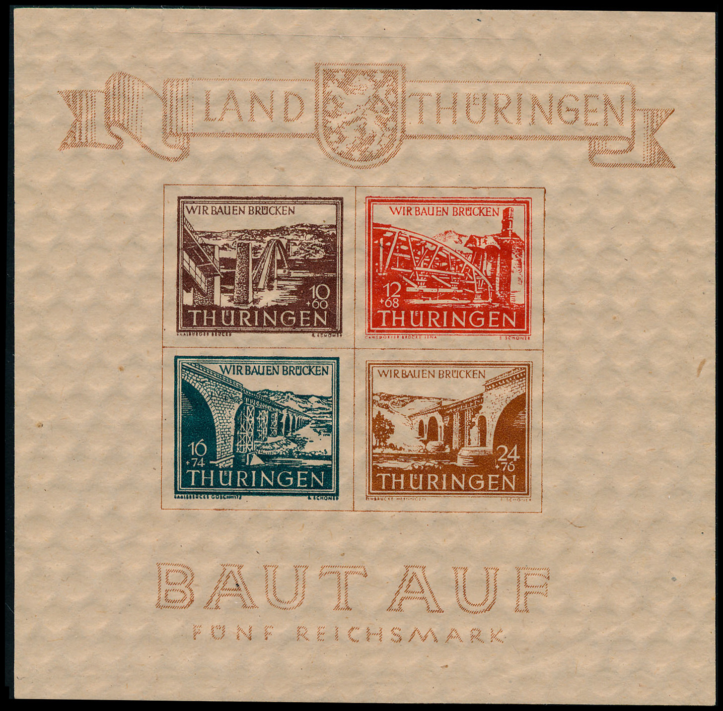 6076 O image(16N7b) 1945 Thuringen-Spende Zur, S/S of Four, SON HC's, tiny margin tear, light wrinkle, Very Fine+ appearance, a very scarce used souvenir sheet.