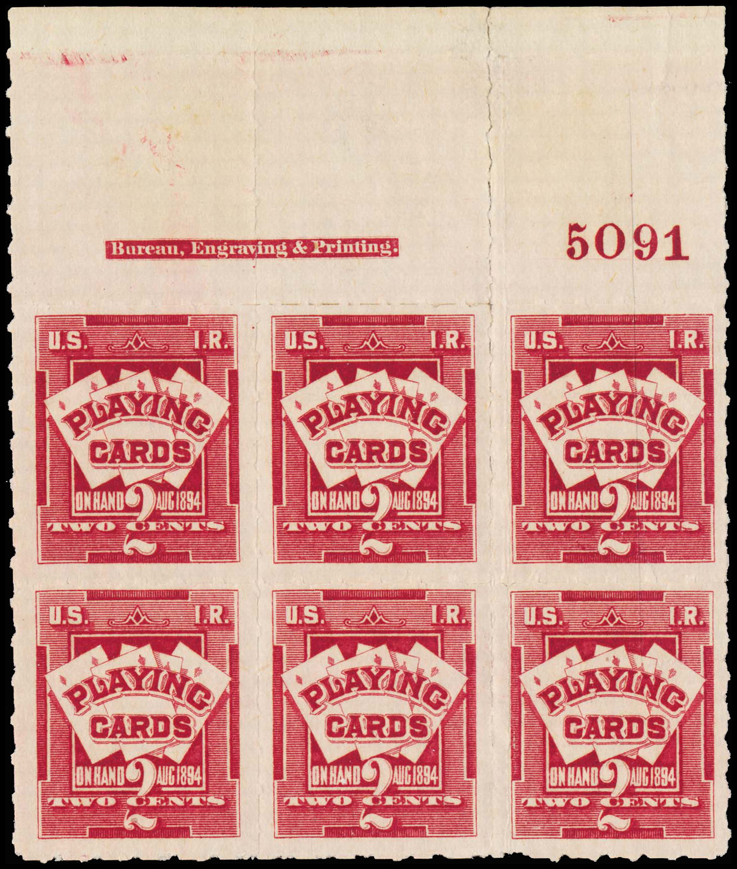 1721 og image(RE31) T. Pl. #3503 Block of Six, OG, NH, wonderful deep dark color, quite fresh and Very Good to Fine, this issue only exists off-center with most singles being cut into the design, this plate block is exceptionally rare and it is only the second example we are aware of, the catalog value listed is for six singles, a most unusal item.