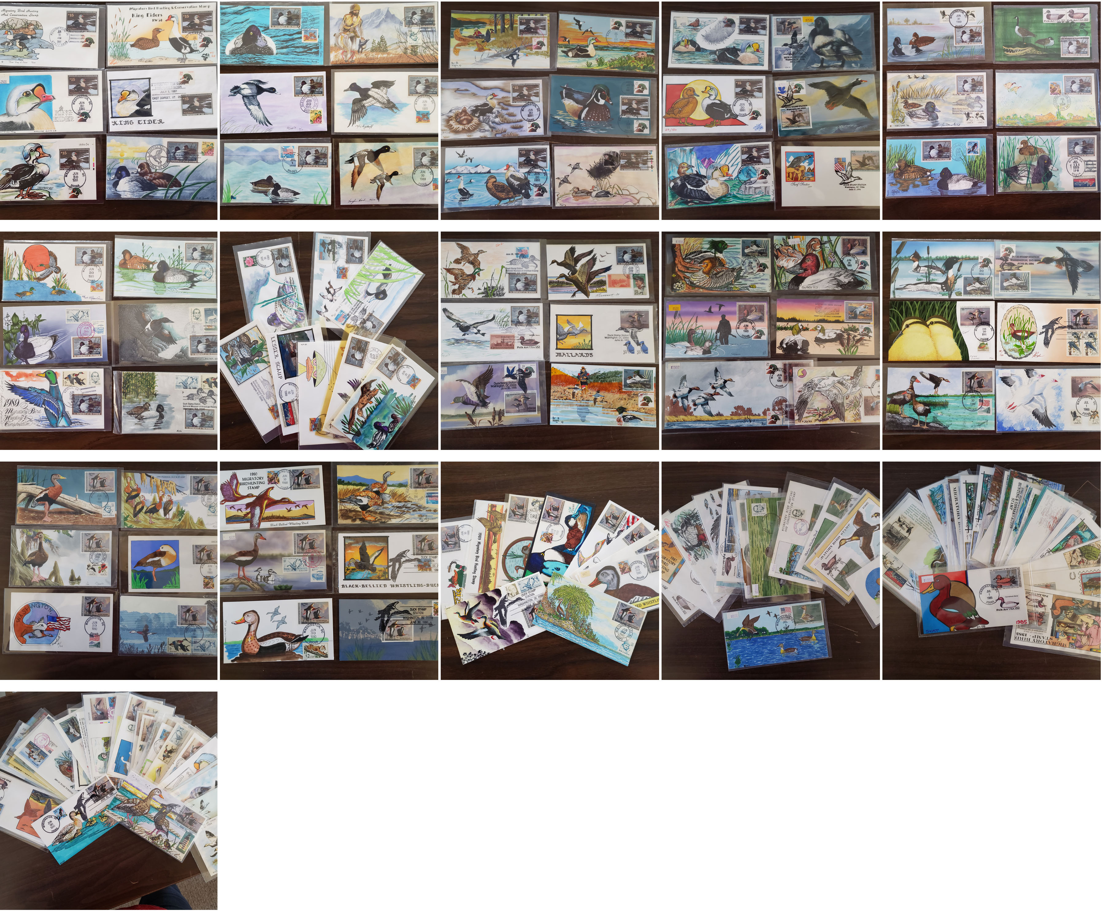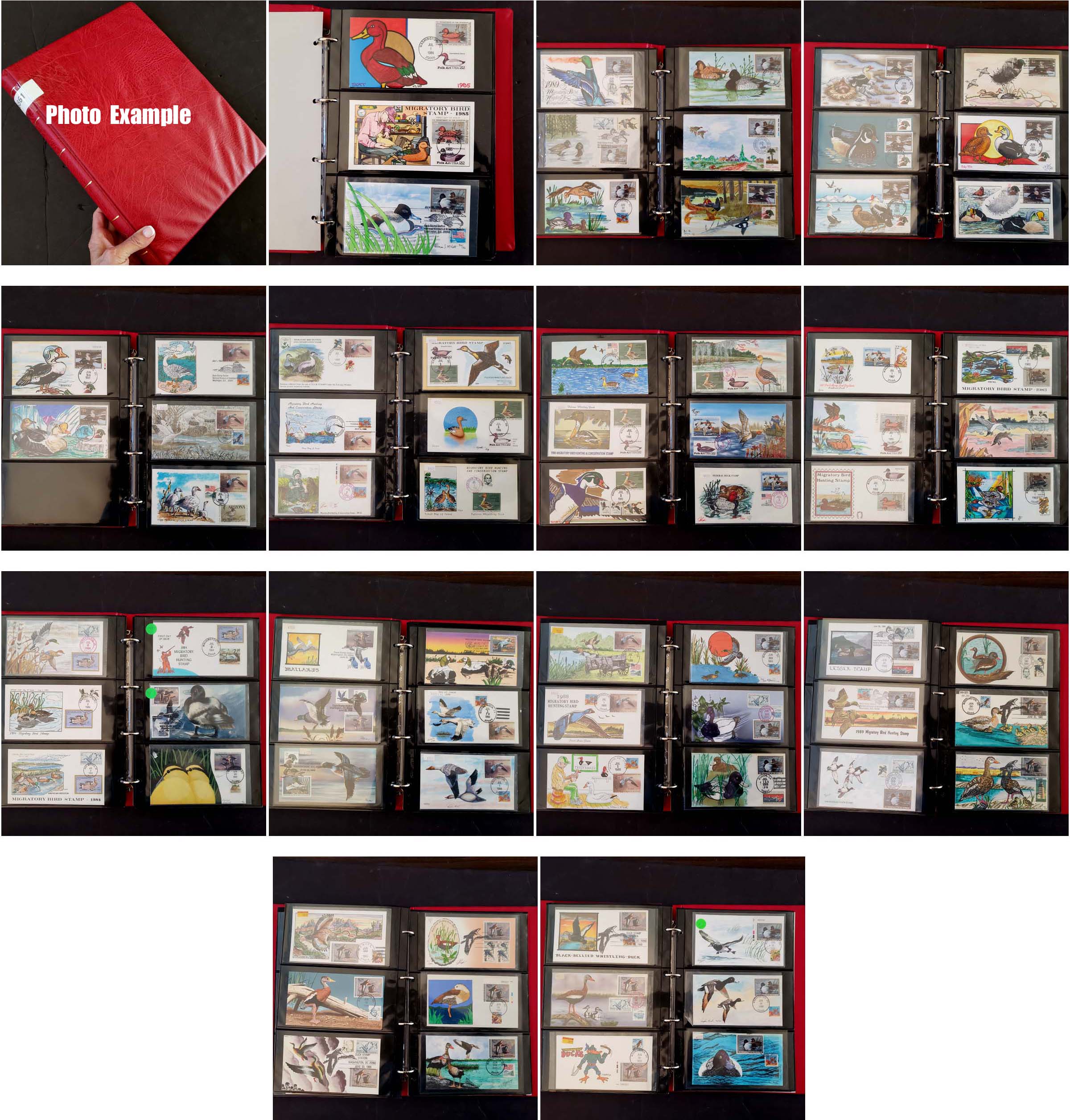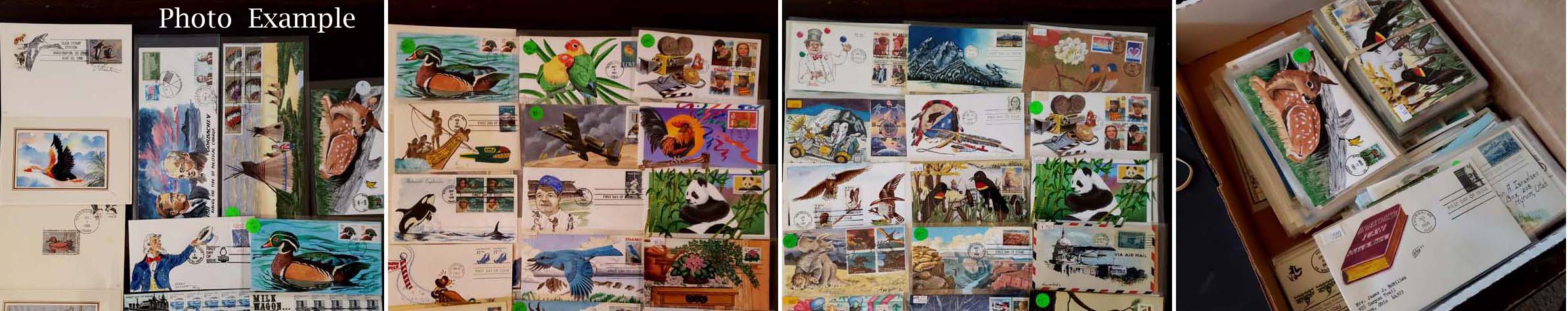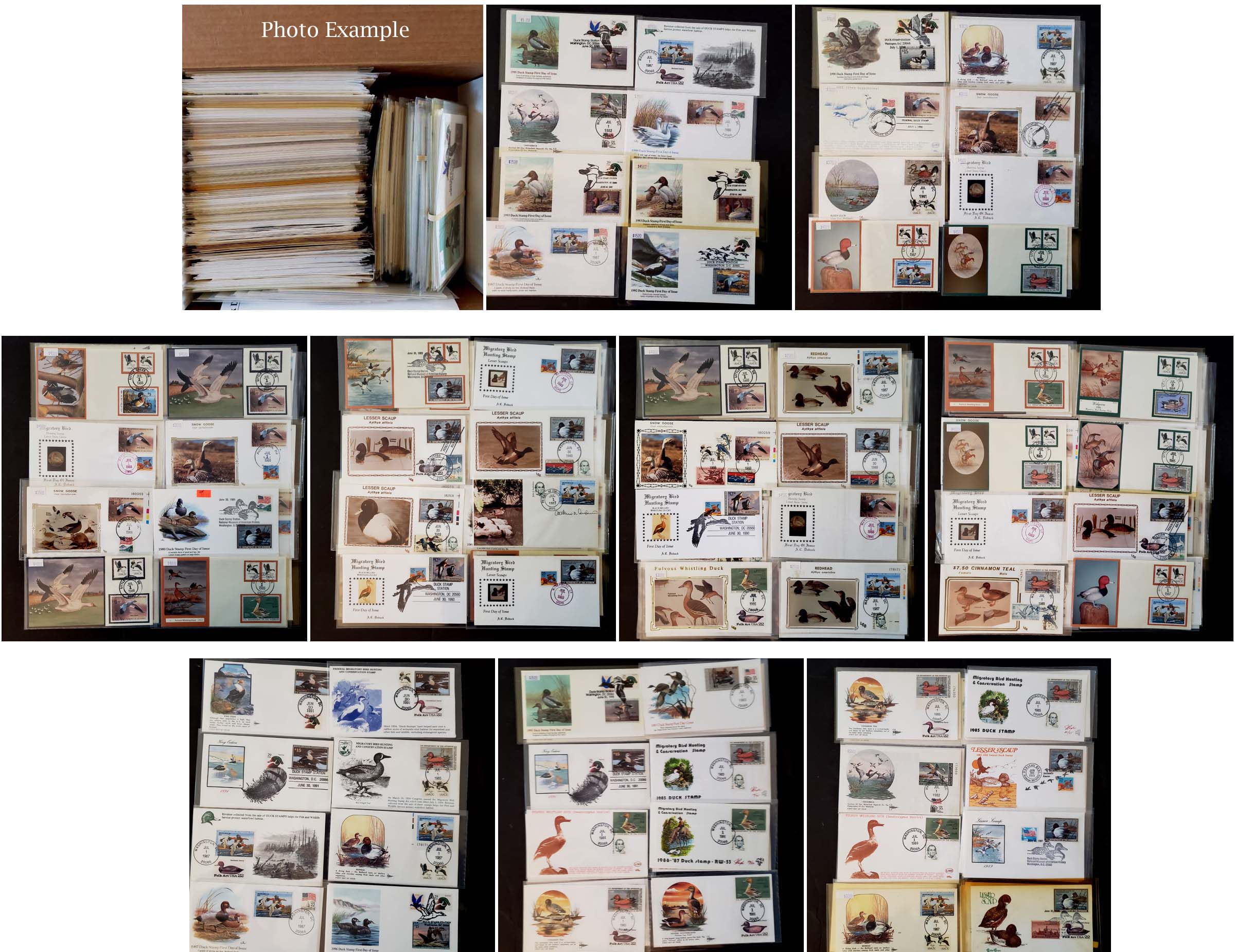 4 imageEXTENSIVE HANDPAINTED FEDERAL DUCK STAMP FIRST DAY COVER COLLECTION , this amazing collection of 166 DIFFERENT handpainted FDC's features dozens of different designers and a range of years from 1983 to 1999, this collection is similar to the much large one offered elsewhere in this section but all the lots in this group are in the larger collection, mostly loose in a box but virtually all are in plastic or poly sleeves, the overall condition is very, very nice with maybe only a few scattered faults, the collection by years include of all different artists: 1983(4 Different), 1984(11), 1985(14), 1986(10), 1987(16), 1988(20), 1989(34), 1990(26), 1991(14), 1992(1), 1993(3), 1994(6), 1995(4), 1996(2), 1999(1); please note that some artists had different designs for the same years, the general retail on Duck FDC's is in the $20-30 range but for handpainted covers the retail value jumps up to the $50-75 range depending on the artist, many scarcer covers retail in the $100-300 range, a truly amazing group of covers not to mention the stunning multi-colored designs and unique artwork attributed to the dozens of artists who worked on this are over the years, we have scanned a number of covers but seeing this massive collection in person is an incredible treat, our estimate of the retail value of this collection is easily in the $10,000-15,000 range and just the time and expensive of seeking out these covers over many years would cost thousands of dollars in time and expense.