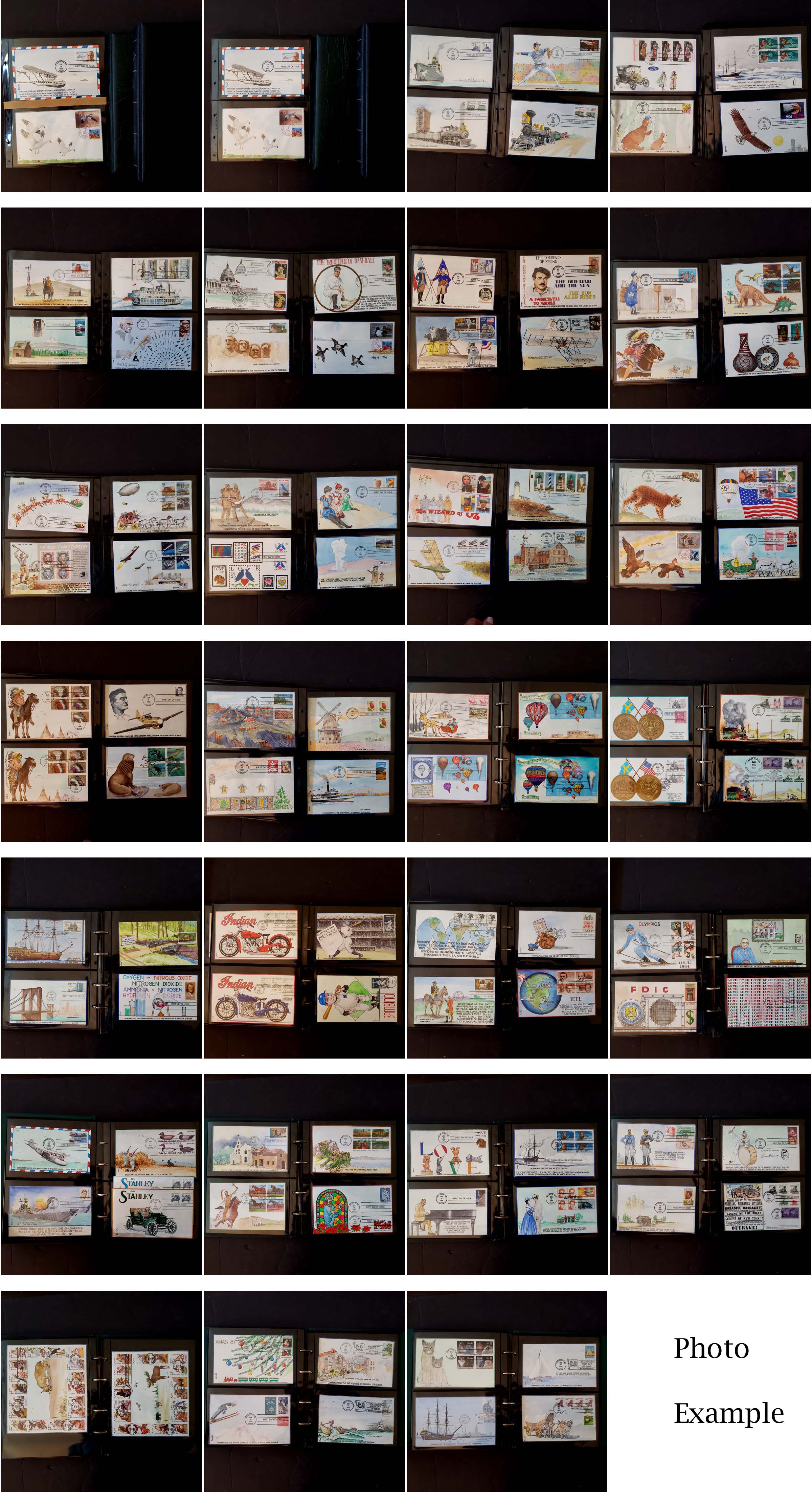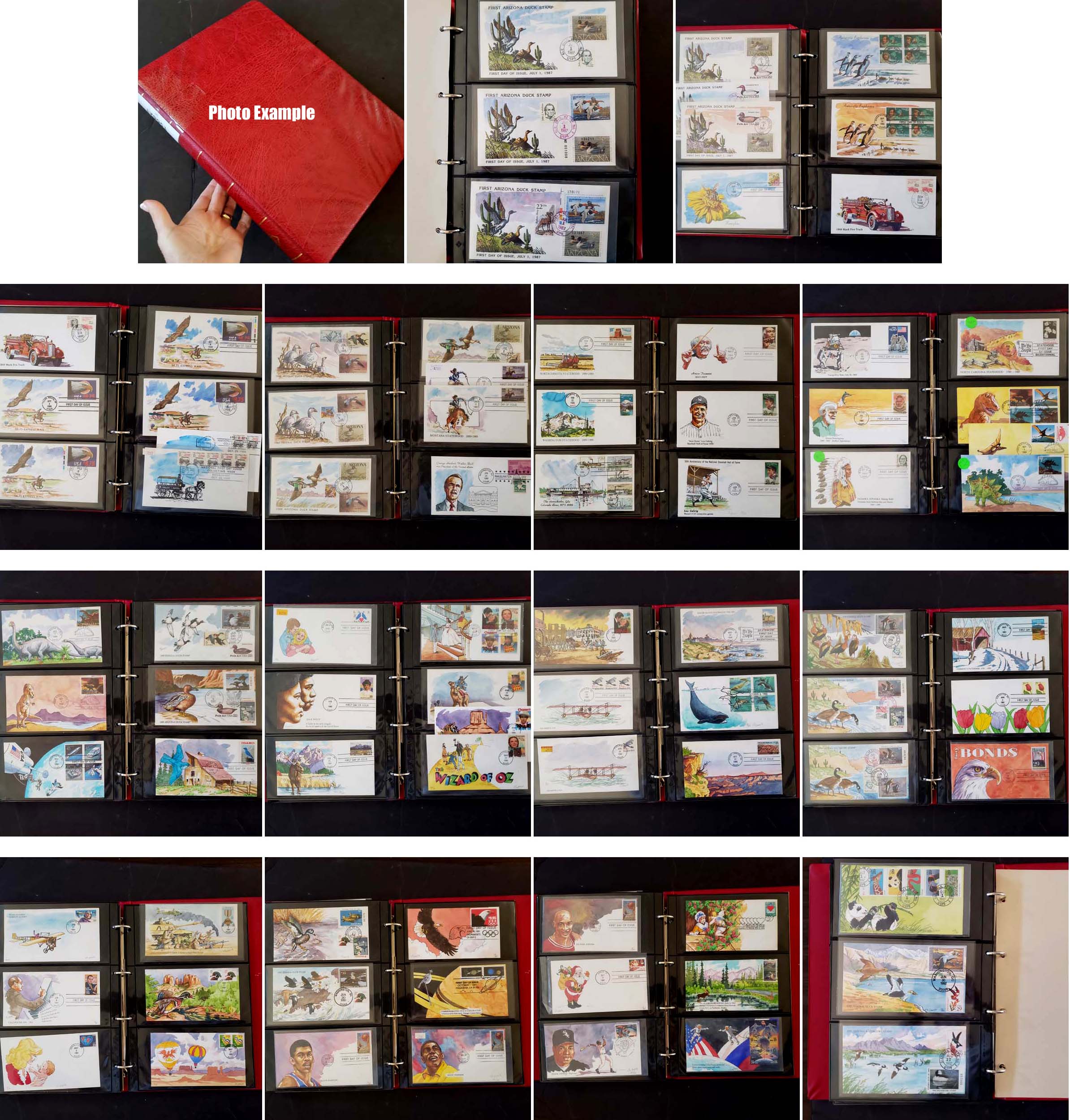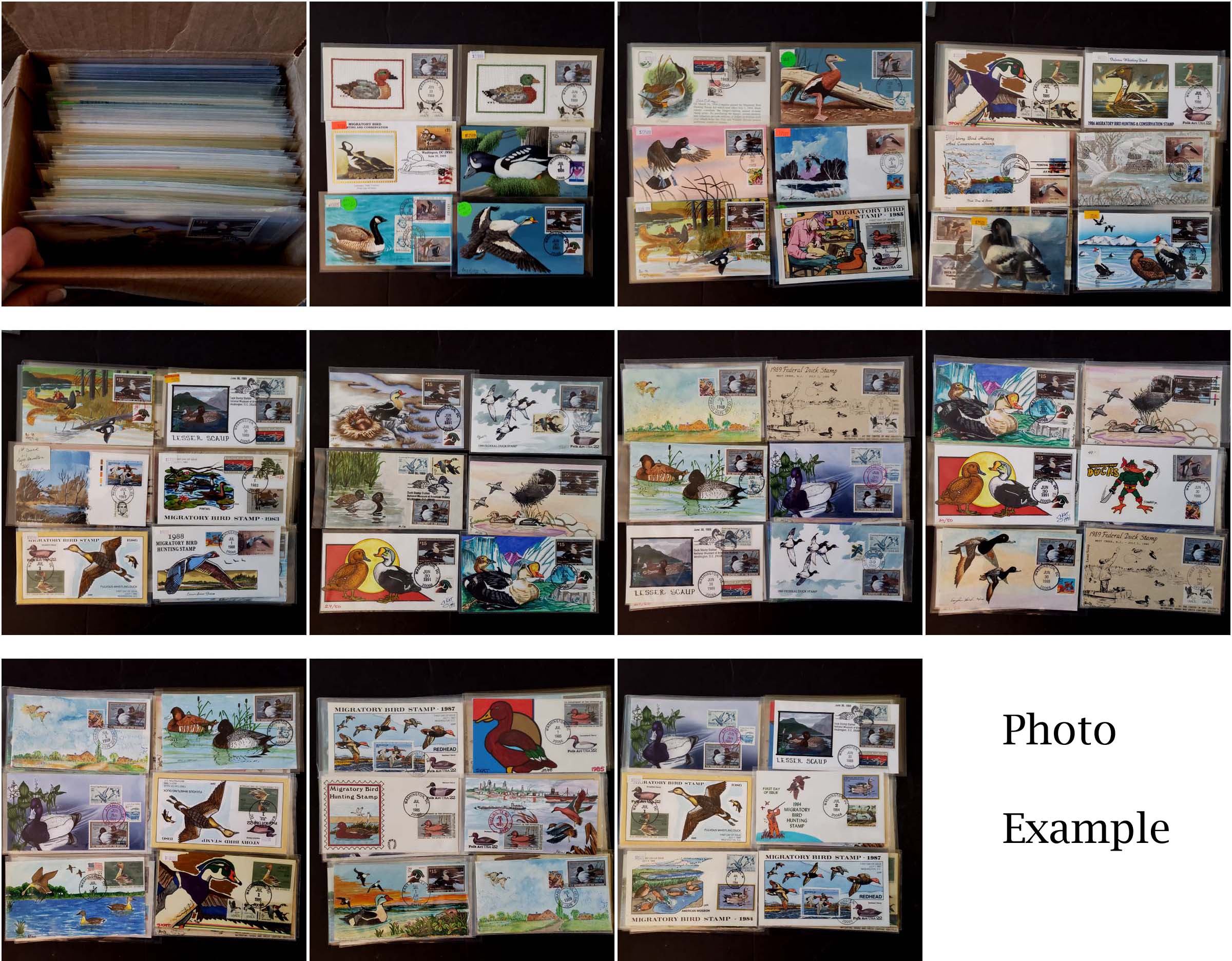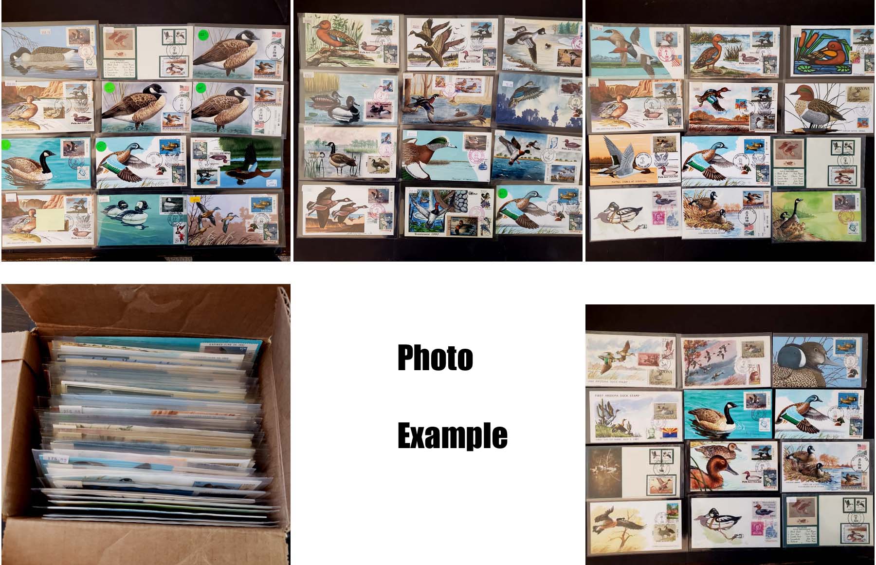 4 imageEXTENSIVE HANDPAINTED FEDERAL DUCK STAMP FIRST DAY COVER COLLECTION , this amazing collection of 166 DIFFERENT handpainted FDC's features dozens of different designers and a range of years from 1983 to 1999, this collection is similar to the much large one offered elsewhere in this section but all the lots in this group are in the larger collection, mostly loose in a box but virtually all are in plastic or poly sleeves, the overall condition is very, very nice with maybe only a few scattered faults, the collection by years include of all different artists: 1983(4 Different), 1984(11), 1985(14), 1986(10), 1987(16), 1988(20), 1989(34), 1990(26), 1991(14), 1992(1), 1993(3), 1994(6), 1995(4), 1996(2), 1999(1); please note that some artists had different designs for the same years, the general retail on Duck FDC's is in the $20-30 range but for handpainted covers the retail value jumps up to the $50-75 range depending on the artist, many scarcer covers retail in the $100-300 range, a truly amazing group of covers not to mention the stunning multi-colored designs and unique artwork attributed to the dozens of artists who worked on this are over the years, we have scanned a number of covers but seeing this massive collection in person is an incredible treat, our estimate of the retail value of this collection is easily in the $10,000-15,000 range and just the time and expensive of seeking out these covers over many years would cost thousands of dollars in time and expense.