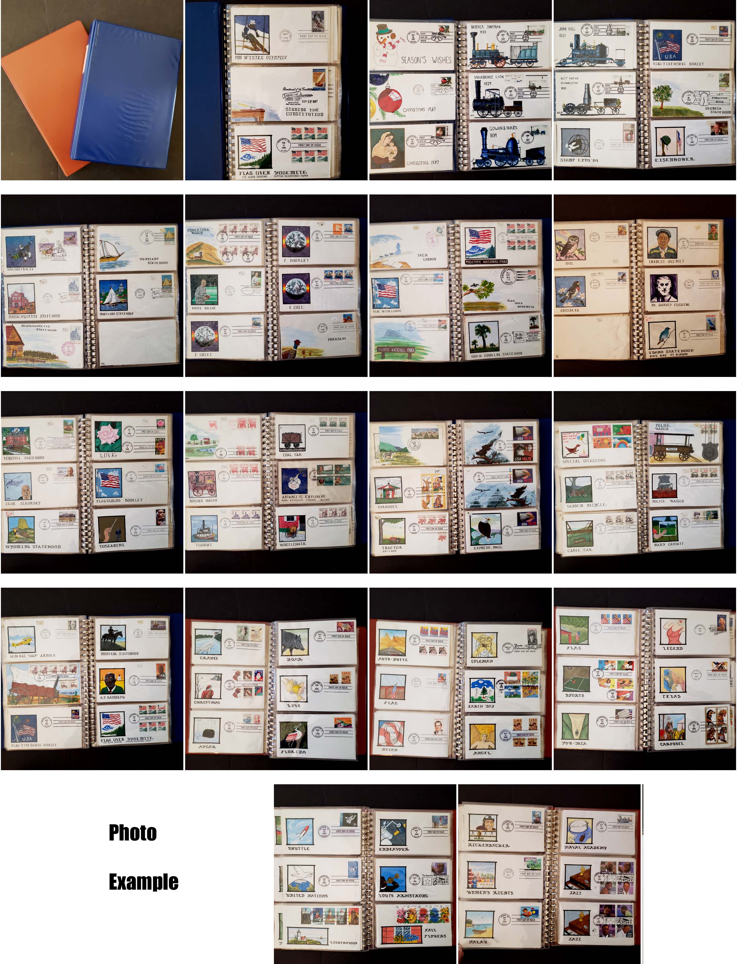 14 imageKAH HANDPAINTED FIRST DAY COVER COLLECTION, includes 155 different handpainted covers, all are Kah designs, runs from 1987 to 1990 and then 1994 to 1996, this is a fairly complete collection of all the Kah covers made, all are multicolored, includes four Express Mail issues, all in choice condition contained in two cover albums, most of these covers retail in the $75-125 range but the early covers often sell in the $100-150 range, includes the 1987 Train set of which only one set was done, a very difficult set to assemble with this many different, approximate total retail value is nearly $5,000.00.